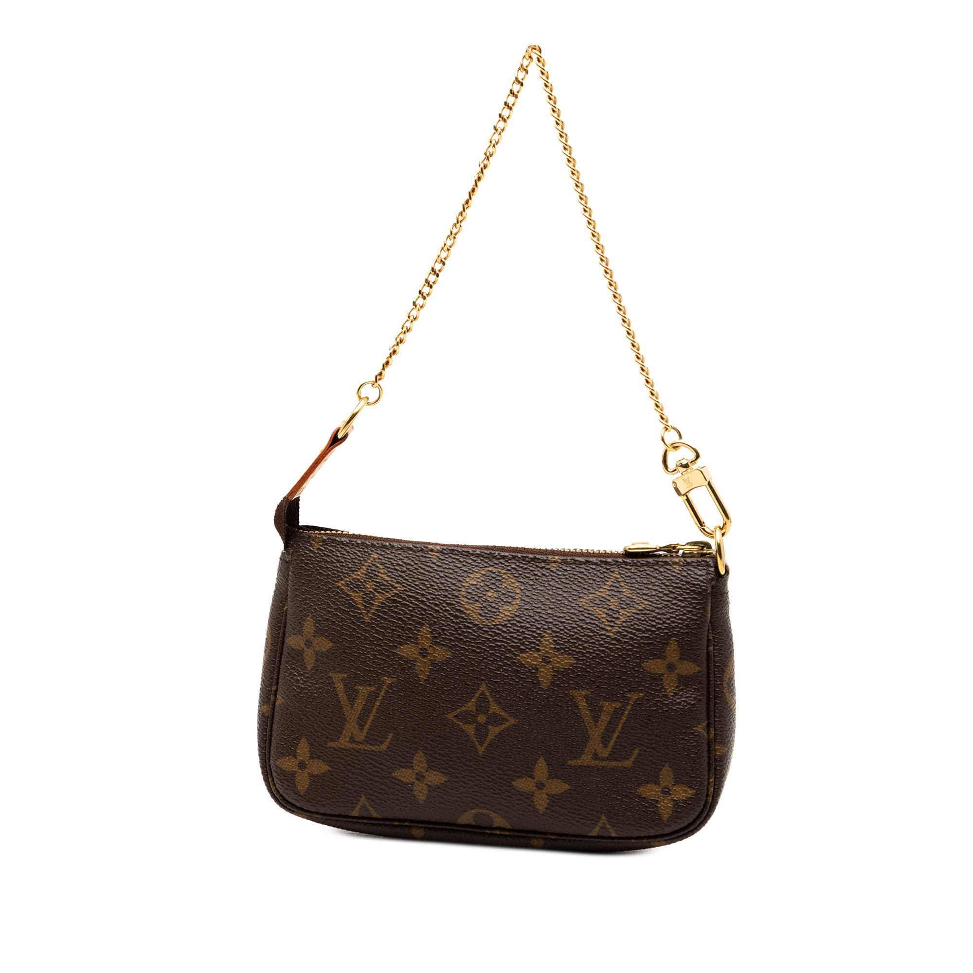 The Mini Pochette Accessoires features a monogram canvas body, a gold-tone chain strap, and a top zip closure. Retail Price: 868.00