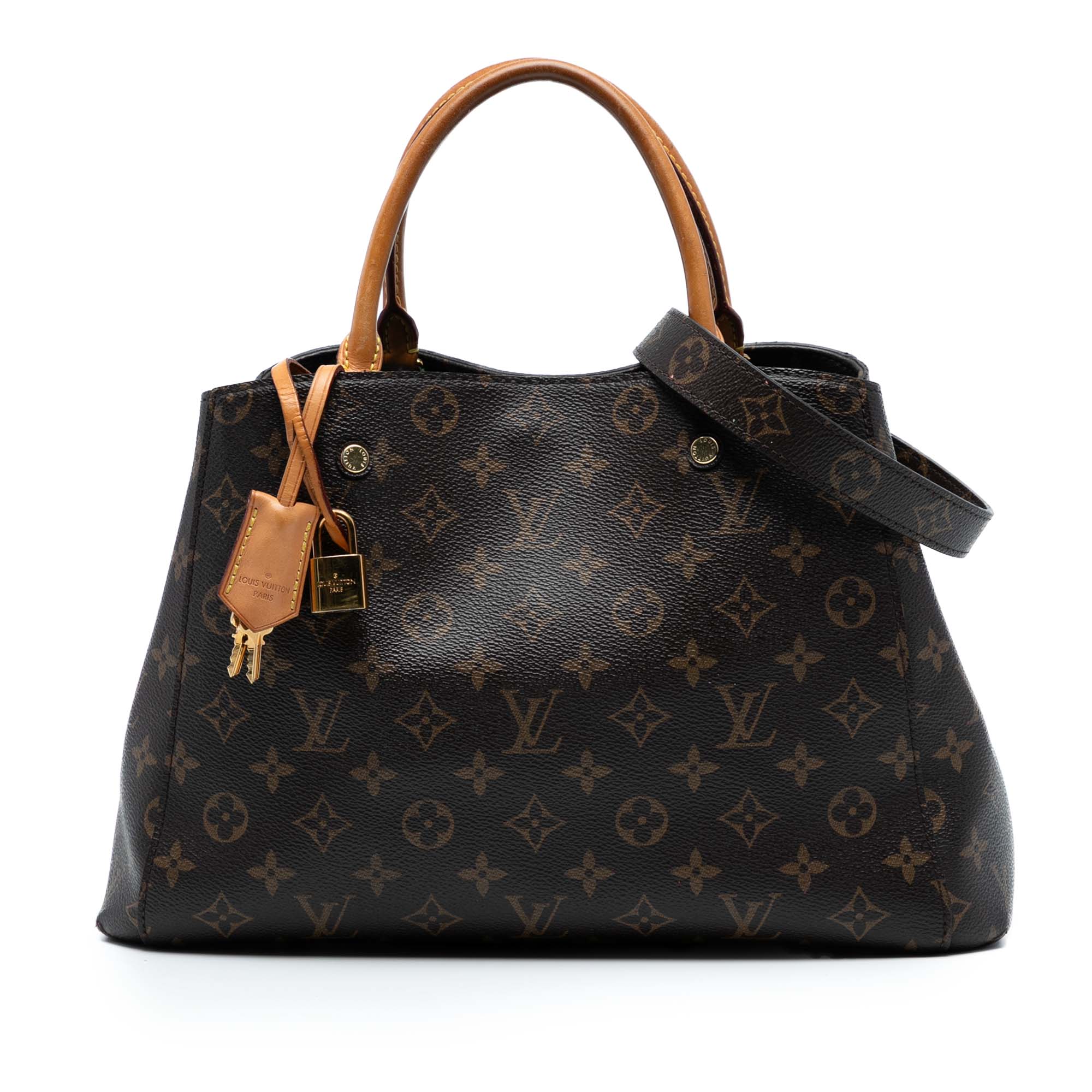 The Montaigne MM features a monogram canvas body, a clochette, rolled vachetta leather top handles, a detachable shoulder strap, an open top with clasp closure, an interior zip compartment, and interior slip pockets. Retail Price: 2593.00