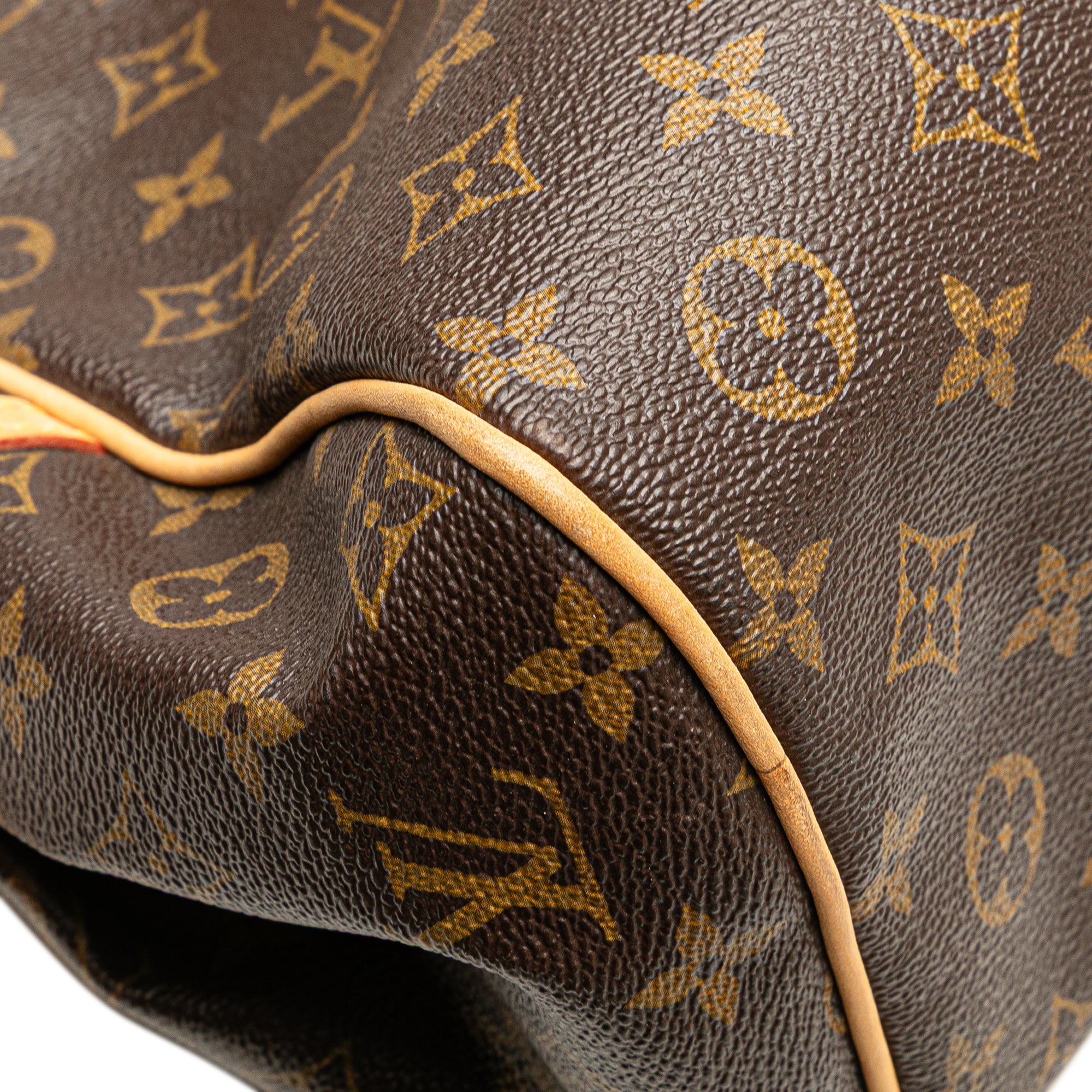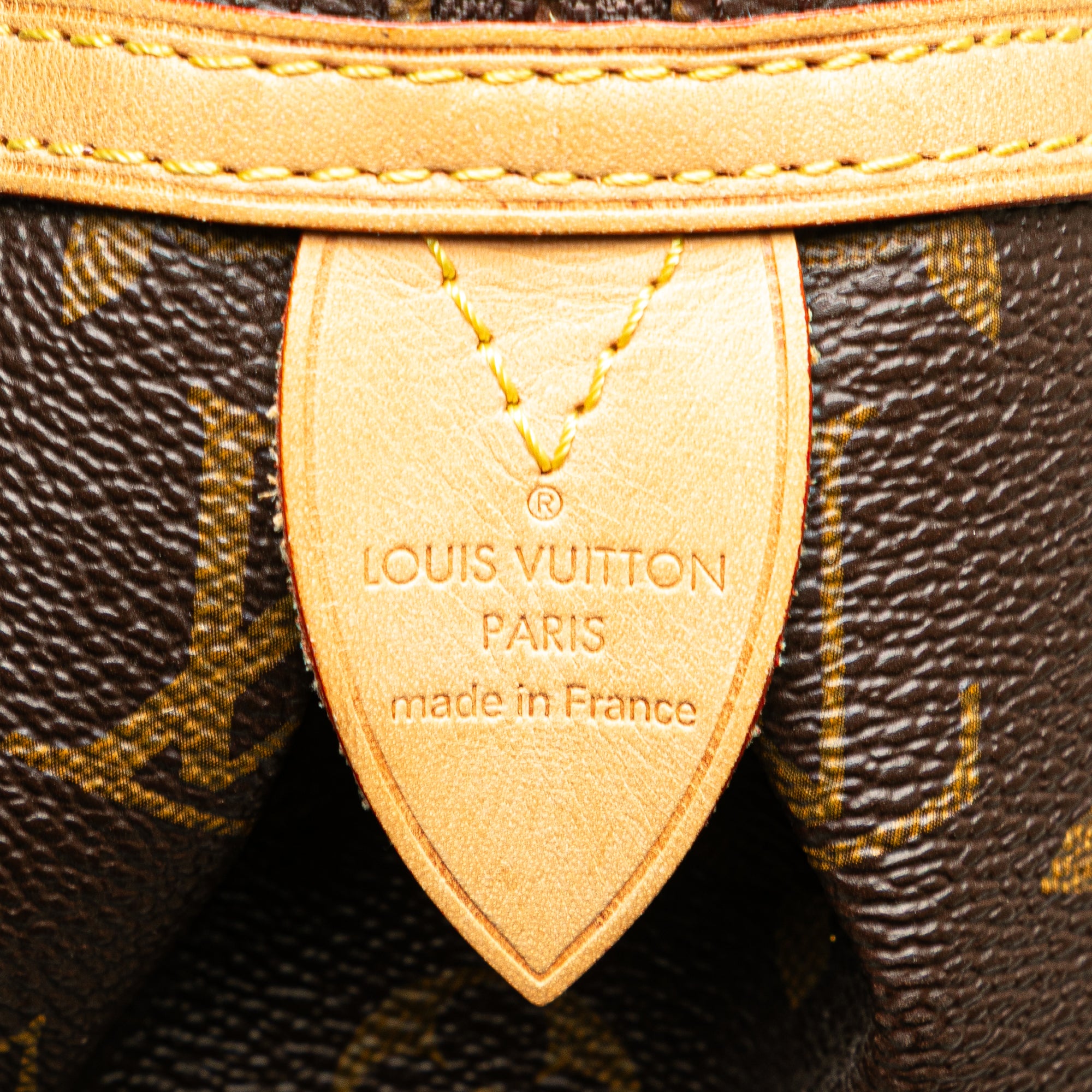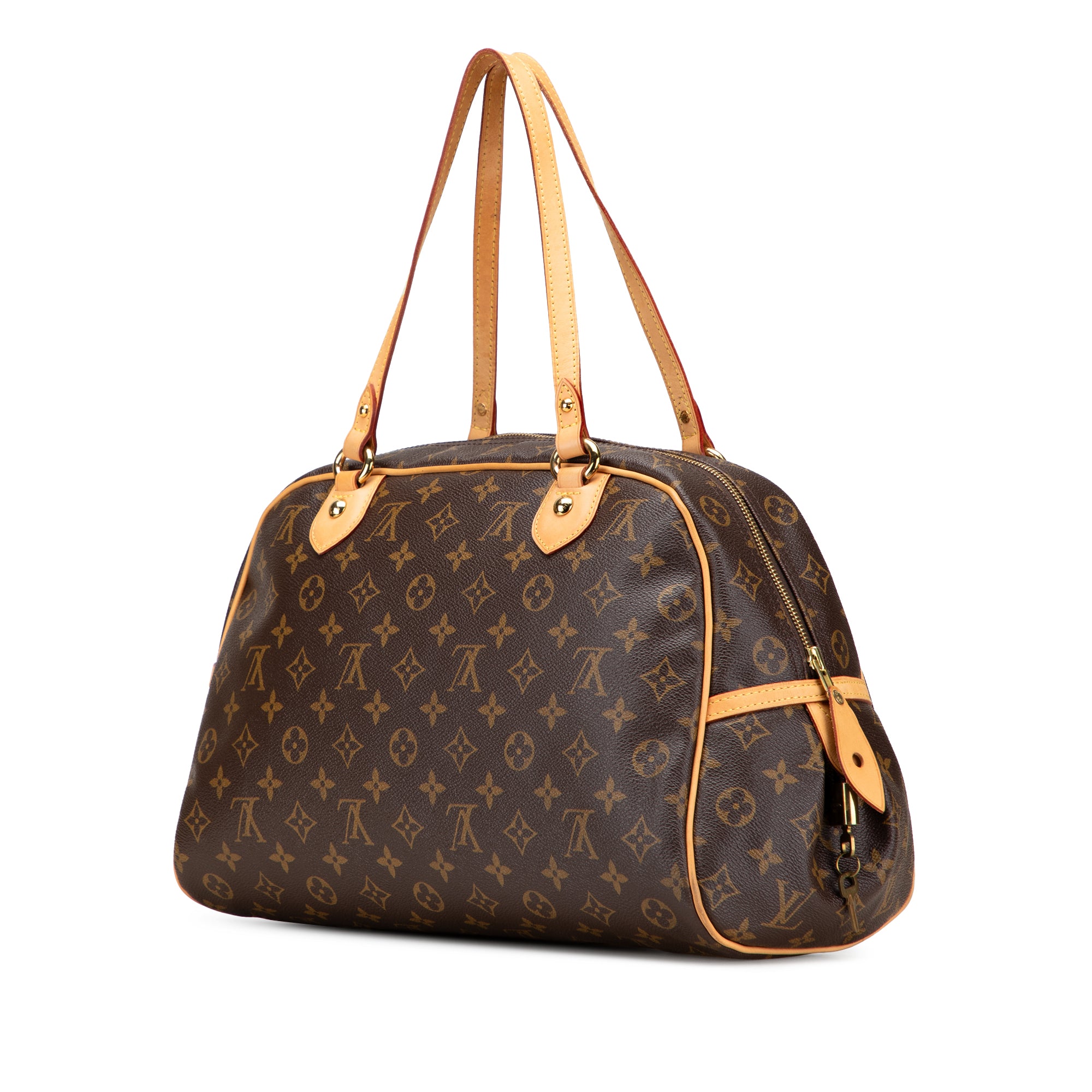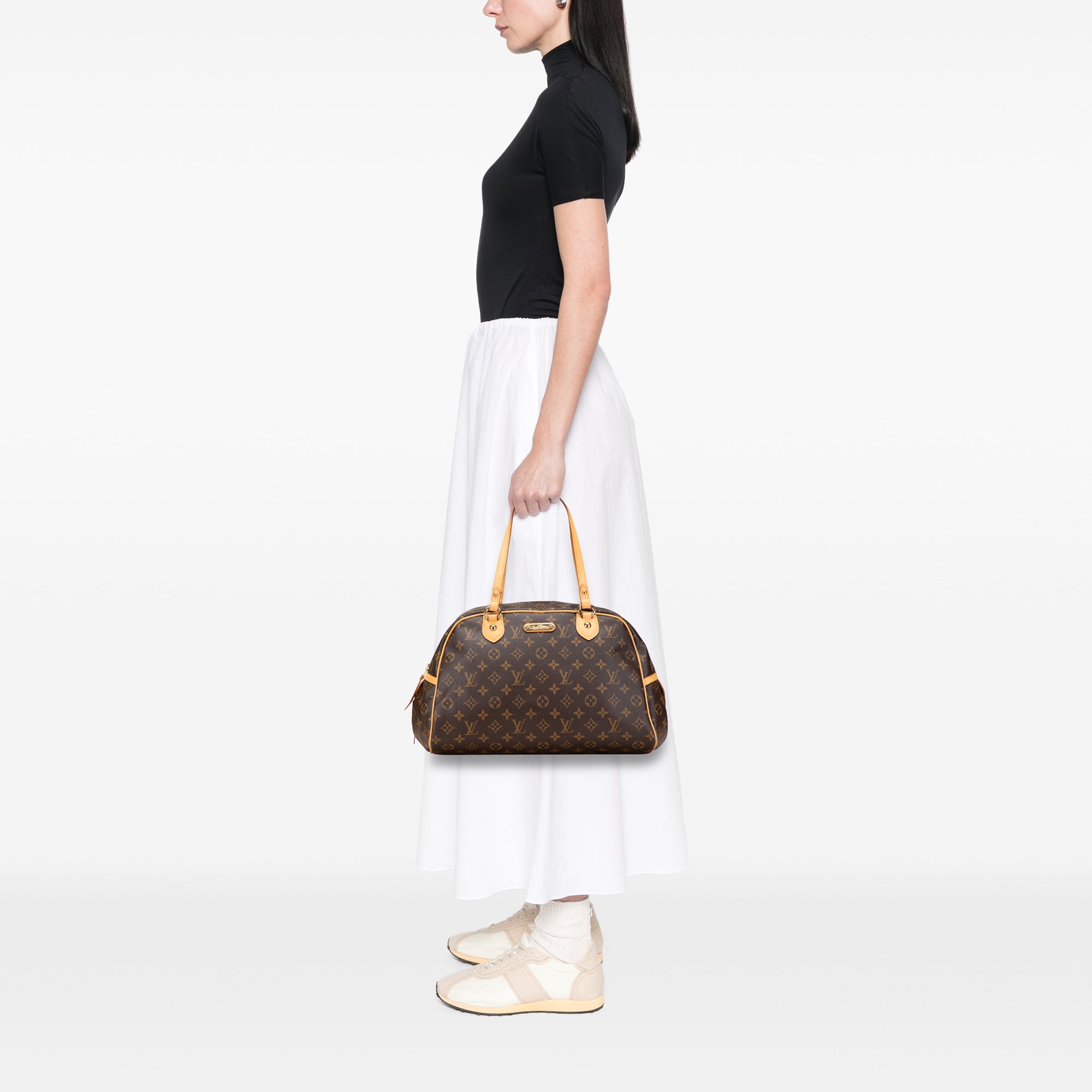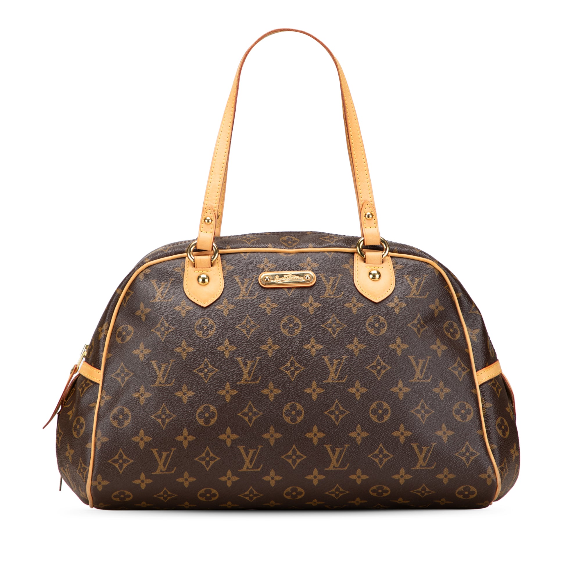 The Montorgueil GM features a monogram canvas body with vachetta leather trim, flat vachetta leather straps, a top zip closure, and an interior slip pocket. Retail Price: 1070.00