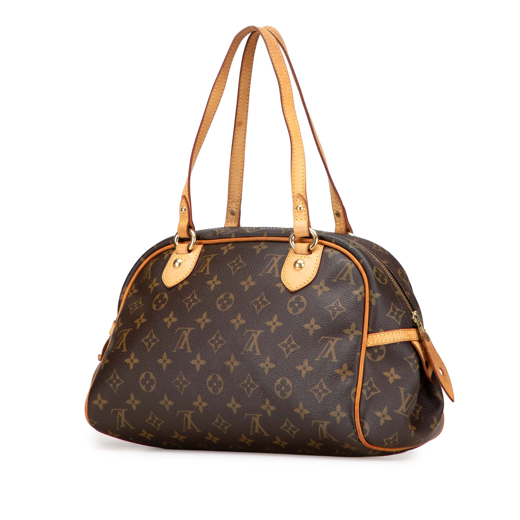 The Montorgueil PM features a monogram canvas body with vachetta leather trim, flat vachetta leather handles, a top zip closure, and an interior slip pocket. Retail Price: 1015.00