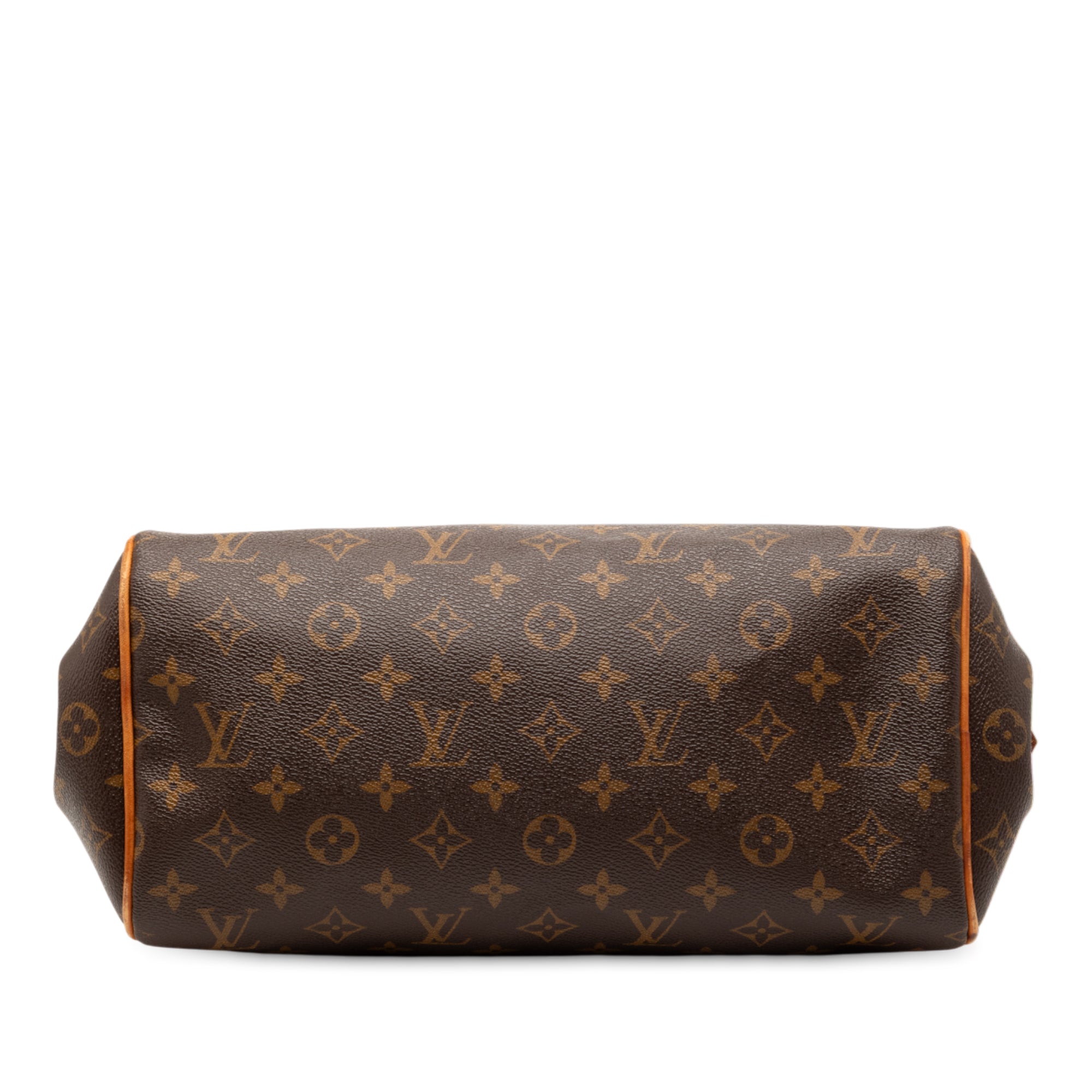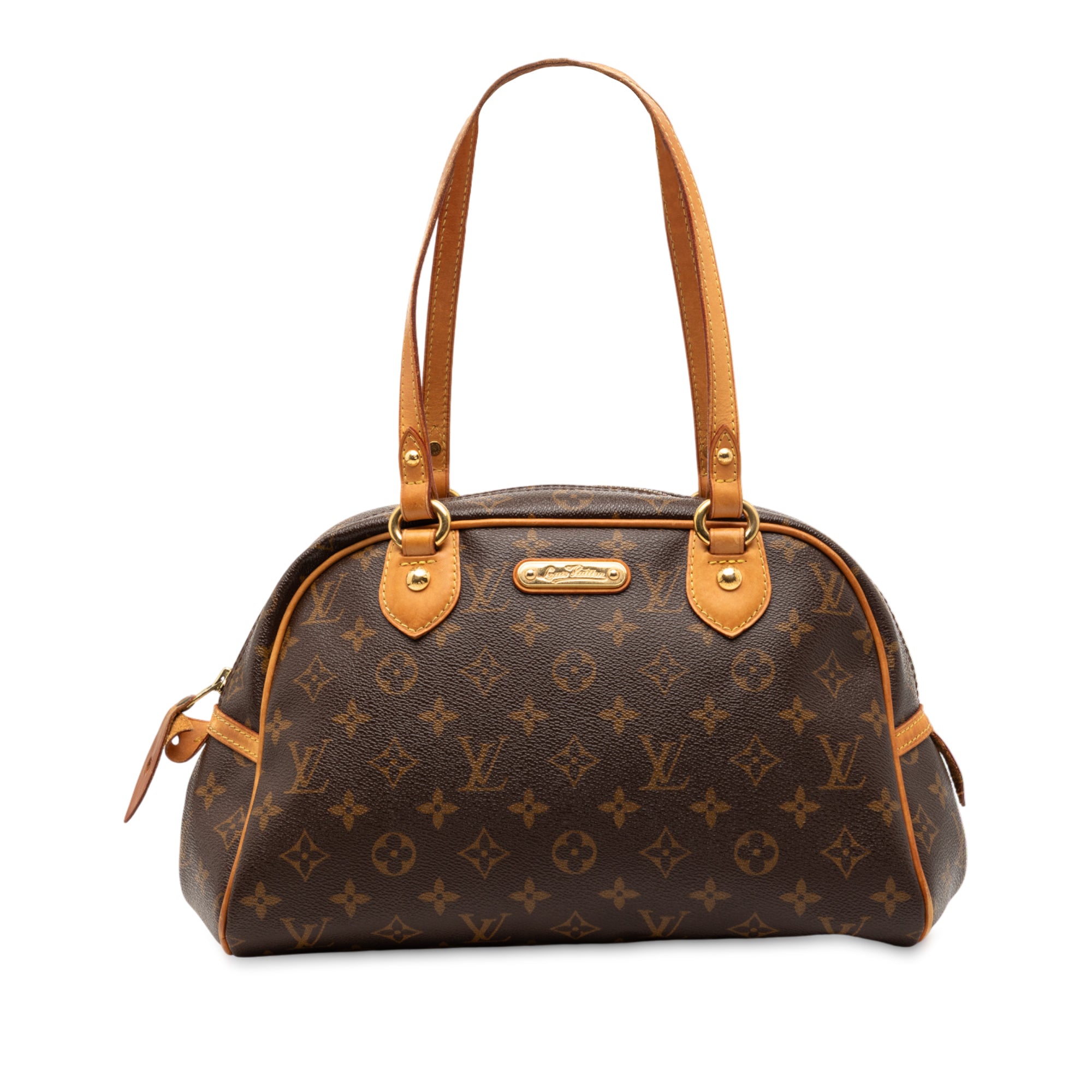 The Montorgueil PM features a monogram canvas body with vachetta leather trim, flat vachetta leather handles, a top zip closure, and an interior slip pocket. Retail Price: 980.00