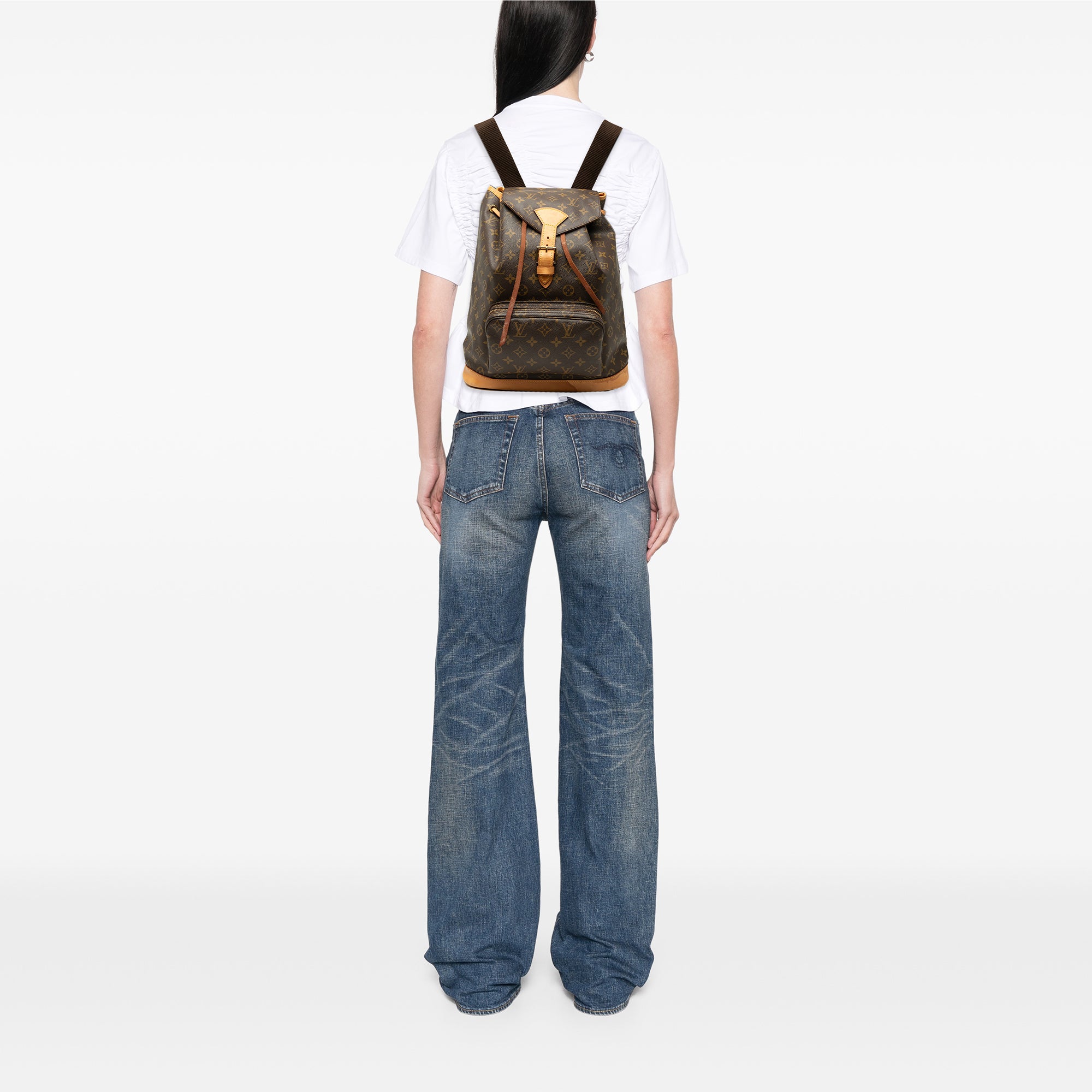 The Montsouris GM features a monogram canvas body with vachetta leather trim, adjustable flat back straps, a flap with belt buckle detail, a top drawstring closure, an exterior front zip pocket, and an interior slip pocket. Retail Price: 1405.00