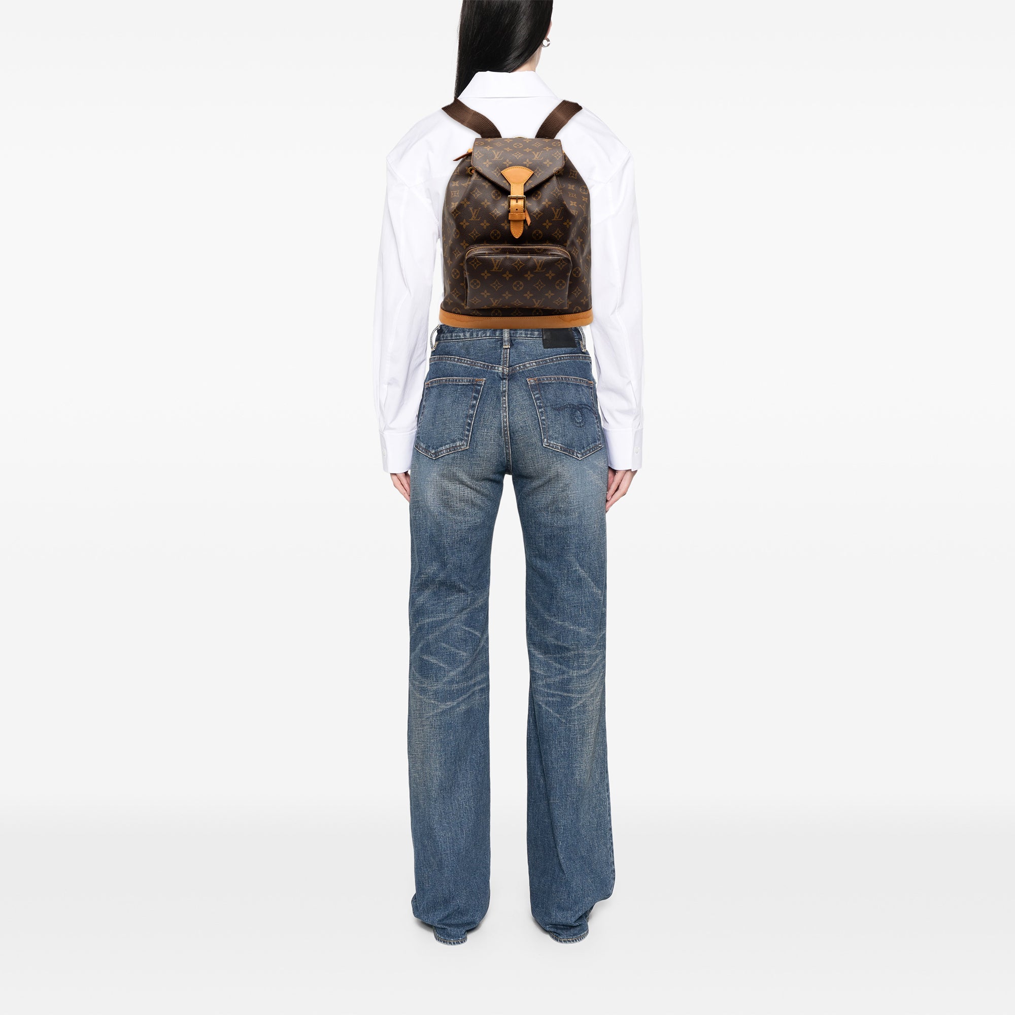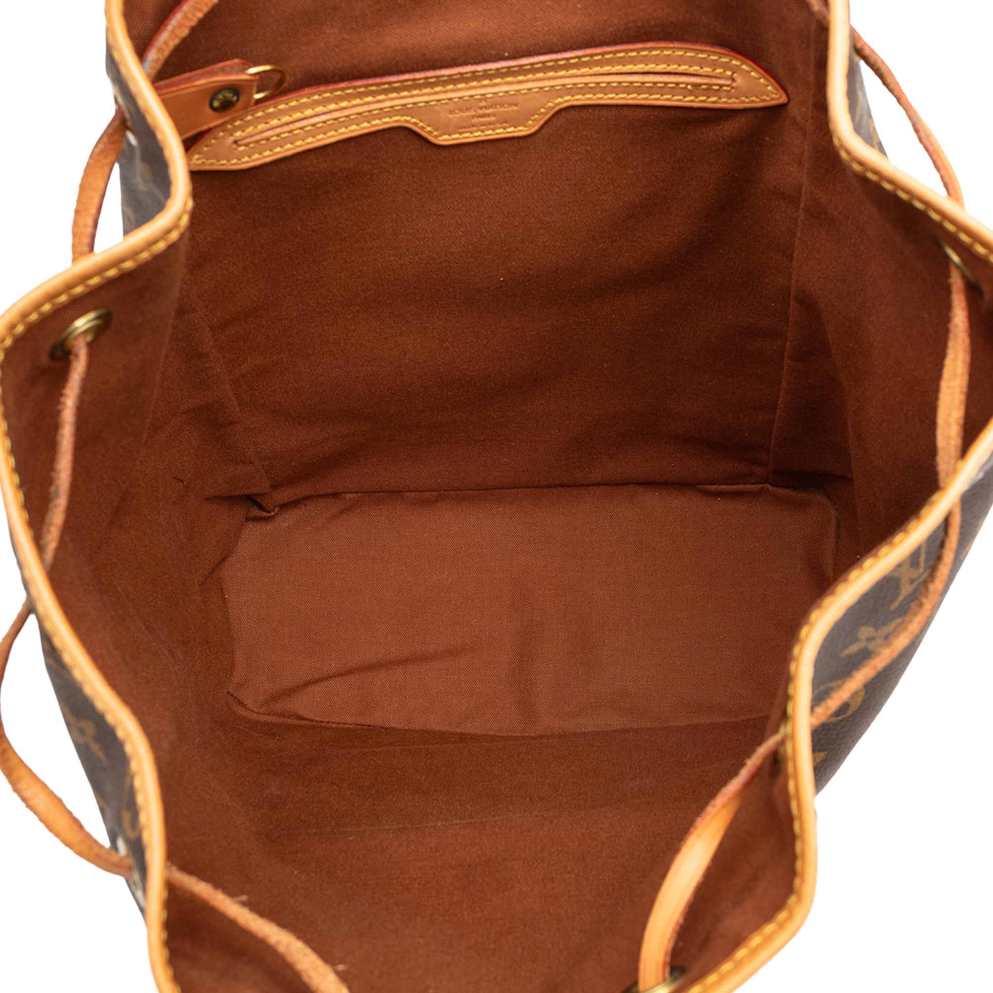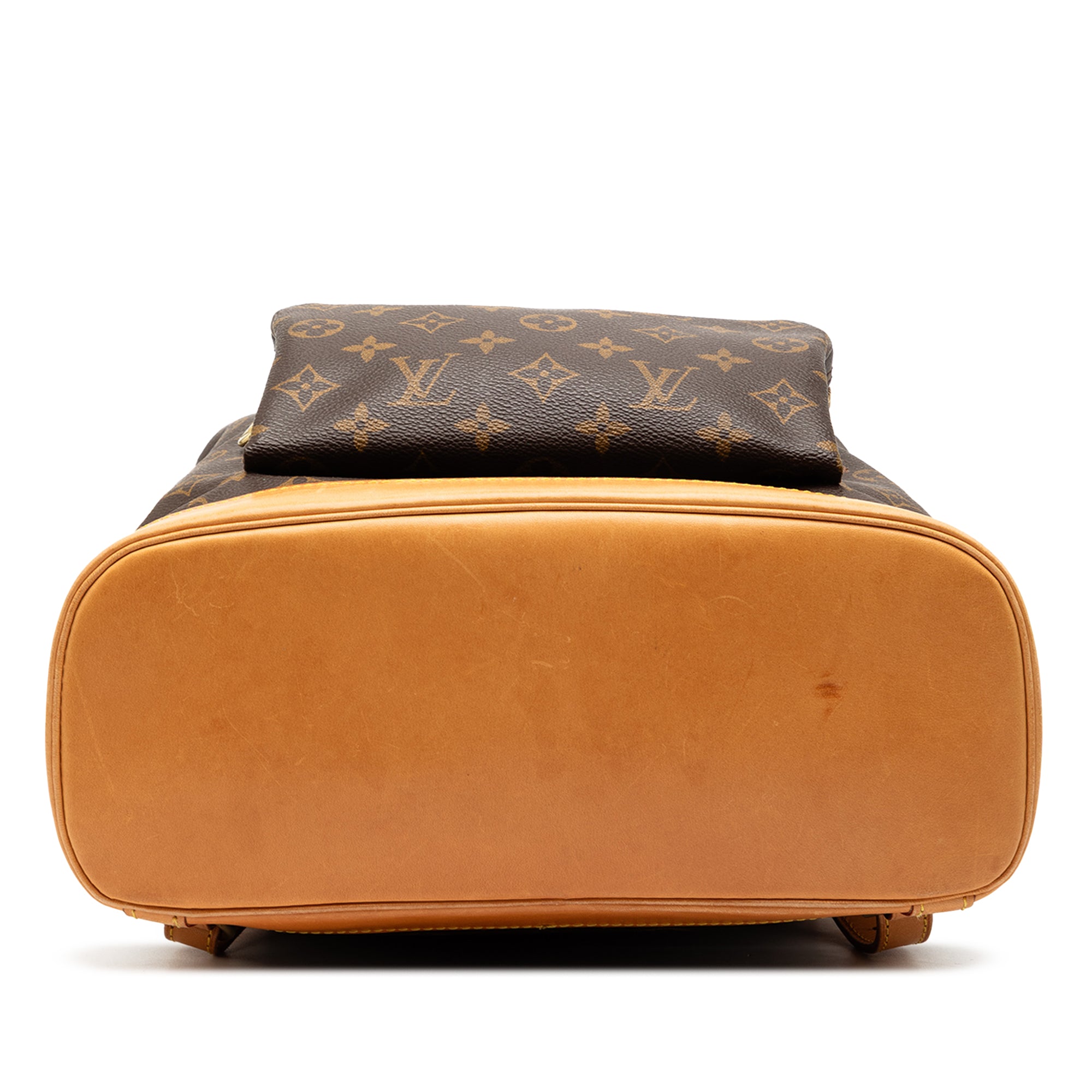 The Montsouris GM features a monogram canvas body with vachetta leather trim, adjustable flat back straps, a flap with belt buckle detail, a top drawstring closure, an exterior front zip pocket, and an interior slip pocket. Retail Price: 1338.00