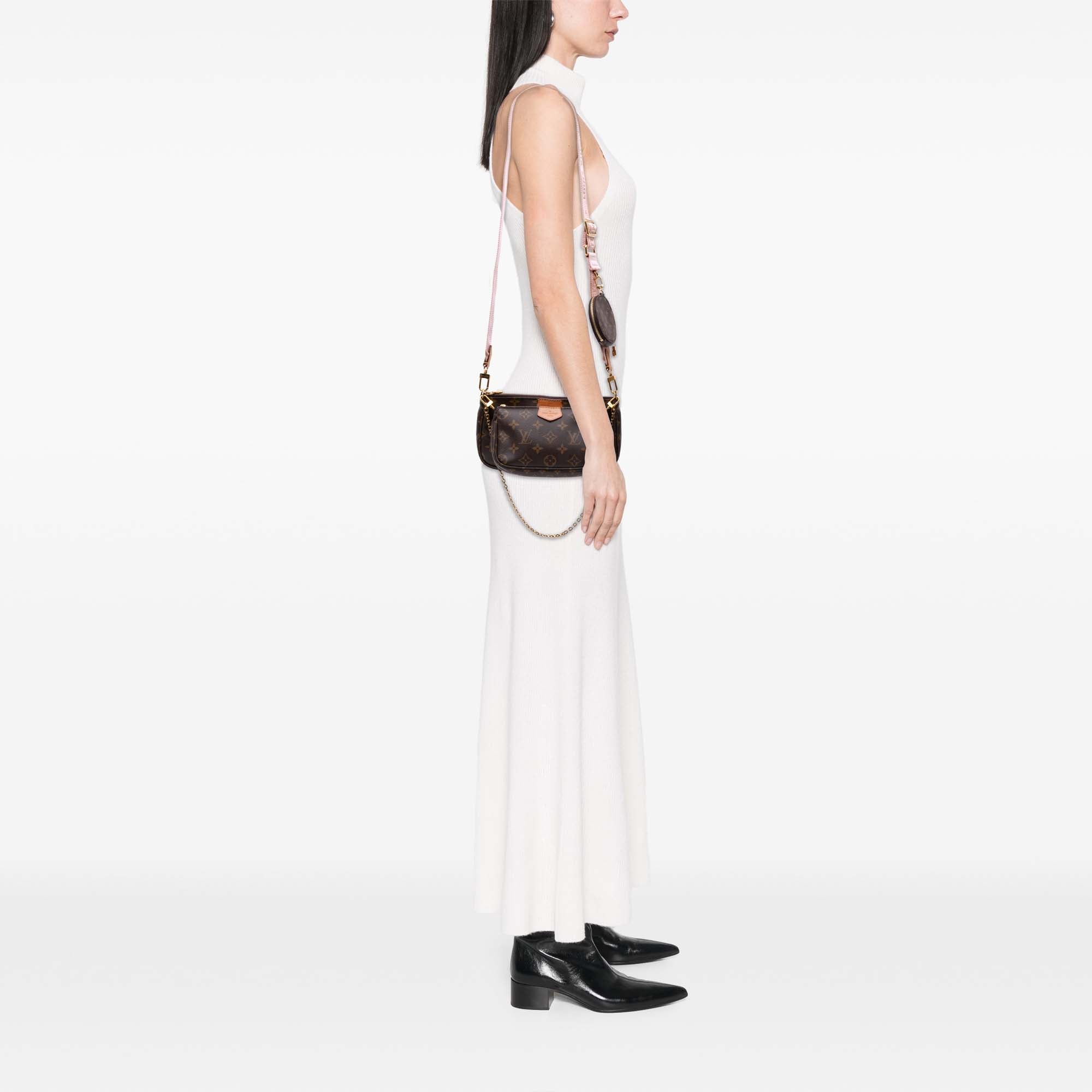 The Multi-Pochette Accessoires features a monogram canvas body, a detachable chain link strap, a detachable flat canvas shoulder strap, a top zip closure, an interior slip pocket, and removable mini pochette and coin pouch inclusions. Retail Price: 2900.00