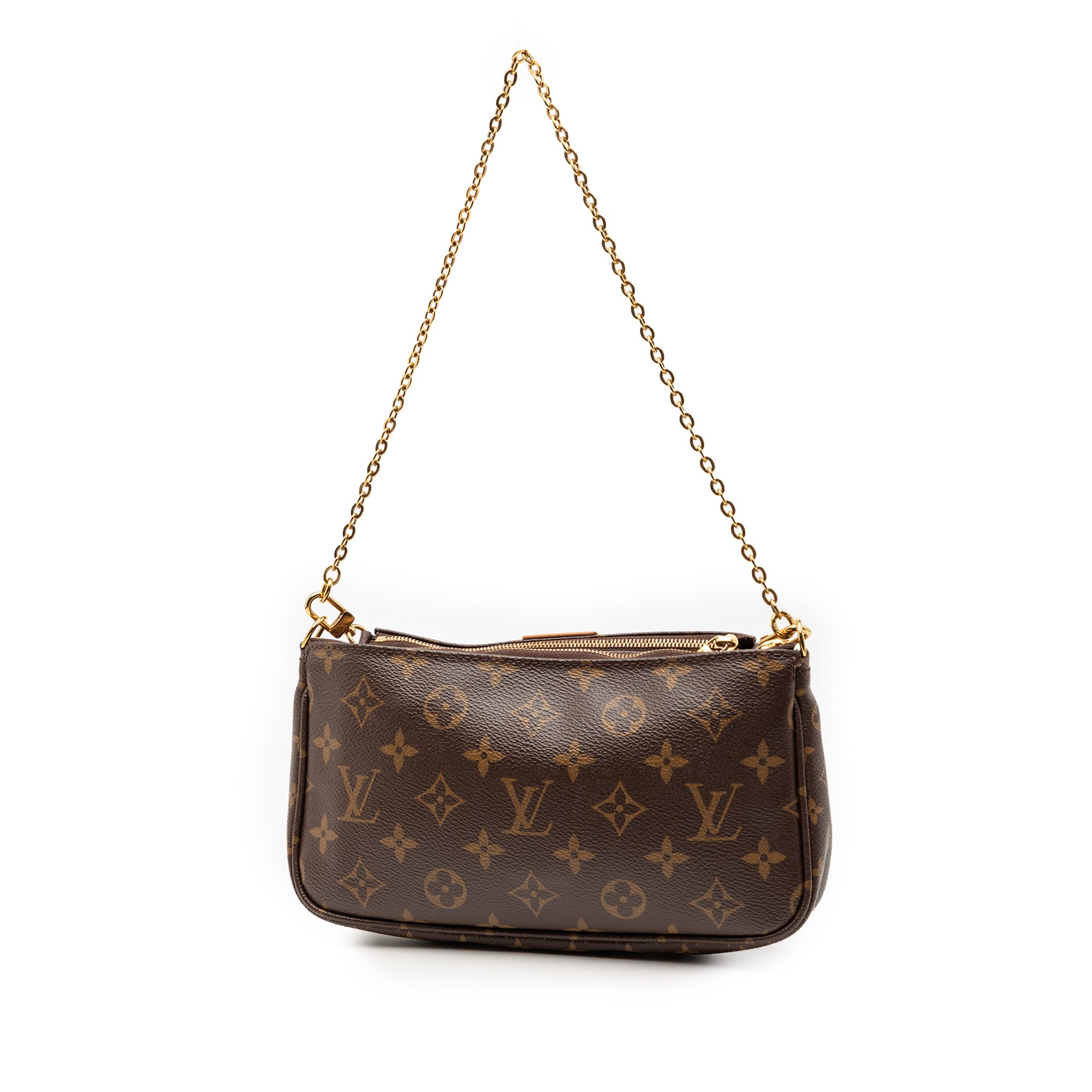The Multi-Pochette Accessoires features a monogram canvas body, a detachable chain link strap, a detachable flat canvas shoulder strap, a top zip closure, an interior slip pocket, and removable mini pochette and coin pouch inclusions. Retail Price: 2900.00