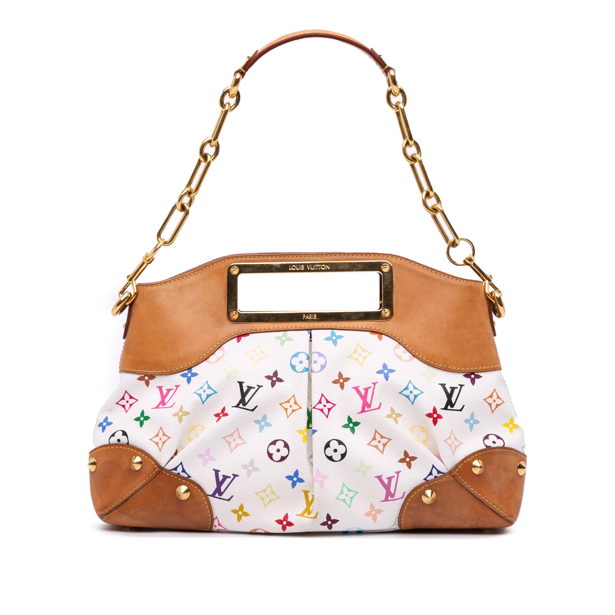 The Judy MM features a monogram multicolore canvas body with studs and vachetta leather trim, cut-out vachetta leather handles, a detachable chain link strap with leather guard, an open top with magnetic snap closure, and interior slip and flap pockets. Retail Price: 2310.00