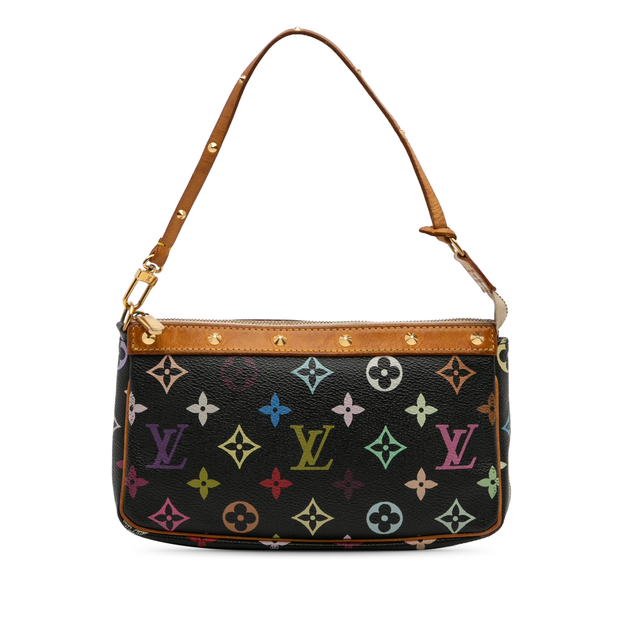 The Pochette Accessoires features a monogram multicolore canvas body with studded vachetta leather trim, a vachetta leather strap with gold-tone studs, and a top zip closure. Retail Price: 1741.00