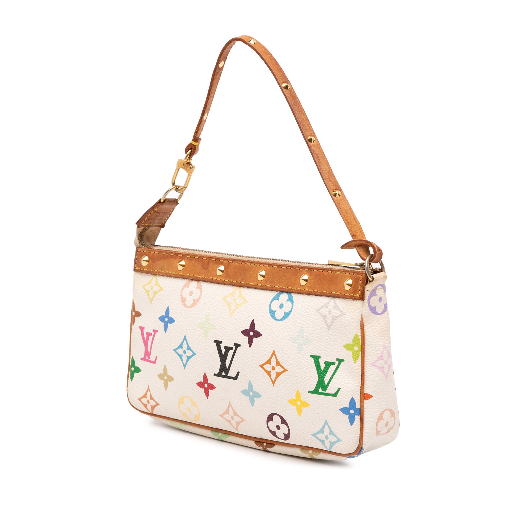 The Pochette Accessoires features a monogram multicolore canvas body with vachetta leather trim, a flat vachetta leather shoulder strap with gold-tone studs, and a top zip closure. Retail Price: 1290.00