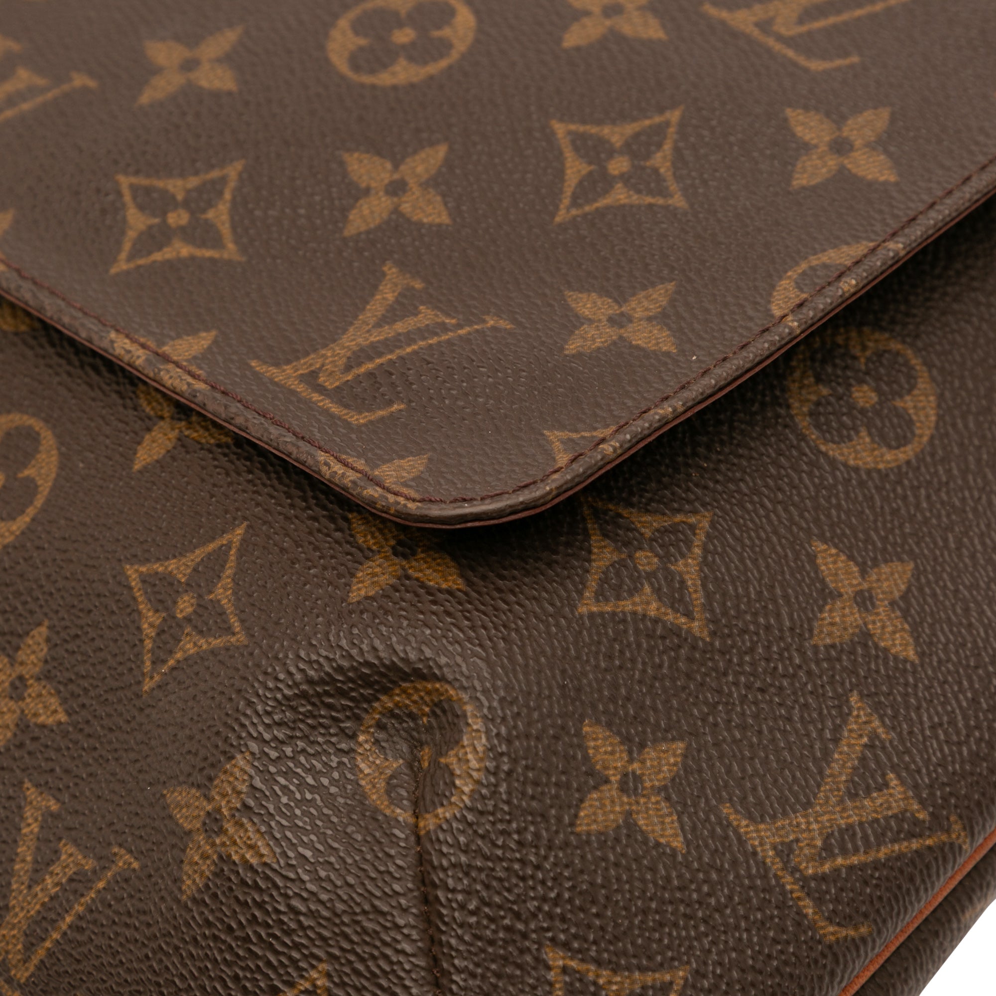 The Musette Salsa features a monogram canvas body with vachetta leather trim, an adjustable vachetta leather shoulder strap with buckle details, a front flap with magnetic snap closure, and an interior slip pocket. Retail Price: 1080.00