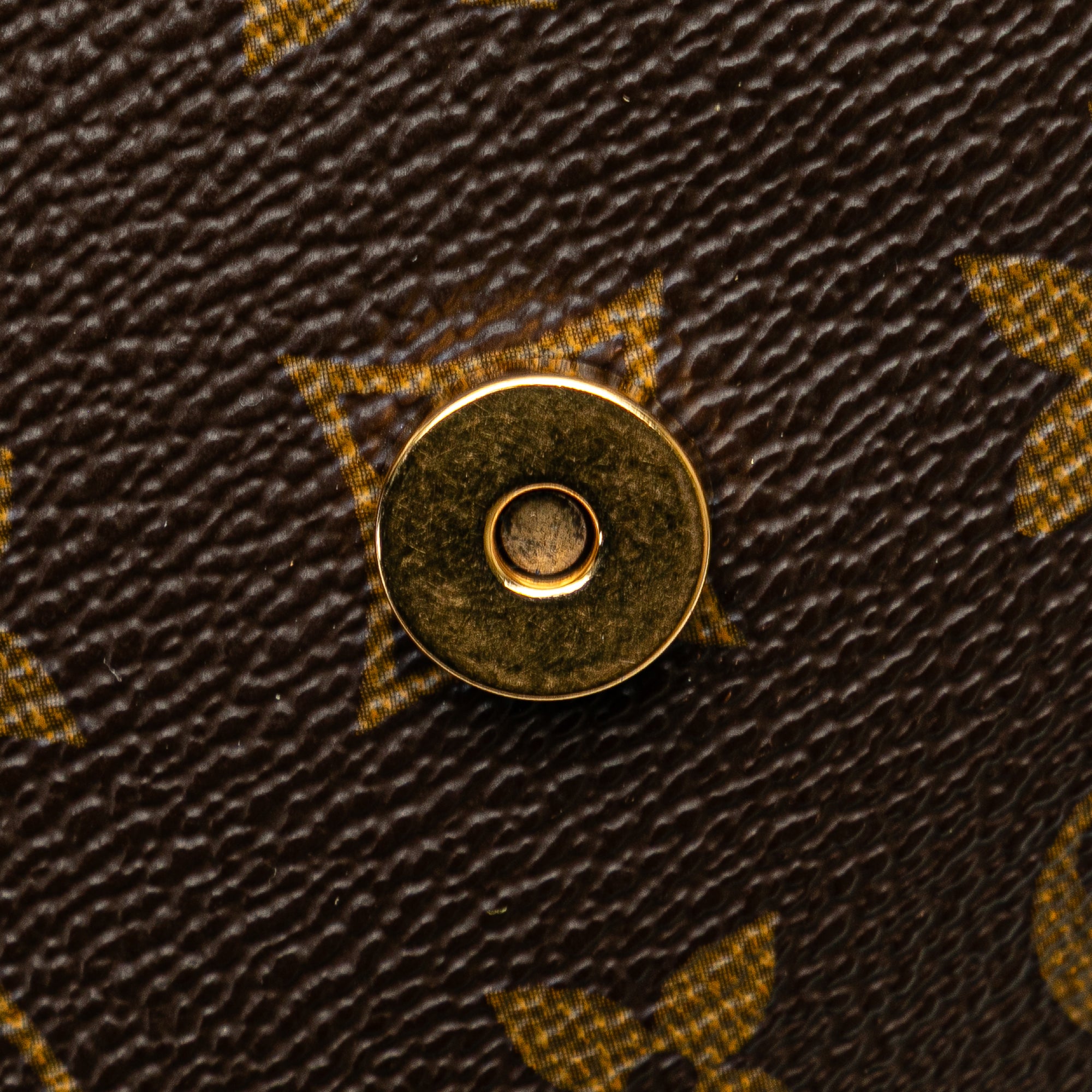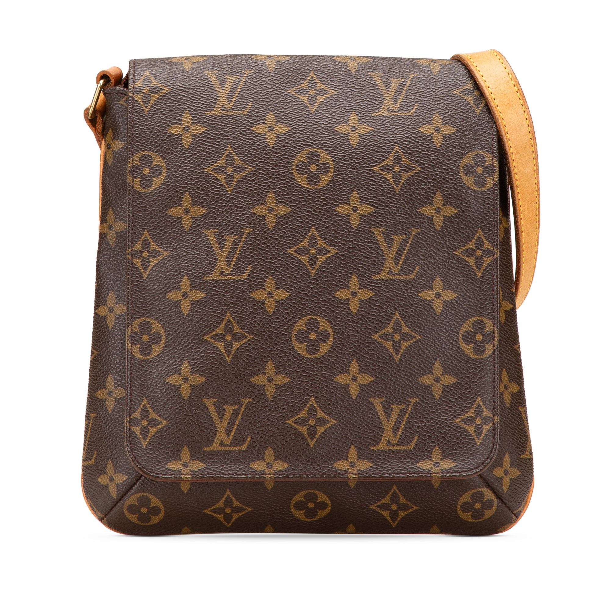 The Musette Salsa features a monogram canvas body, an adjustable flat vachetta shoulder strap, a front flap with a magnetic closure, and an interior slip pocket. Retail Price: 1170.00