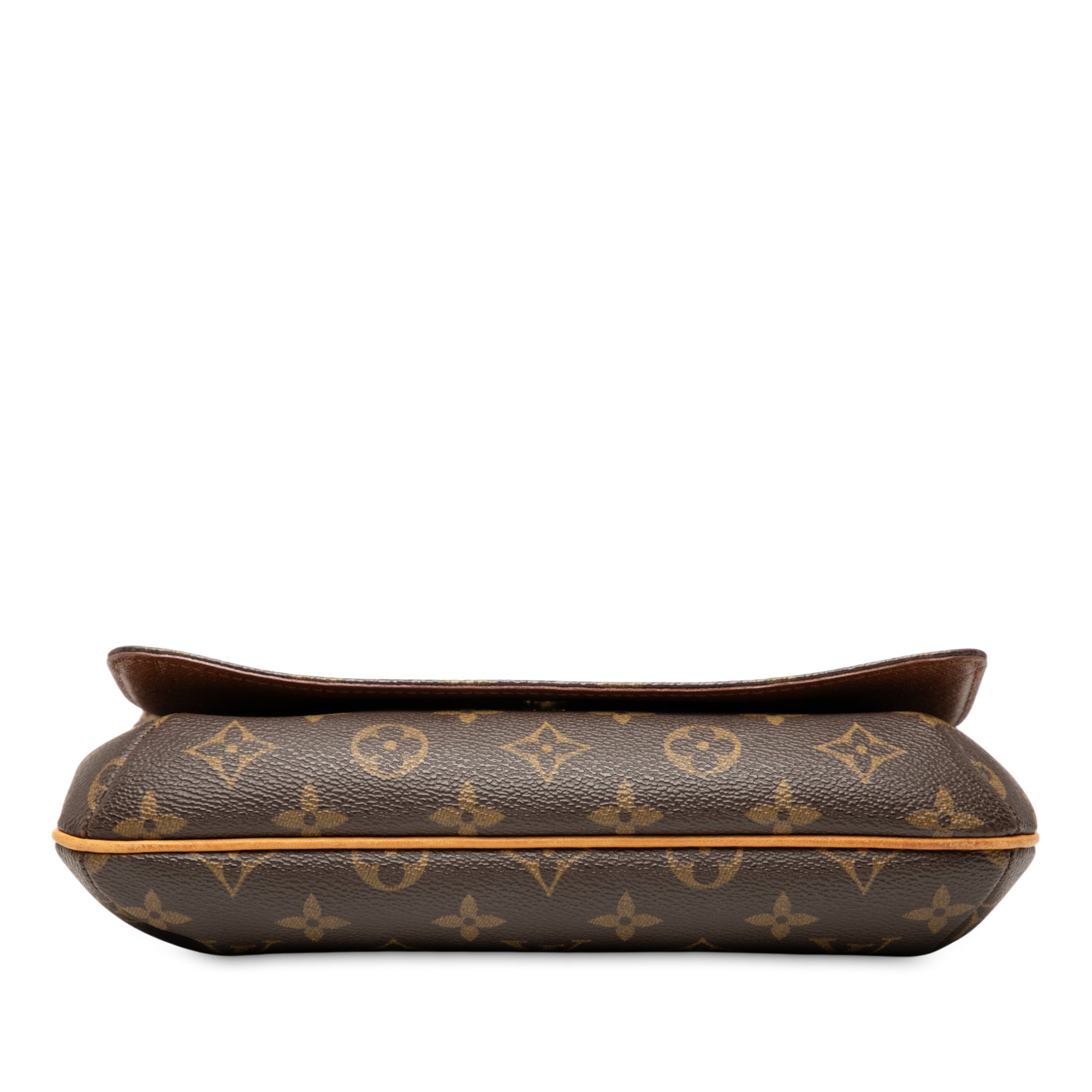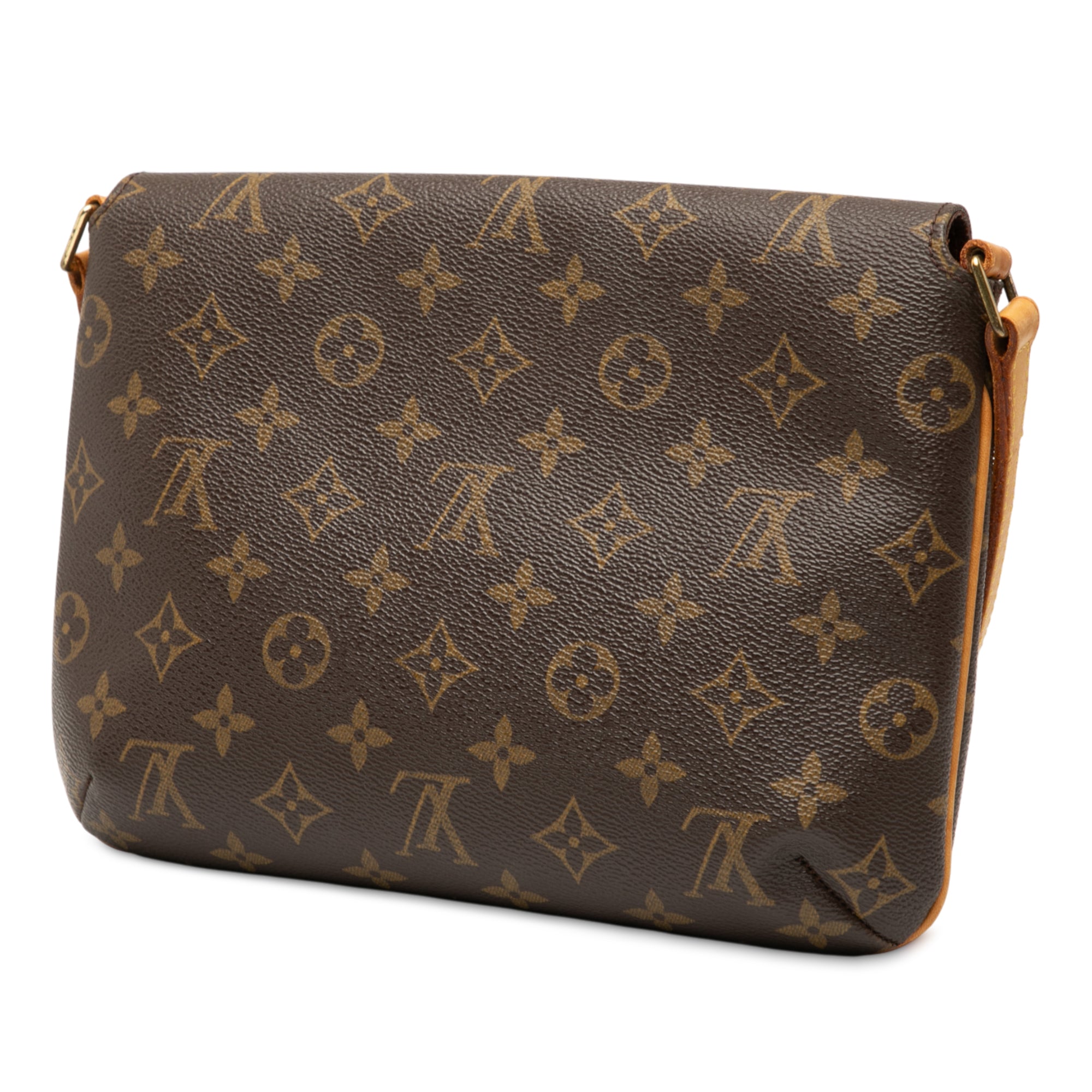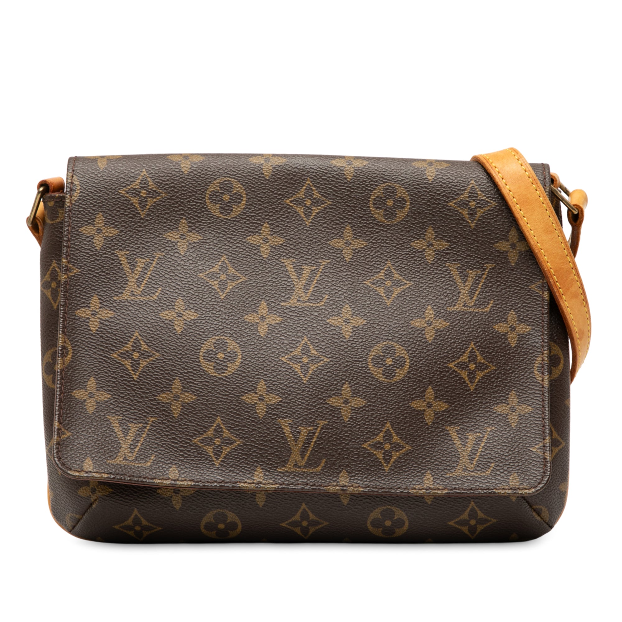 The Musette Tango features a monogram canvas body, a flat vachetta leather shoulder strap, a front flap with a magnetic closure, and an interior slip pocket. Retail Price: 1150.00