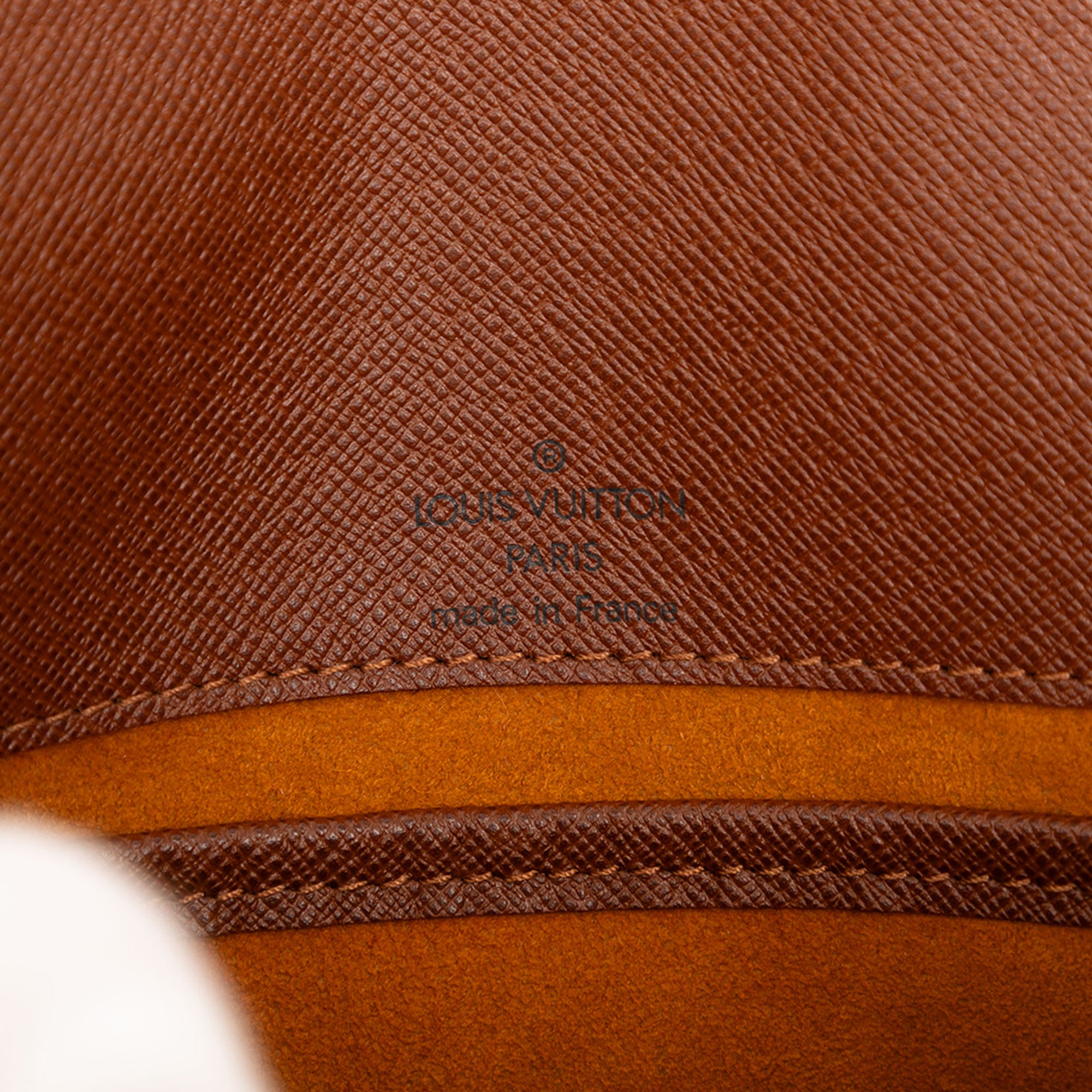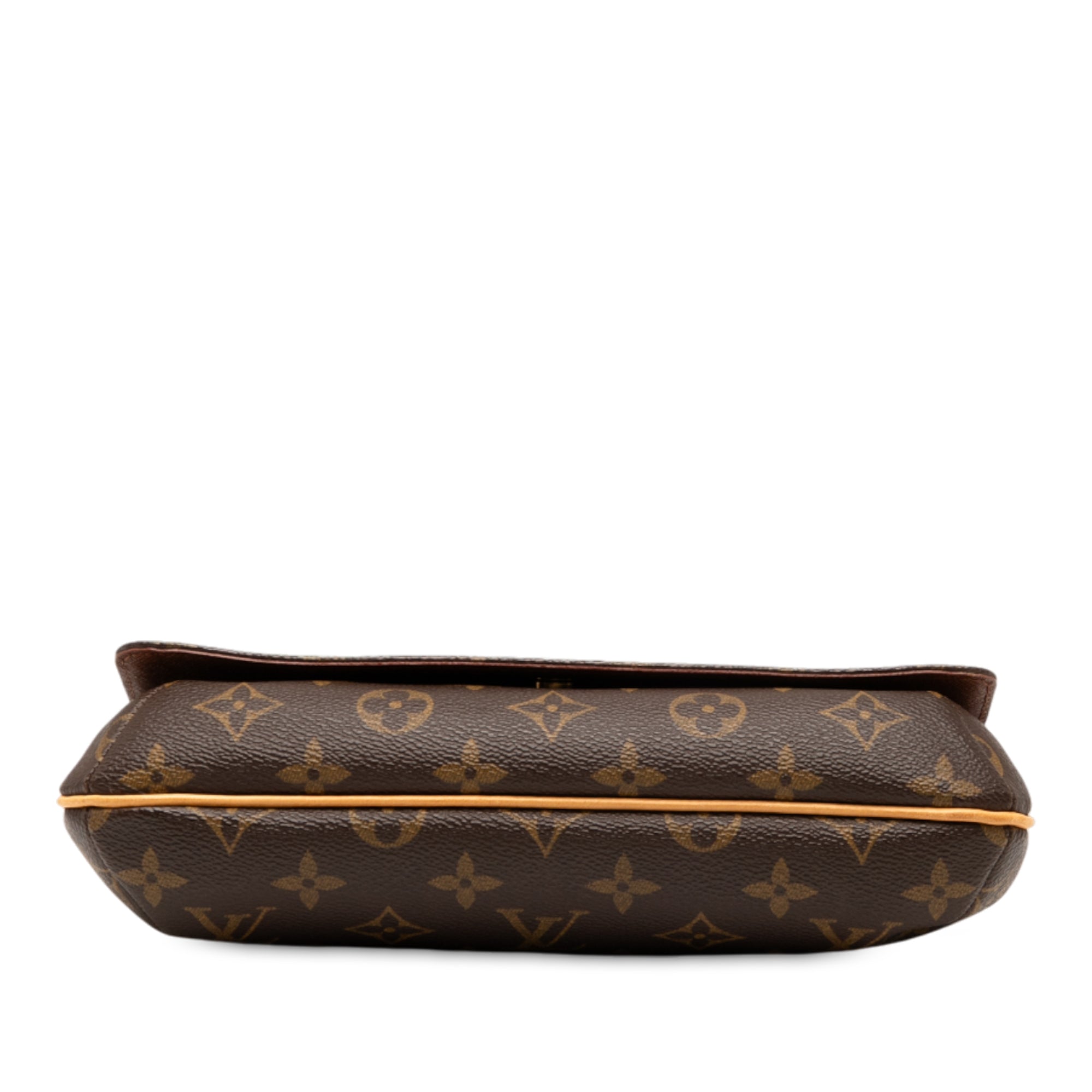 The Musette Tango features a monogram canvas body, a flat vachetta leather shoulder strap, a front flap with a magnetic closure, and an interior slip pocket. Retail Price: 1150.00