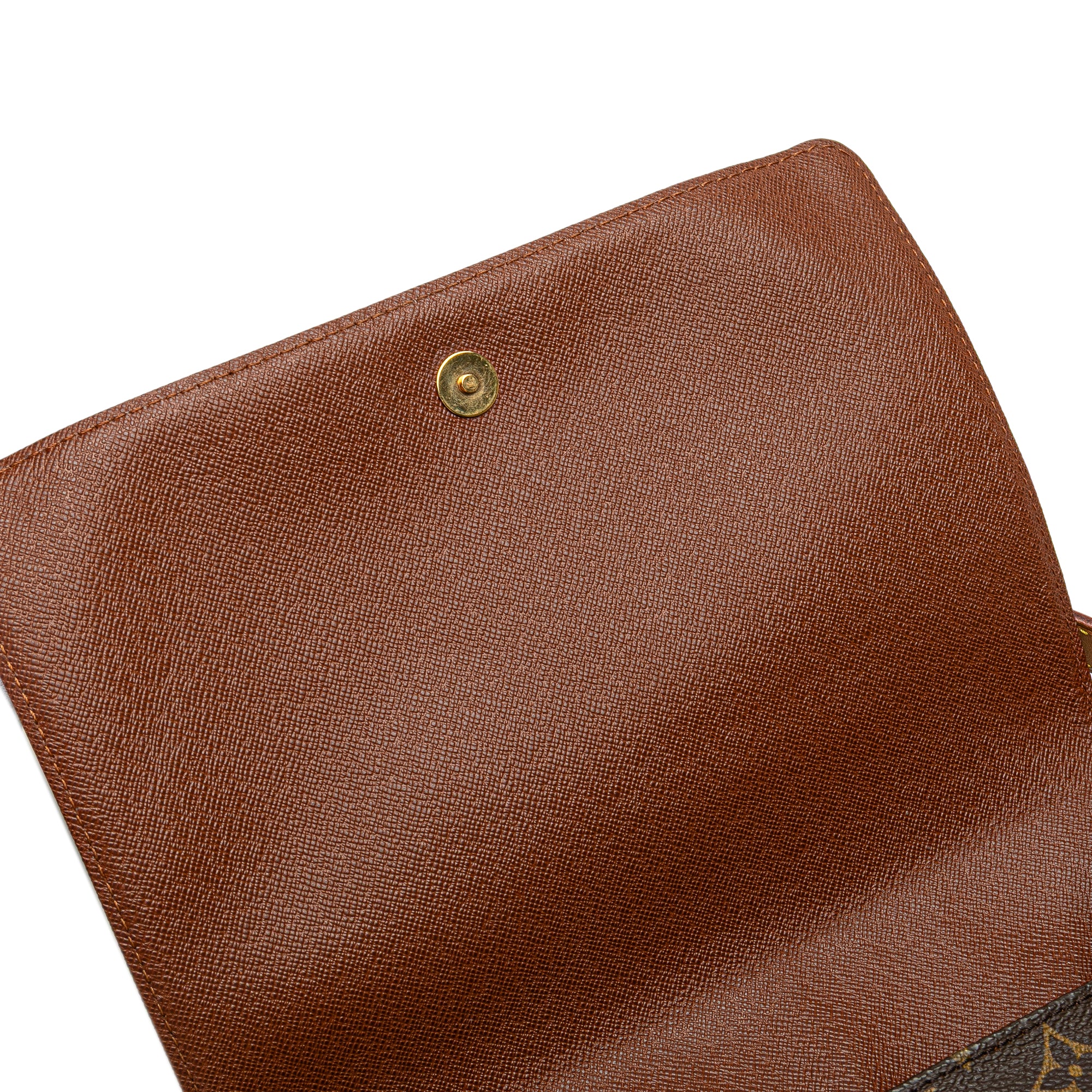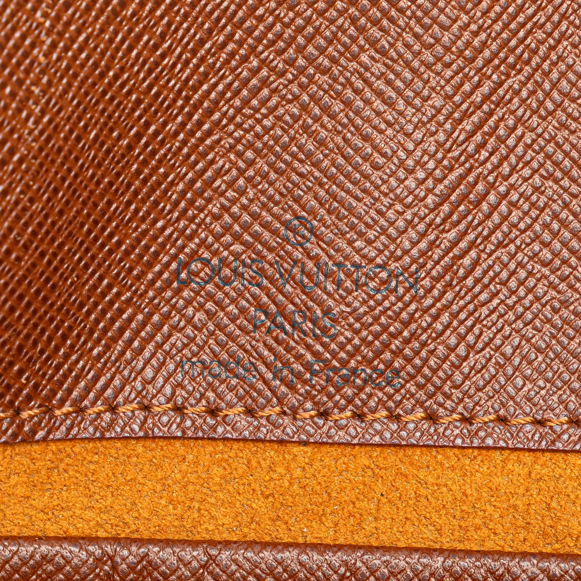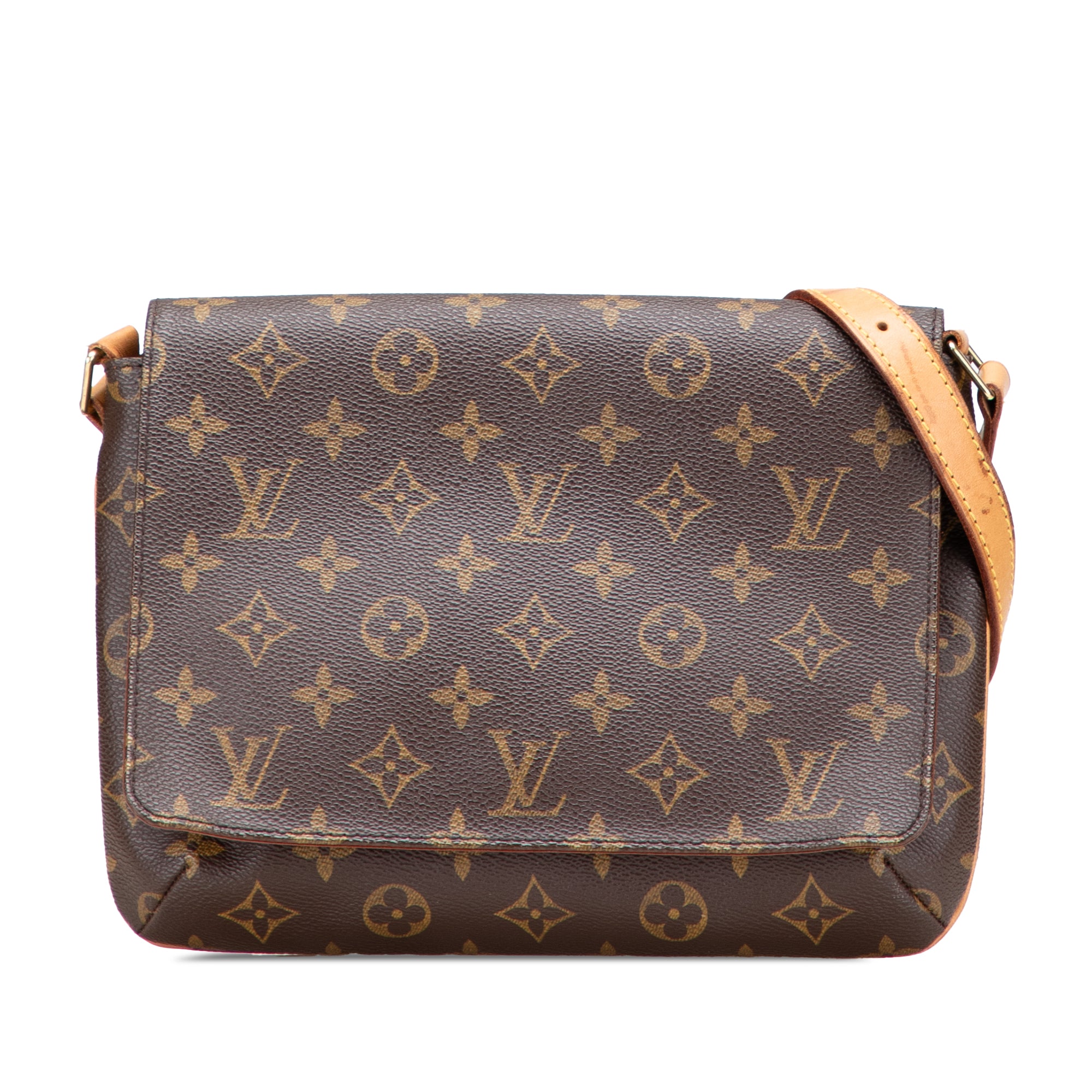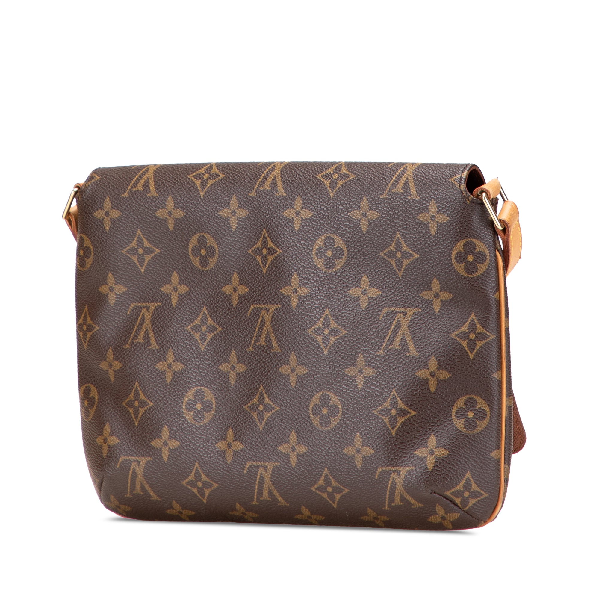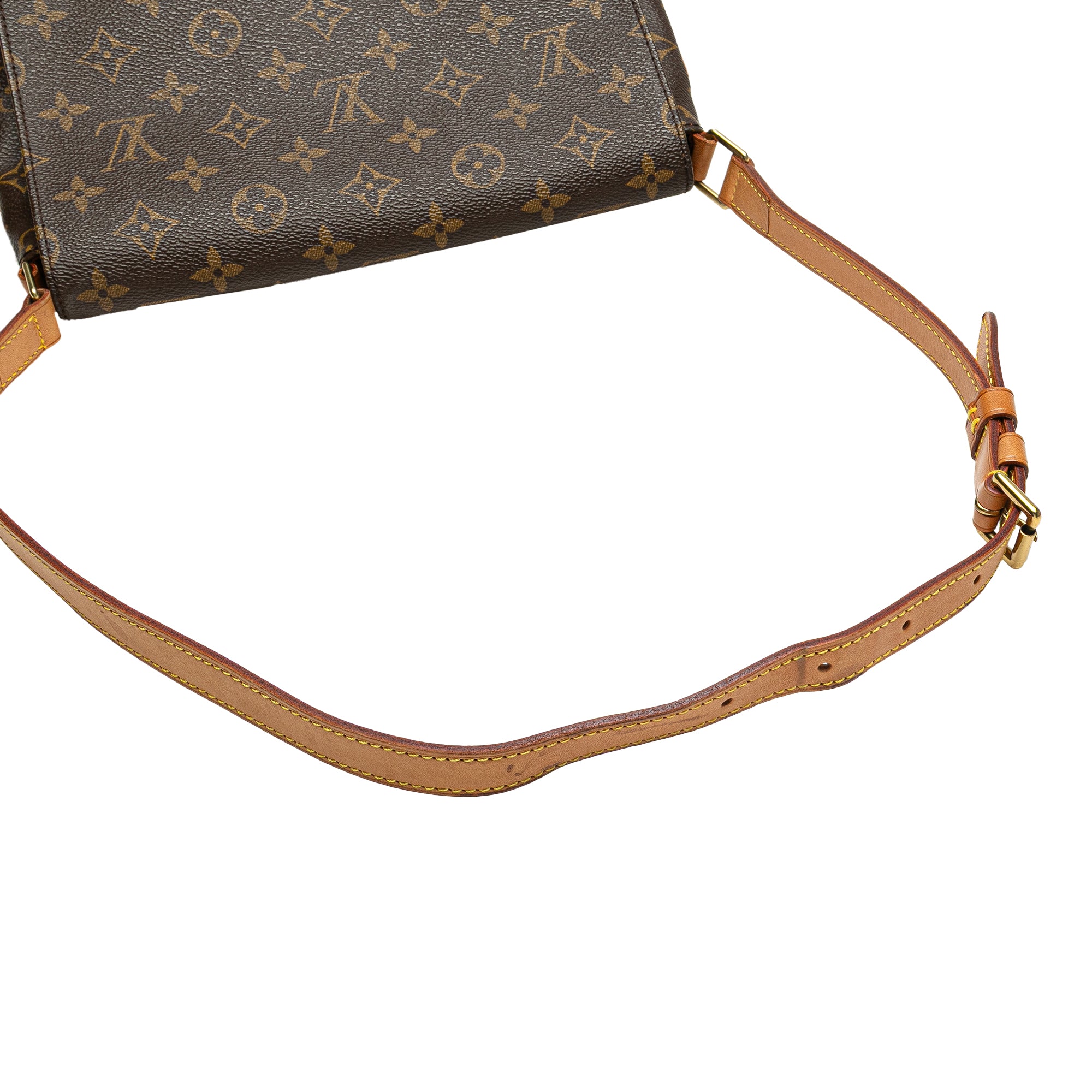 The Musette Tango features a monogram canvas body with vachetta leather trim, an adjustable vachetta leather shoulder strap, a front flap with magnetic snap closure, and an interior slip pocket. Retail Price: 1150.00