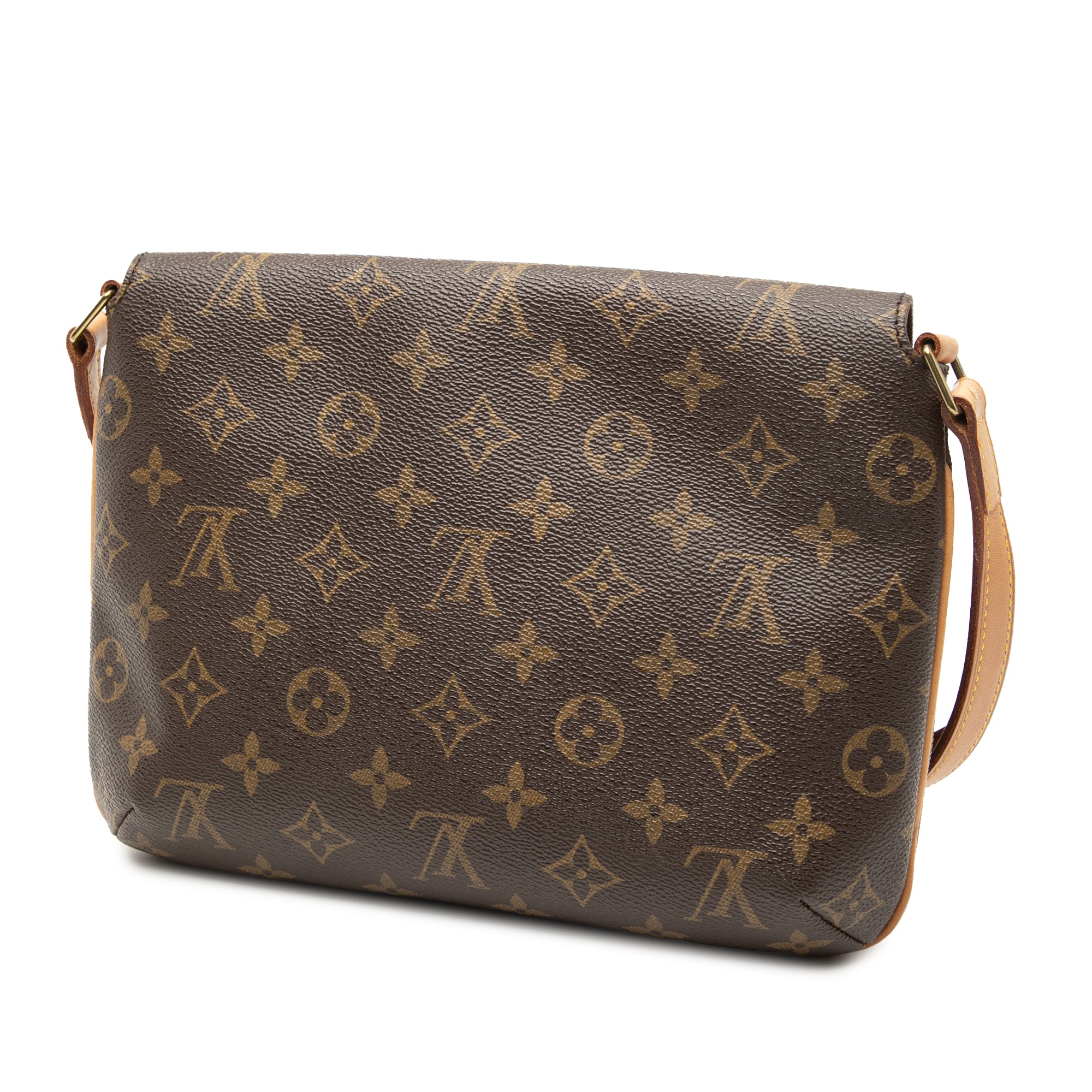 The Musette Tango features a monogram canvas body, a flat vachetta leather shoulder strap, a front flap with a magnetic closure, and an interior slip pocket. Inclusion: Dust bag. Retail Price: 830.00