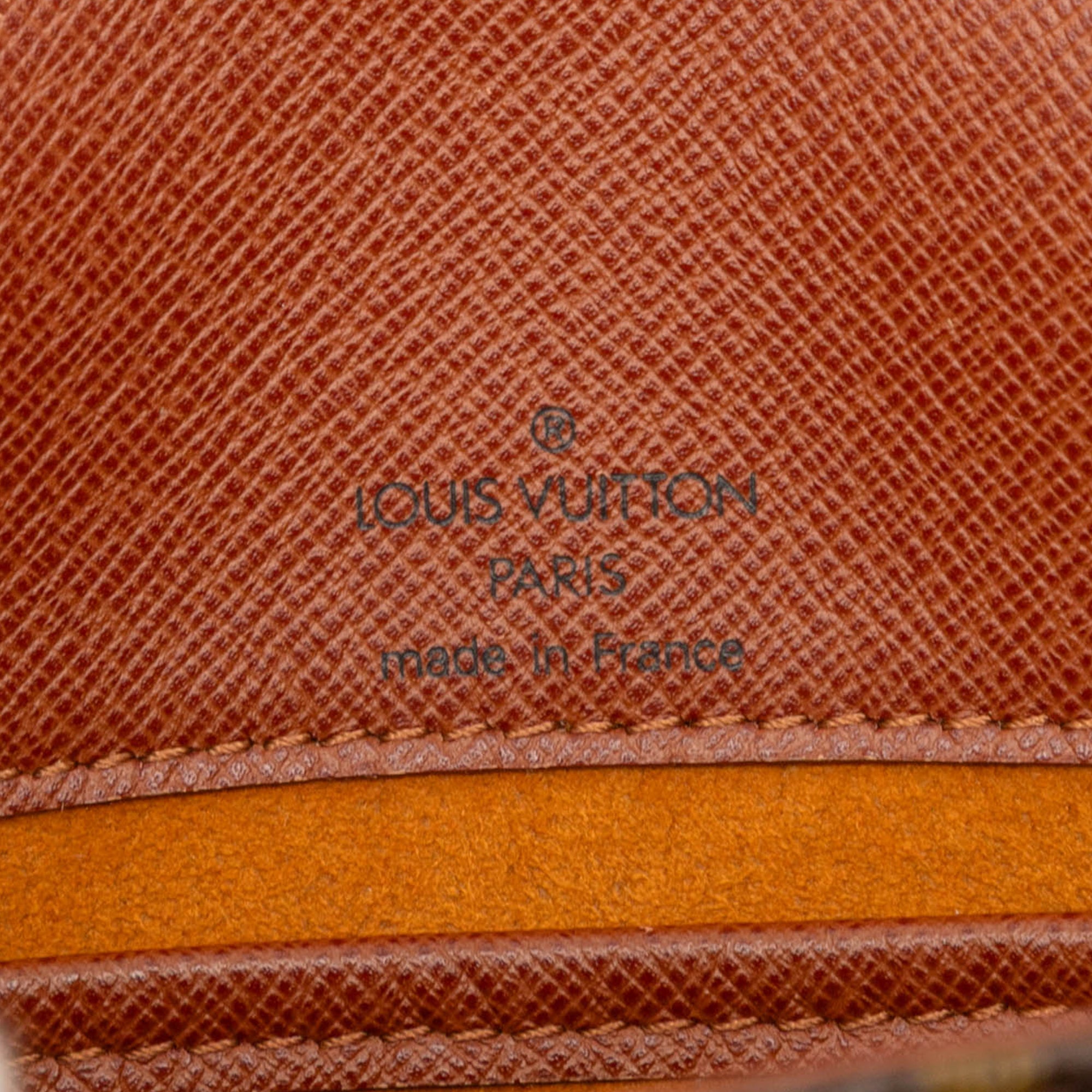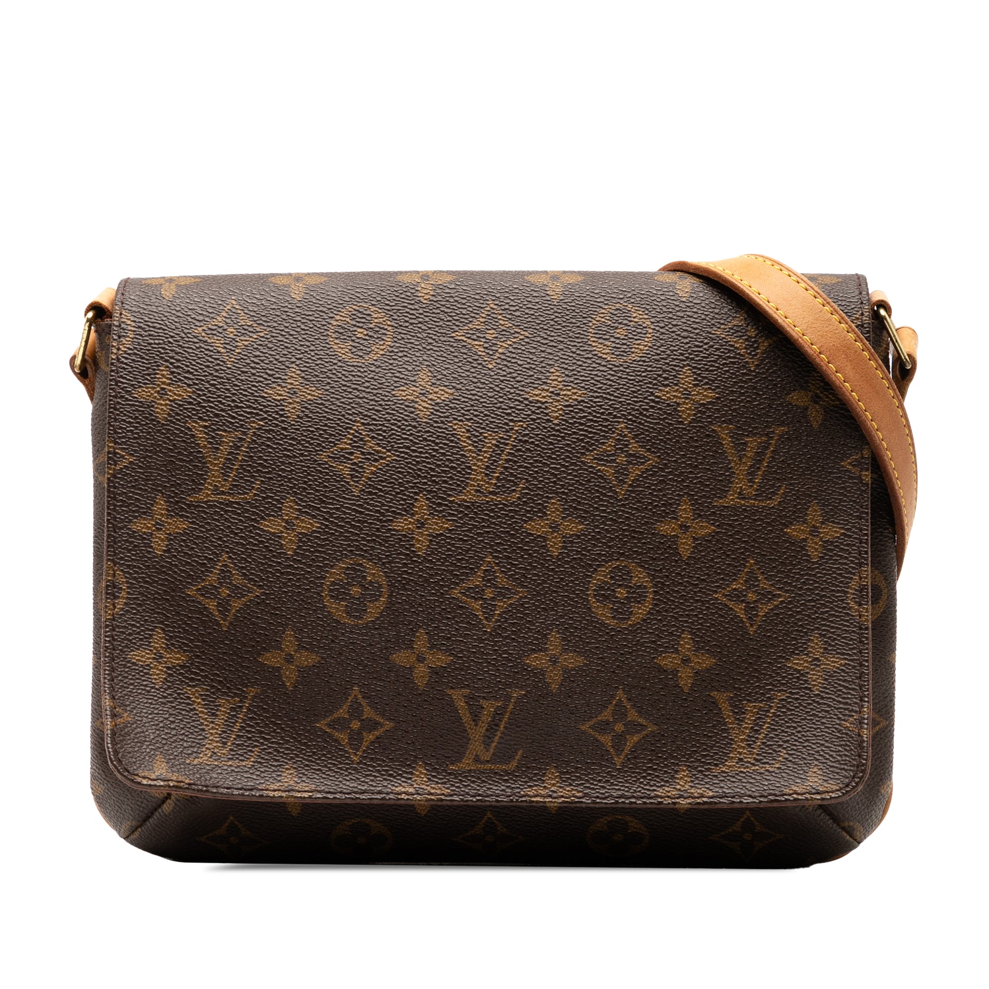 The Musette Tango features a monogram canvas body, a flat vachetta leather shoulder strap, a front flap with a magnetic closure, and an interior slip pocket. Retail Price: 1150.00