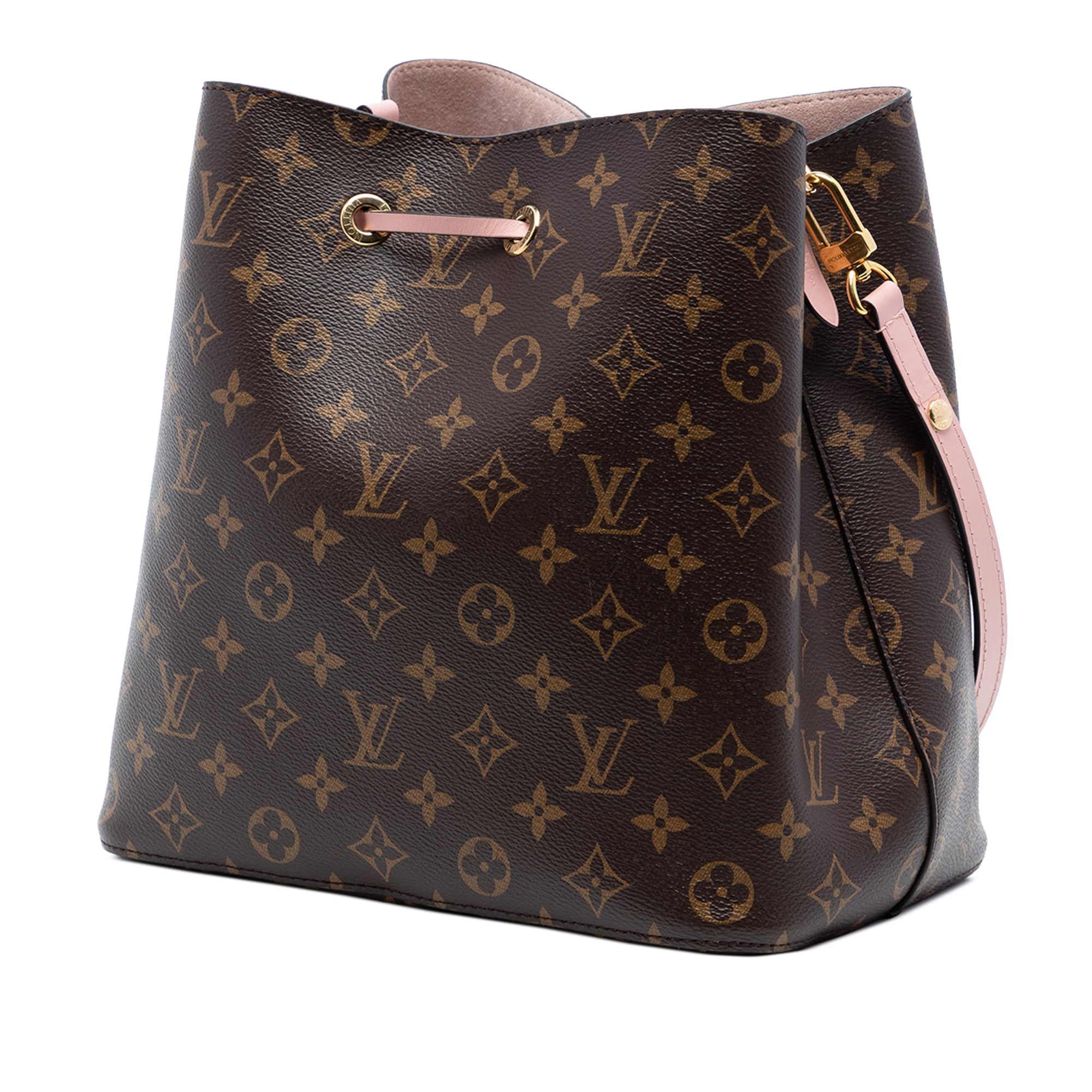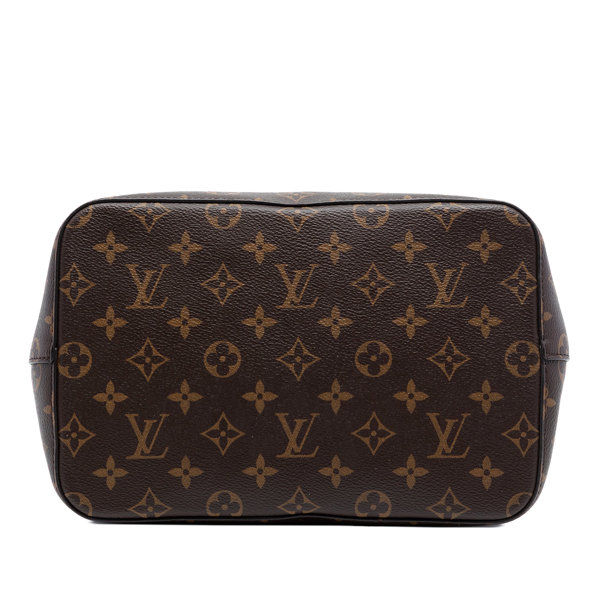 The Neonoe features a monogram canvas body, a detachable flat leather strap, a drawstring closure, and an interior zip pocket. Retail Price: 1965.00