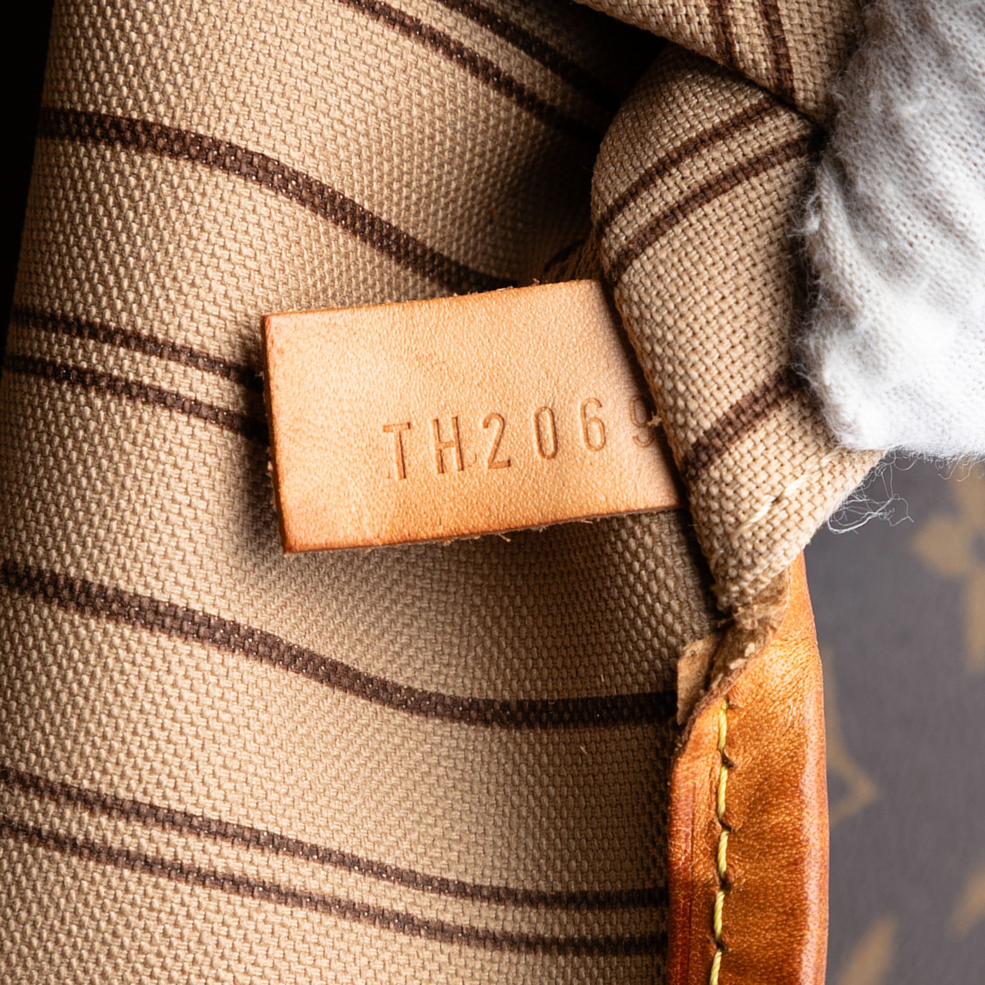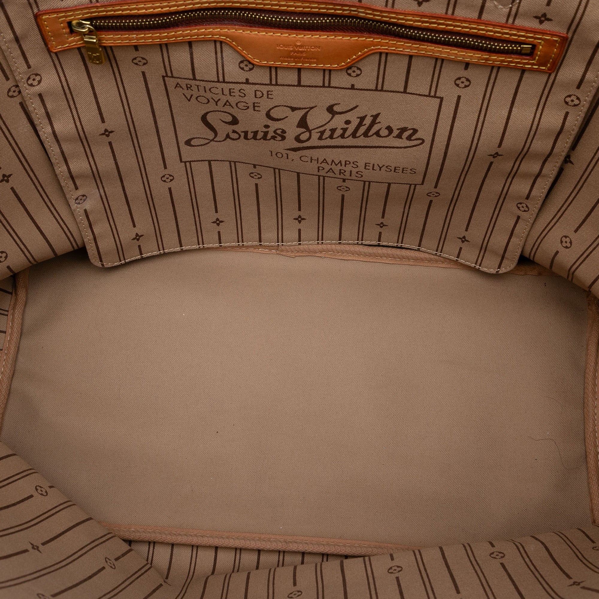 The Neverfull GM features a monogram canvas body with vachetta leather trim, flat vachetta leather straps, an open top with a lobster clasp closure, and an interior zip pocket. Retail Price: 1825.00