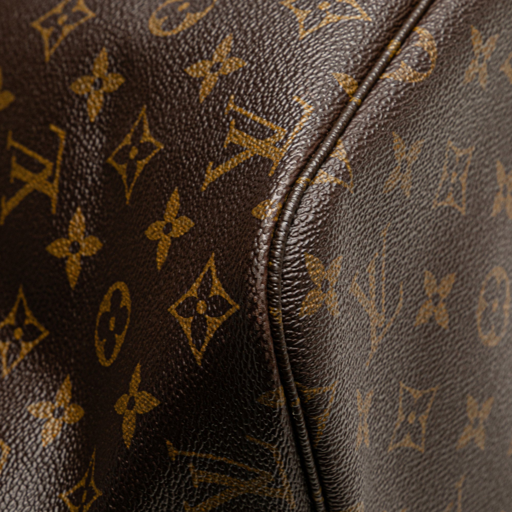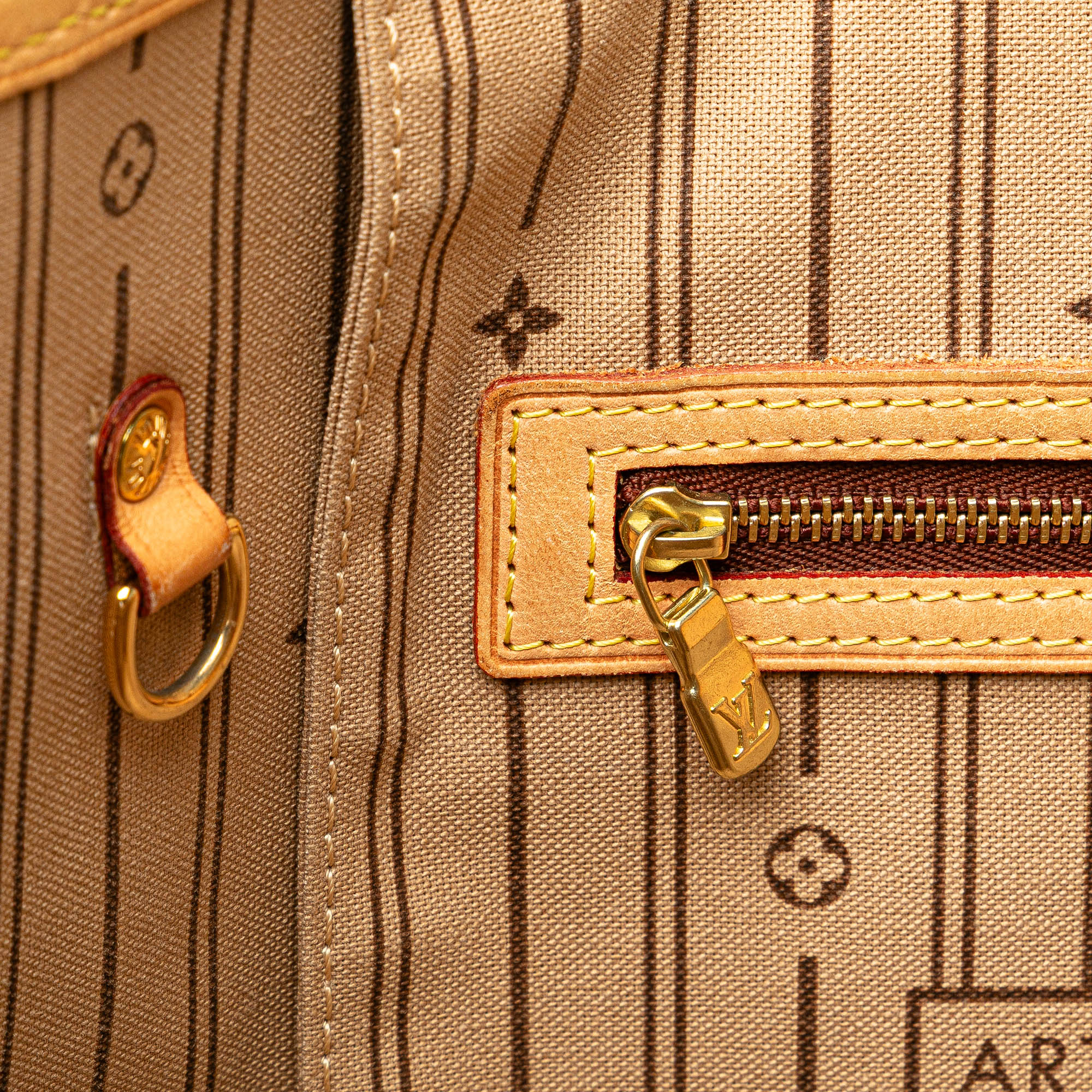 The Neverfull MM features a monogram canvas body with vachetta leather trim, flat vachetta leather handles, an open top with a lobster clasp closure, and an interior zip pocket. Inclusion: Dust bag. Retail Price: 2030.00