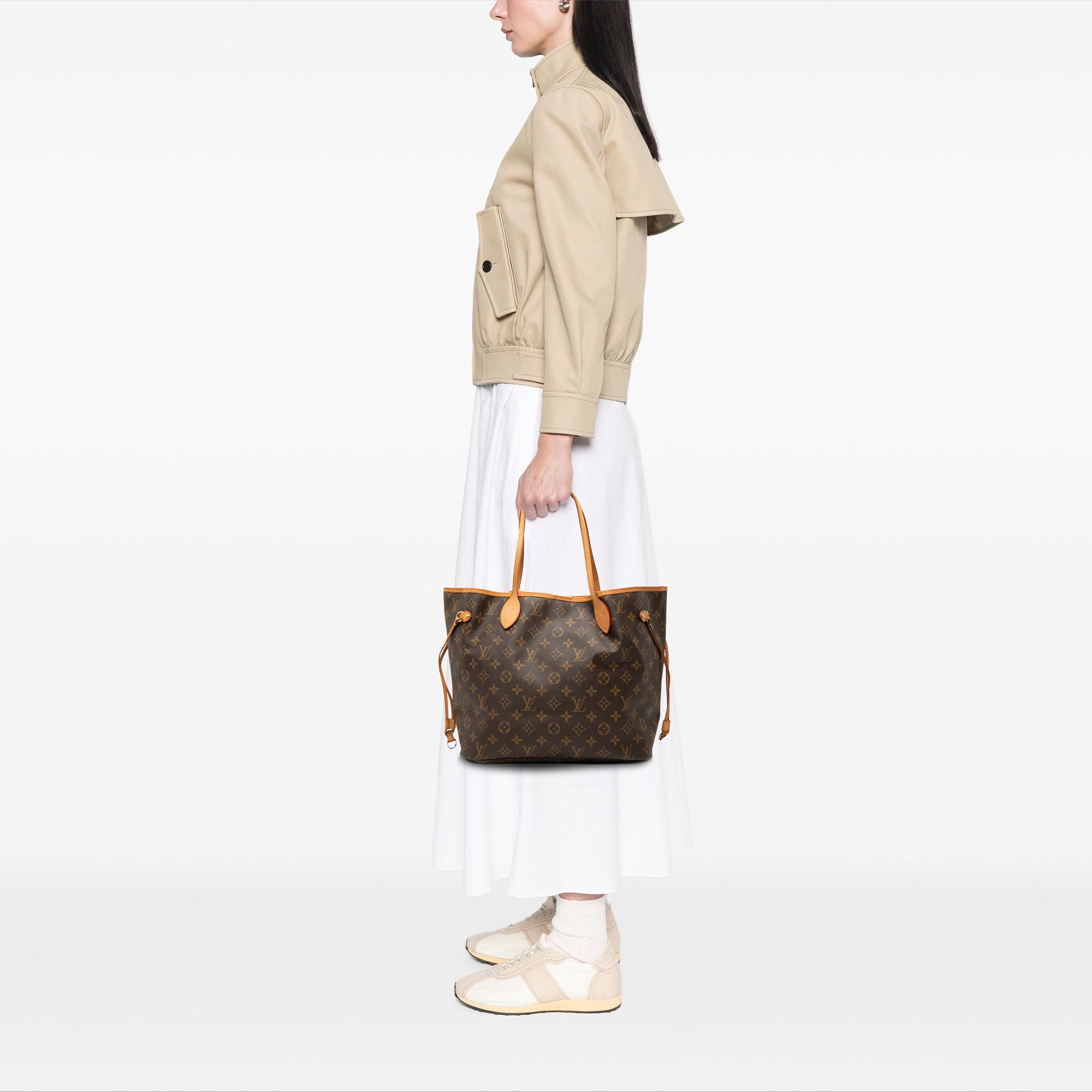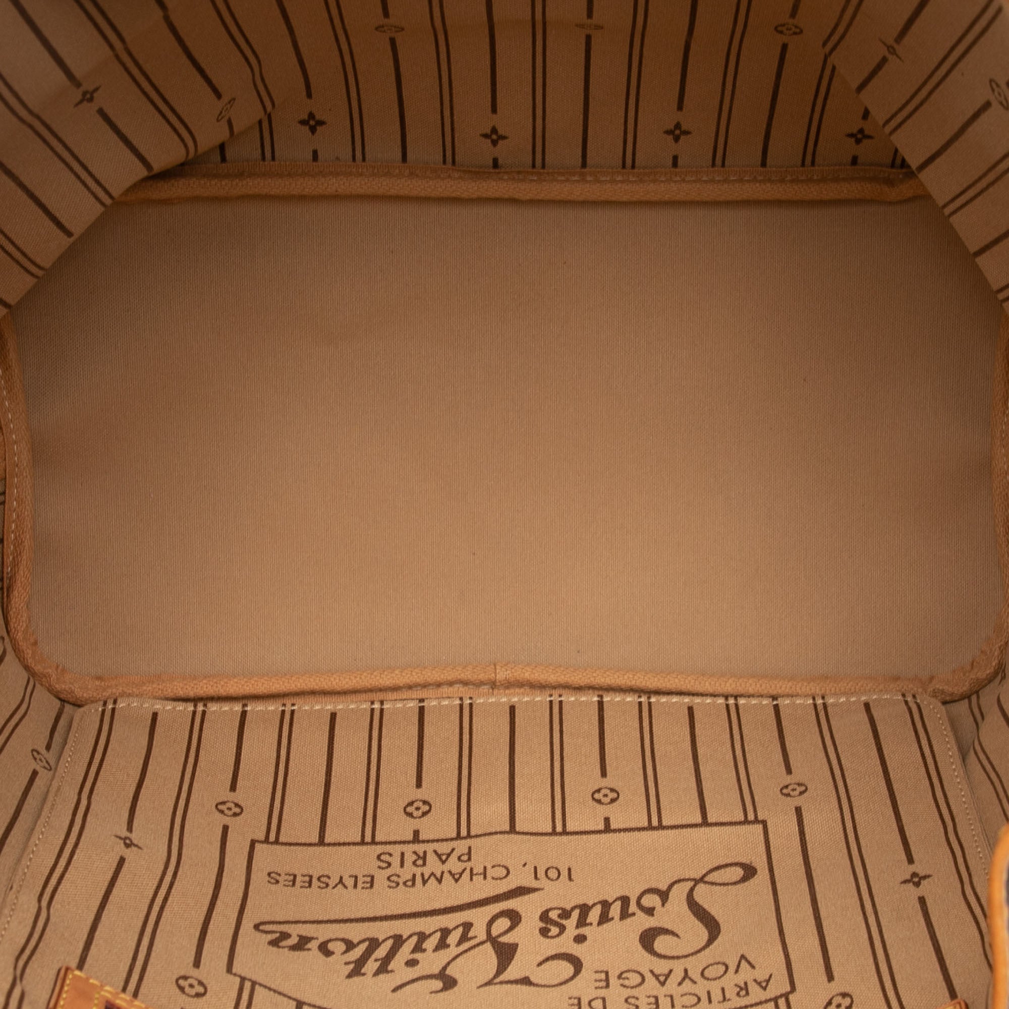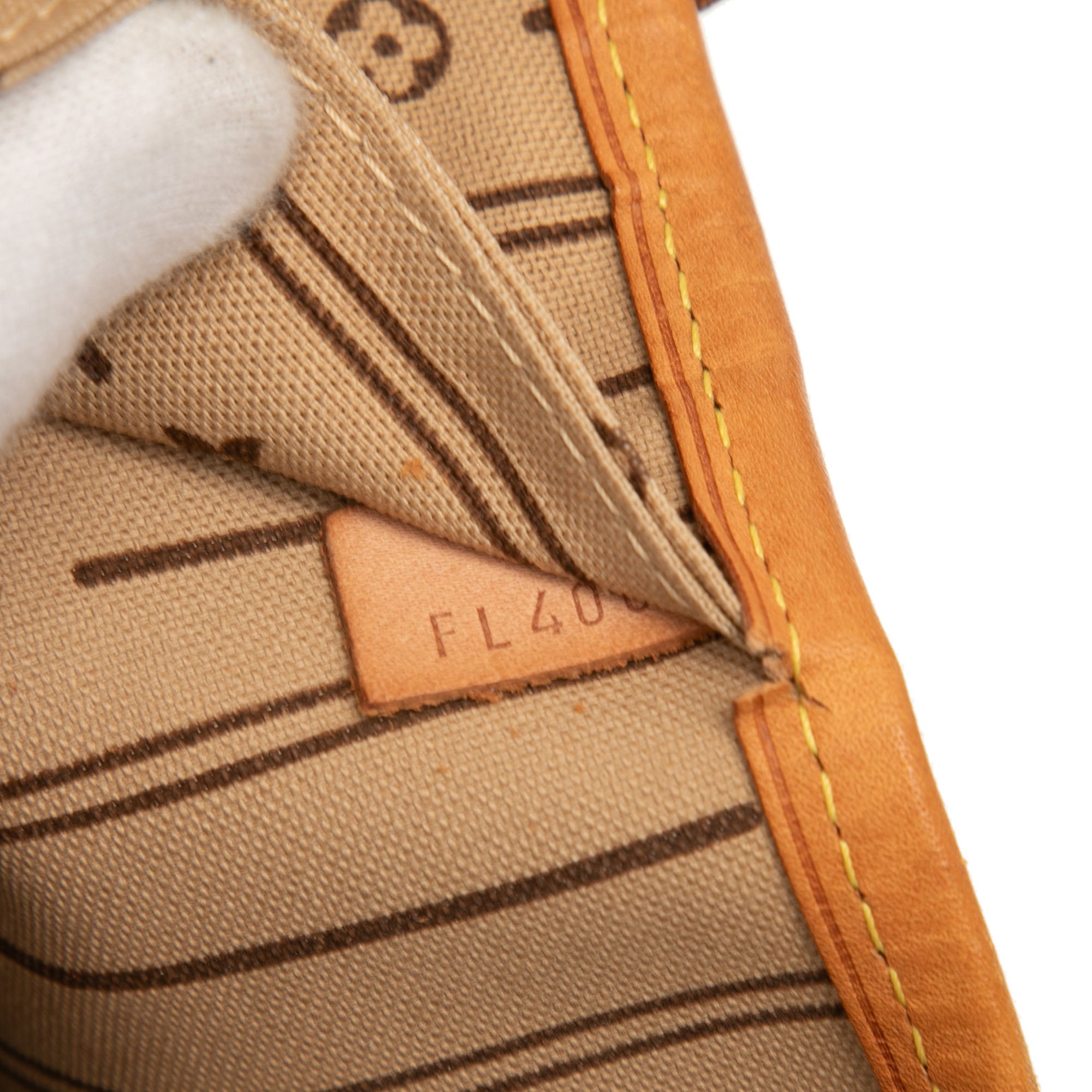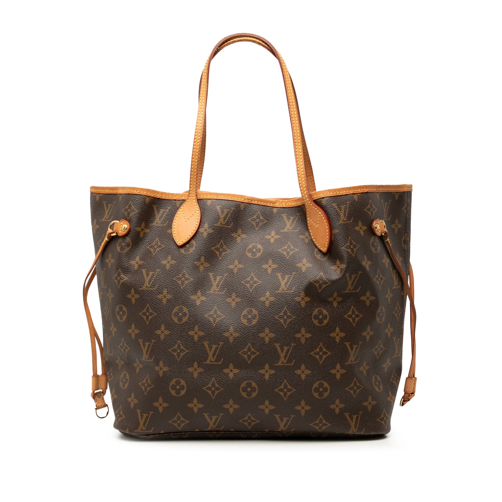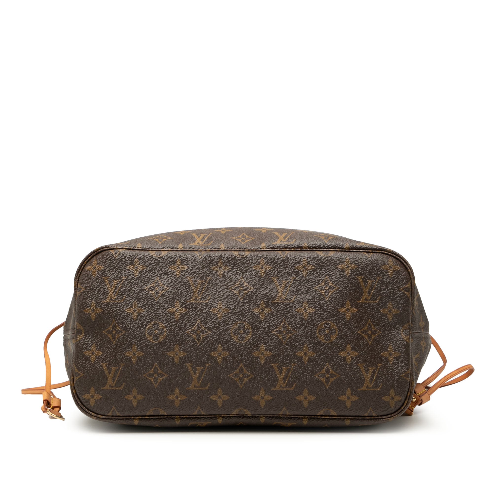 The Neverfull MM features a monogram canvas body with vachetta leather trim, flat vachetta leather straps, an open top with lobster claw clasp closure, and an interior zip pocket. Retail Price: 2030.00