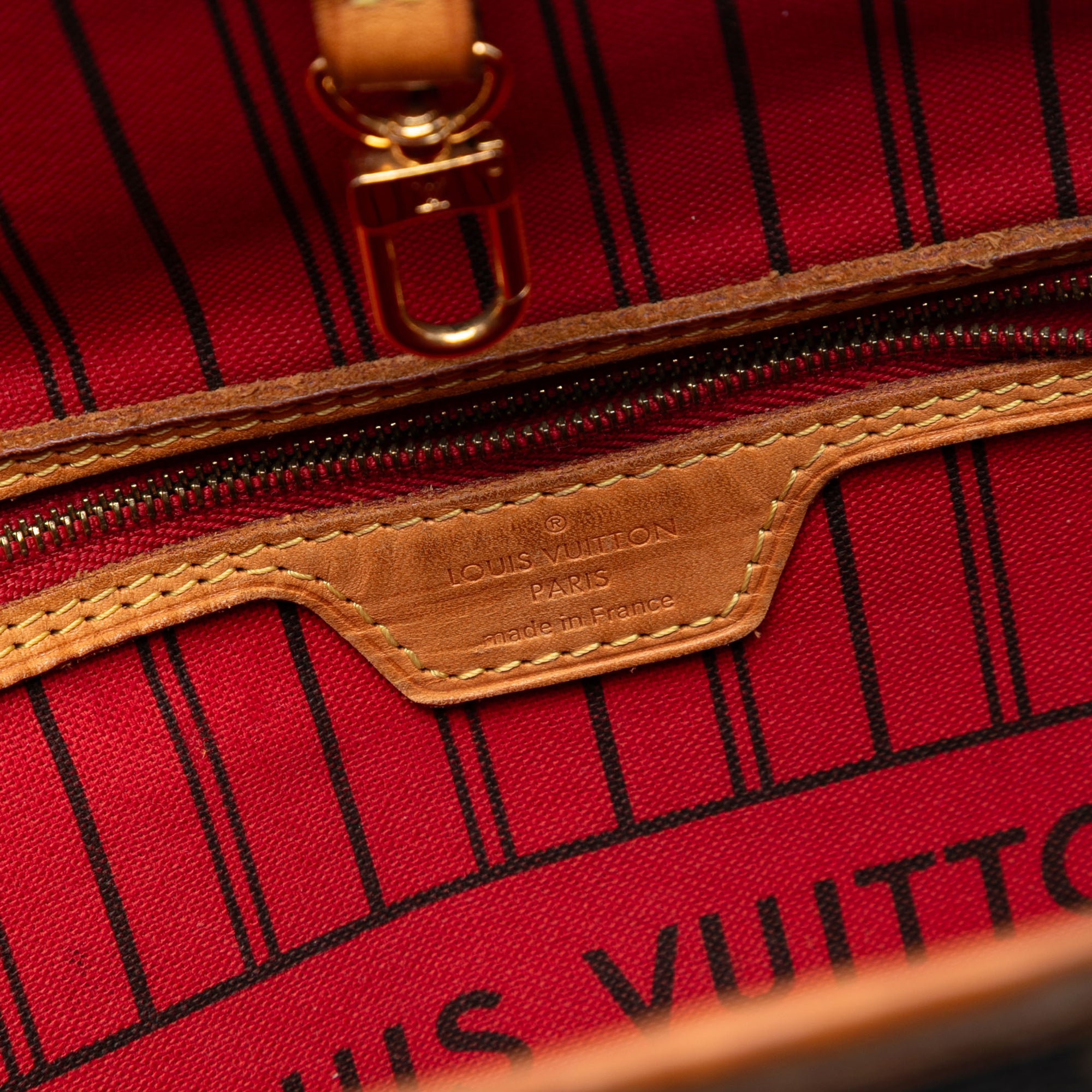 The Neverfull MM features a monogram canvas body, flat vachetta leather handles, a top lobster claw clasp closure, and an interior zip pocket. Retail Price: 2030.00