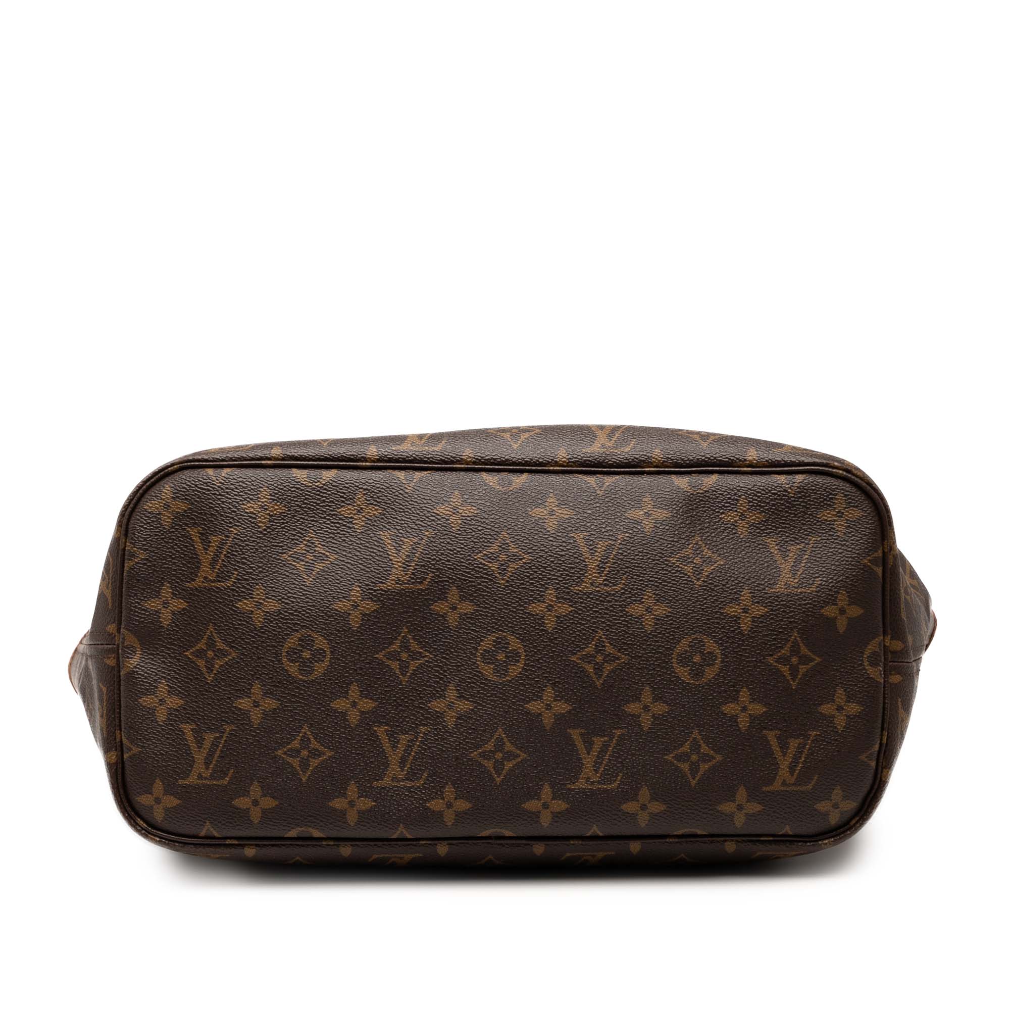 The Neverfull MM features a monogram canvas body with vachetta leather trim, flat vachetta leather handles, an open top with a lobster clasp closure, an interior zip pocket, and a pouch inclusion. Retail Price: 2030.00