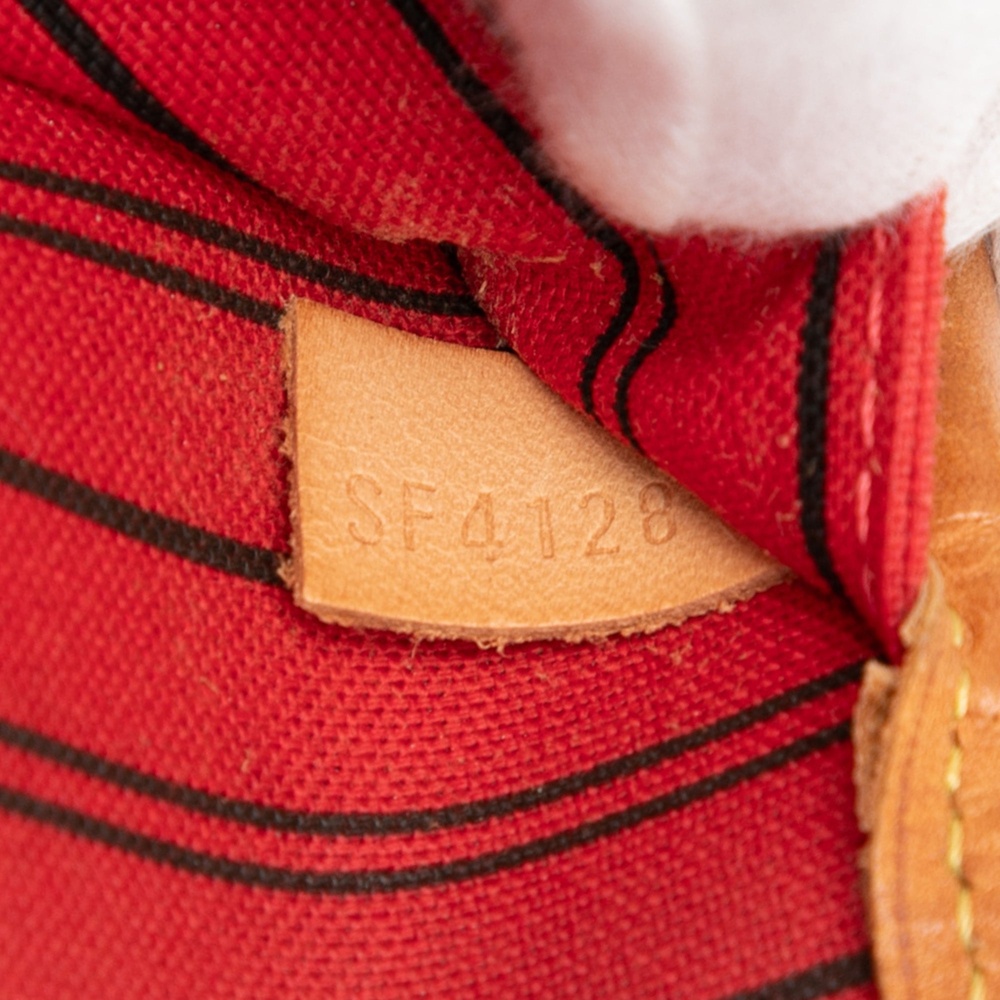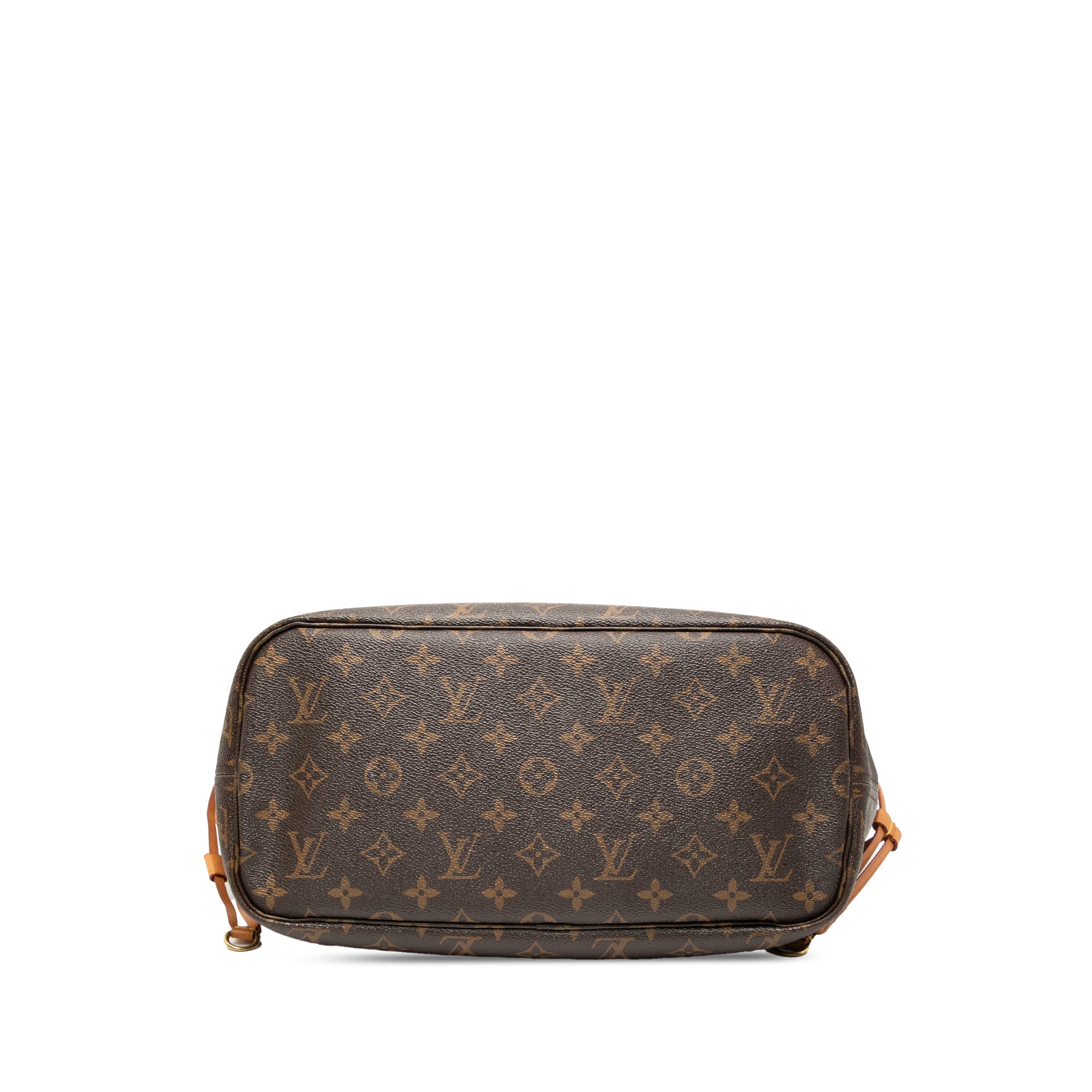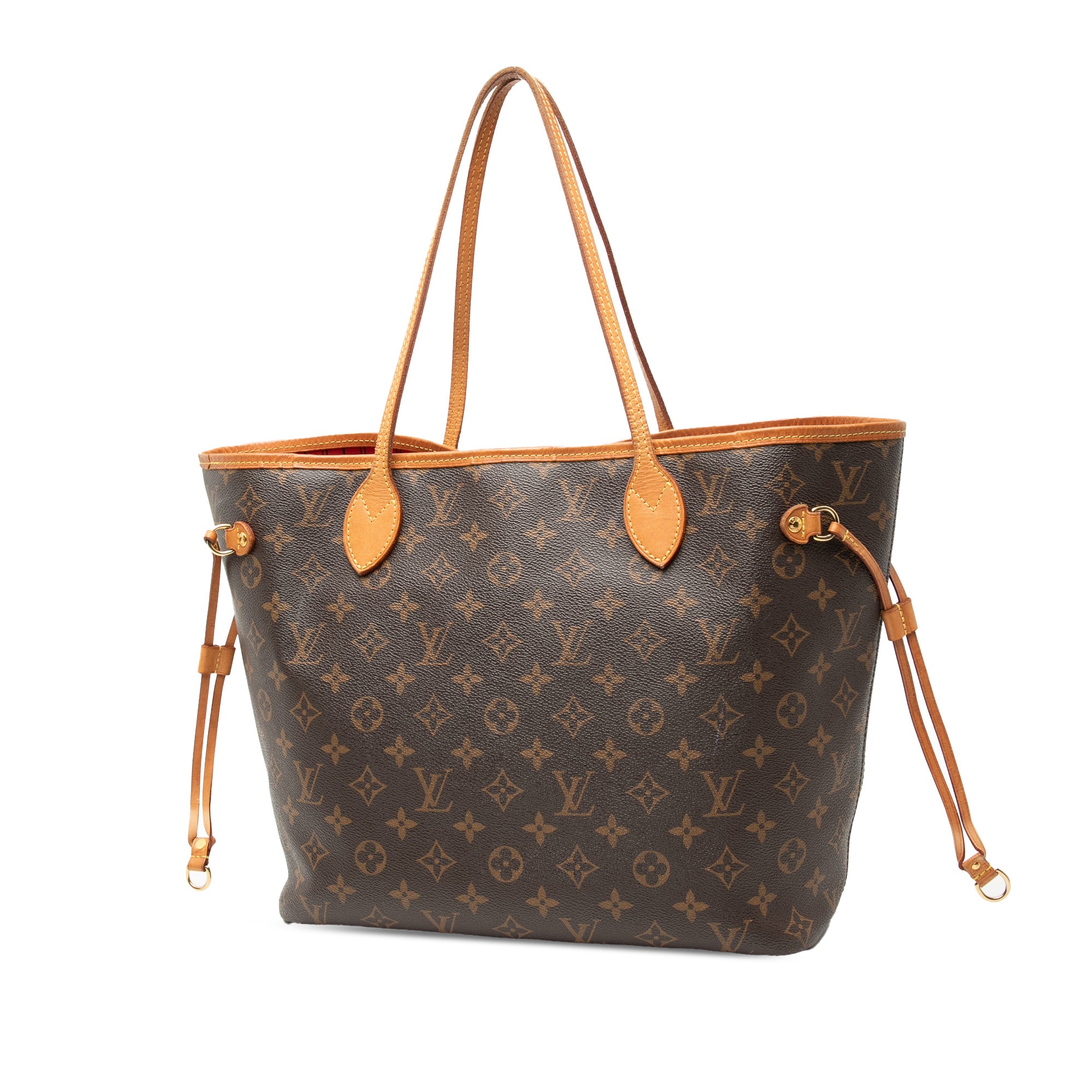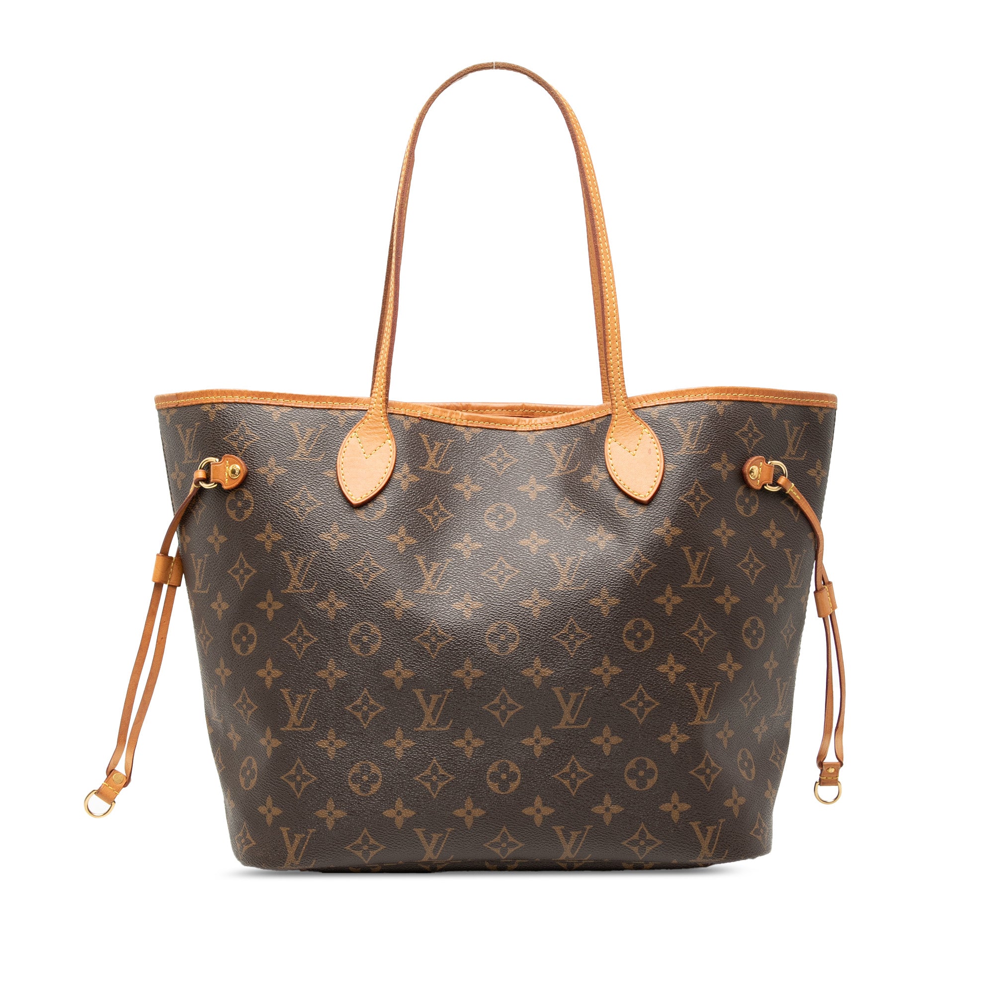 The Neverfull MM features a monogram canvas body with vachetta leather trim, flat vachetta leather handles, a top lobster claw clasp closure, and an interior zip pocket. Retail Price: 2030.00
