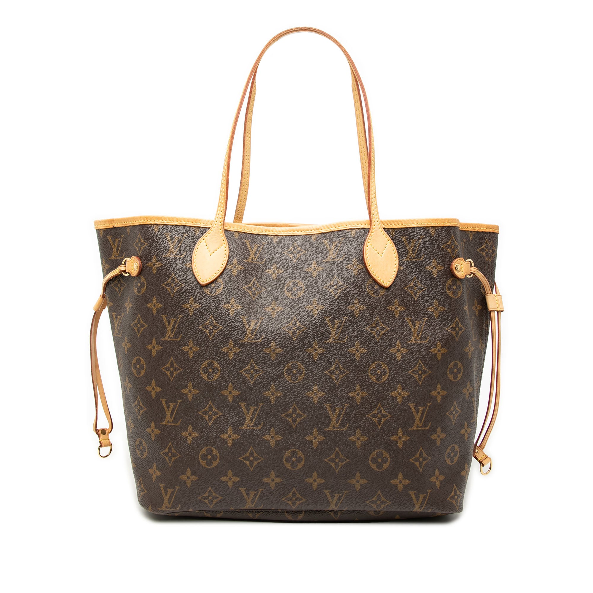 The Neverfull MM features a monogram canvas body with vachetta leather trim, flat vachetta leather handles, an open top with a lobster clasp closure, and an interior zip pocket. Retail Price: 2030.00