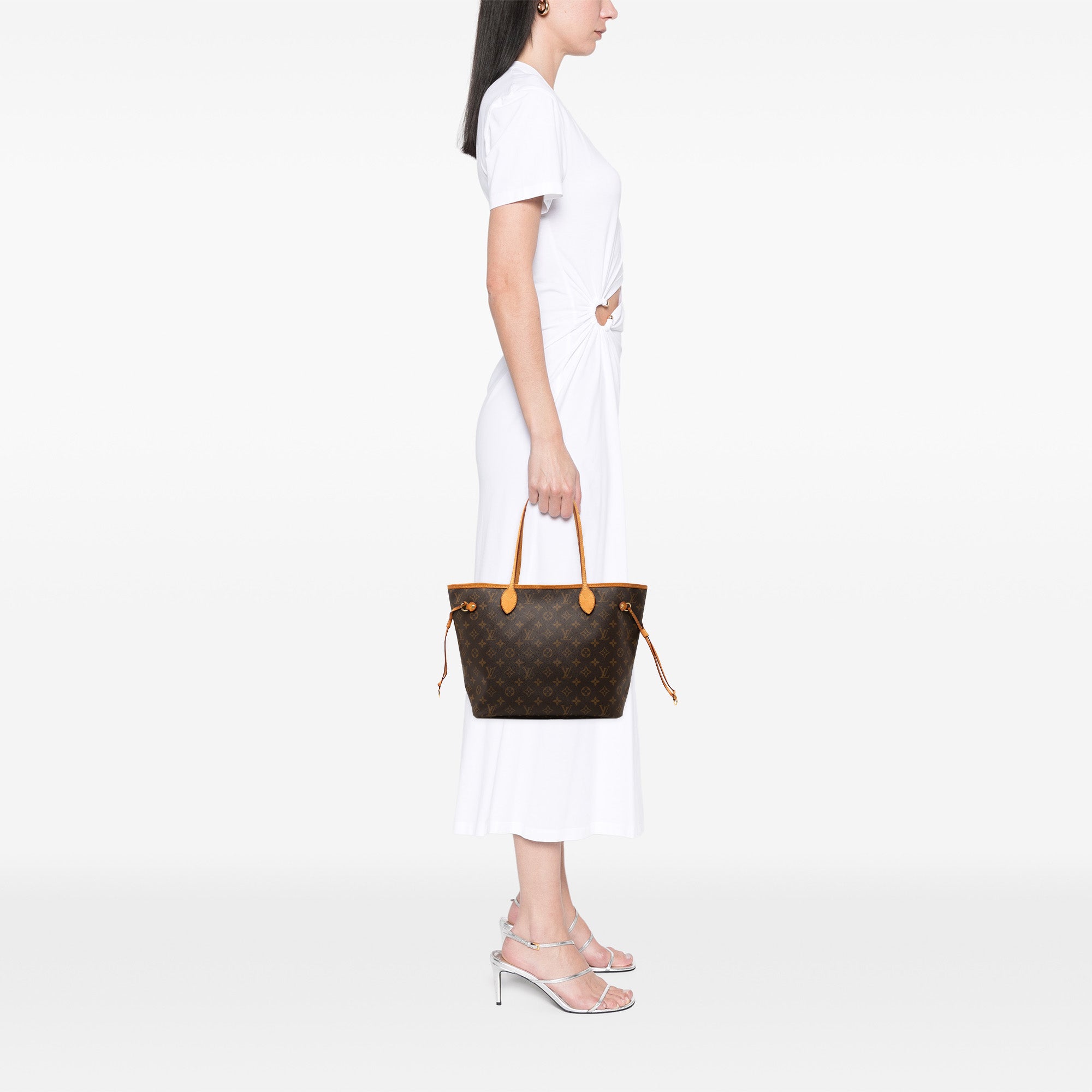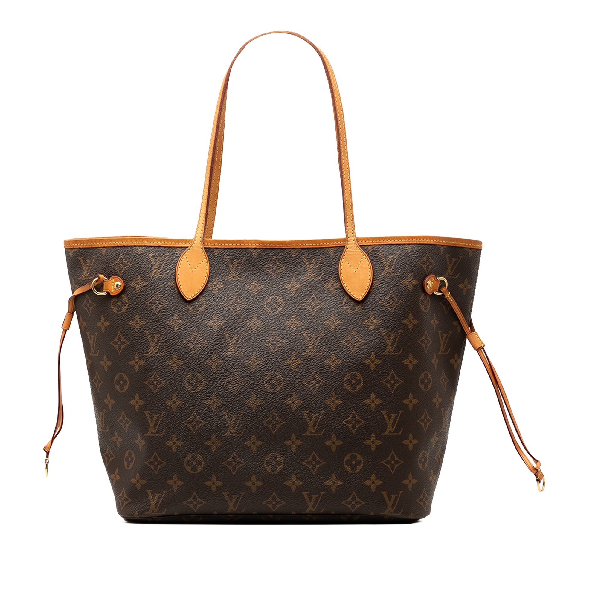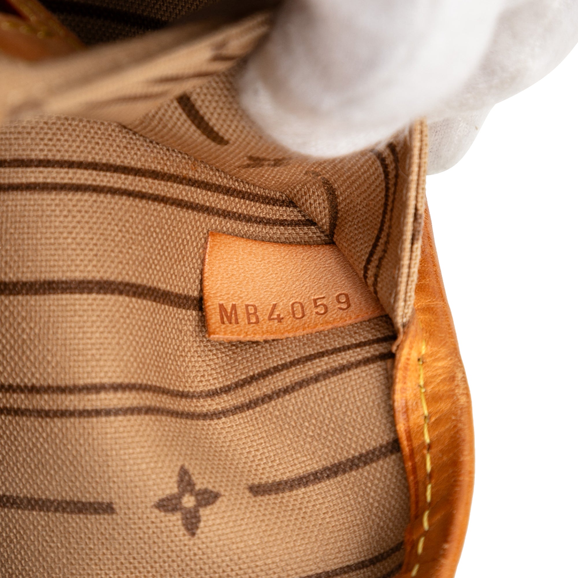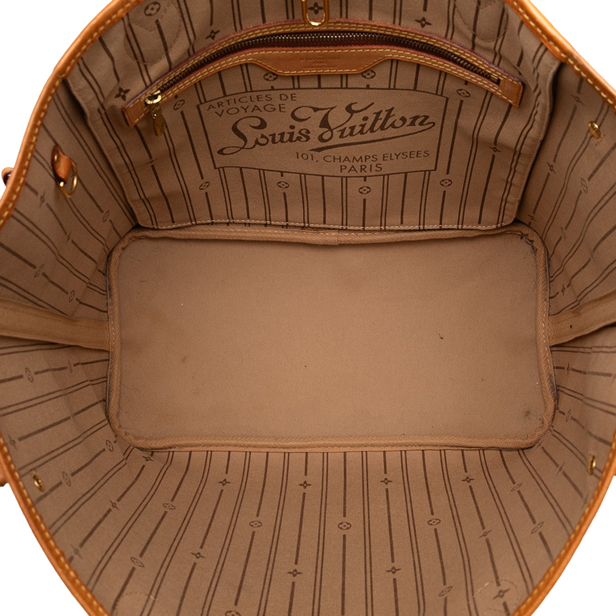 The Neverfull MM features a monogram canvas body with vachetta leather trim, flat vachetta leather handles, an open top with a lobster clasp closure, and an interior zip pocket. Inclusion: Dust bag. Retail Price: 2030.00