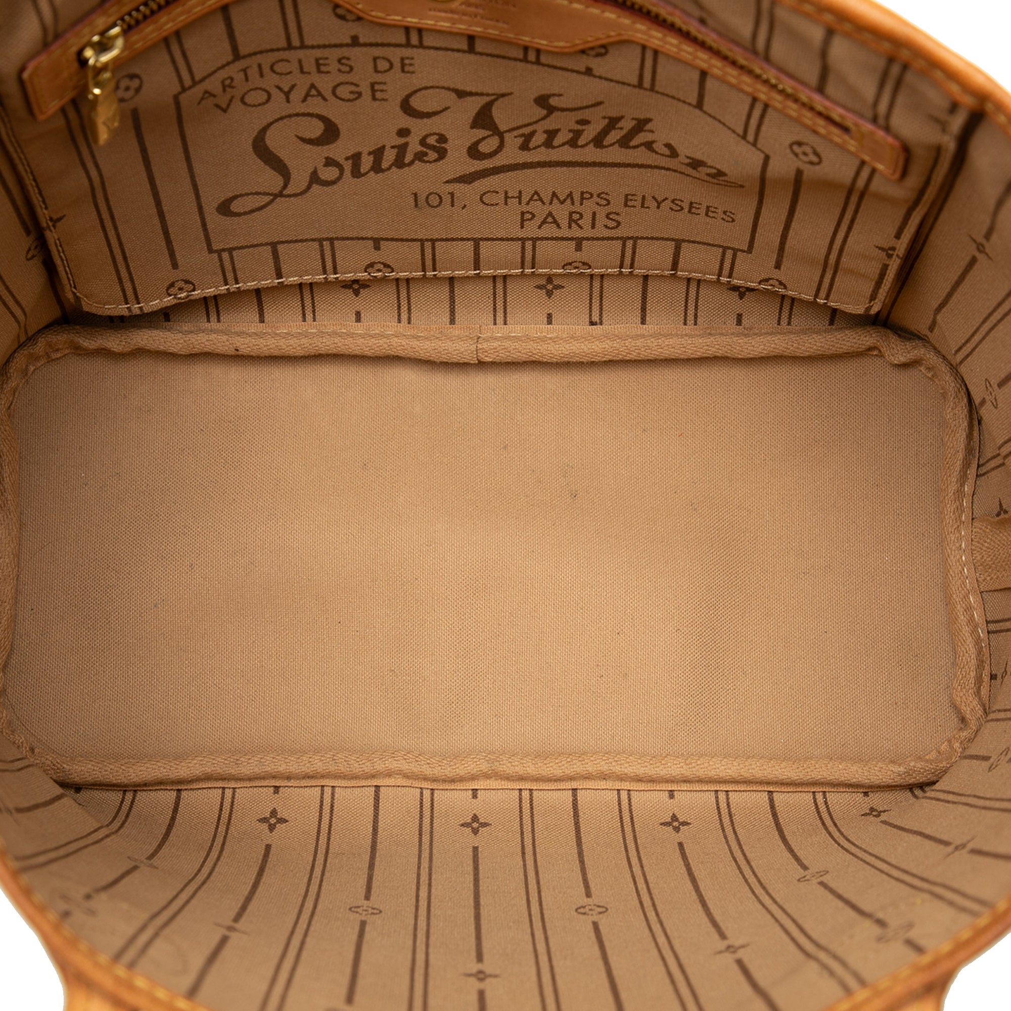 The Neverfull PM features a monogram canvas body with vachetta leather trim, flat vachetta leather handles, an open top with a lobster clasp closure, and an interior zip pocket. Retail Price: 1960.00