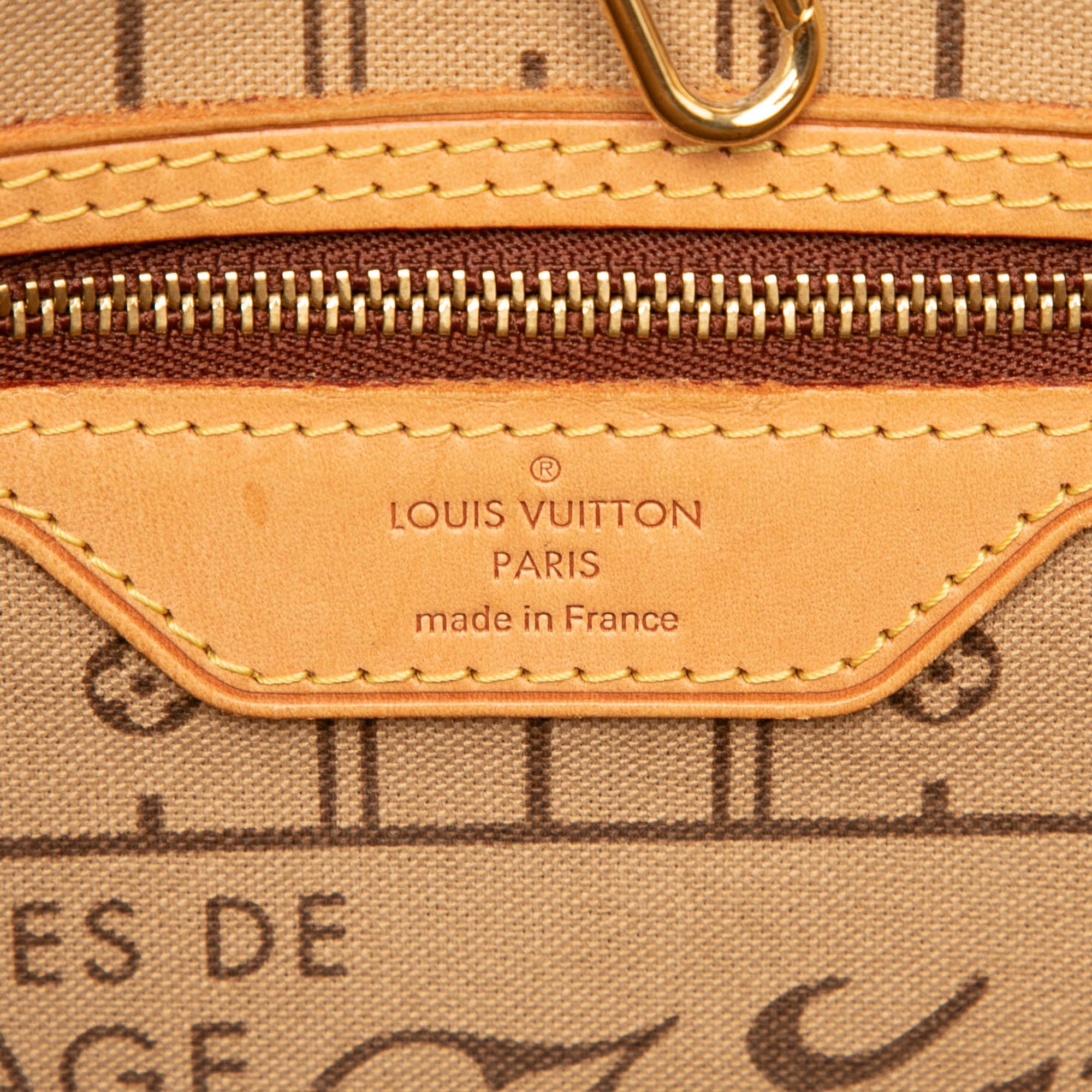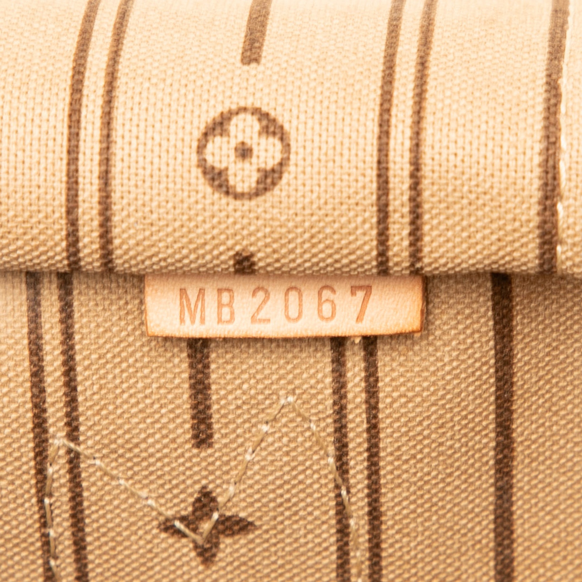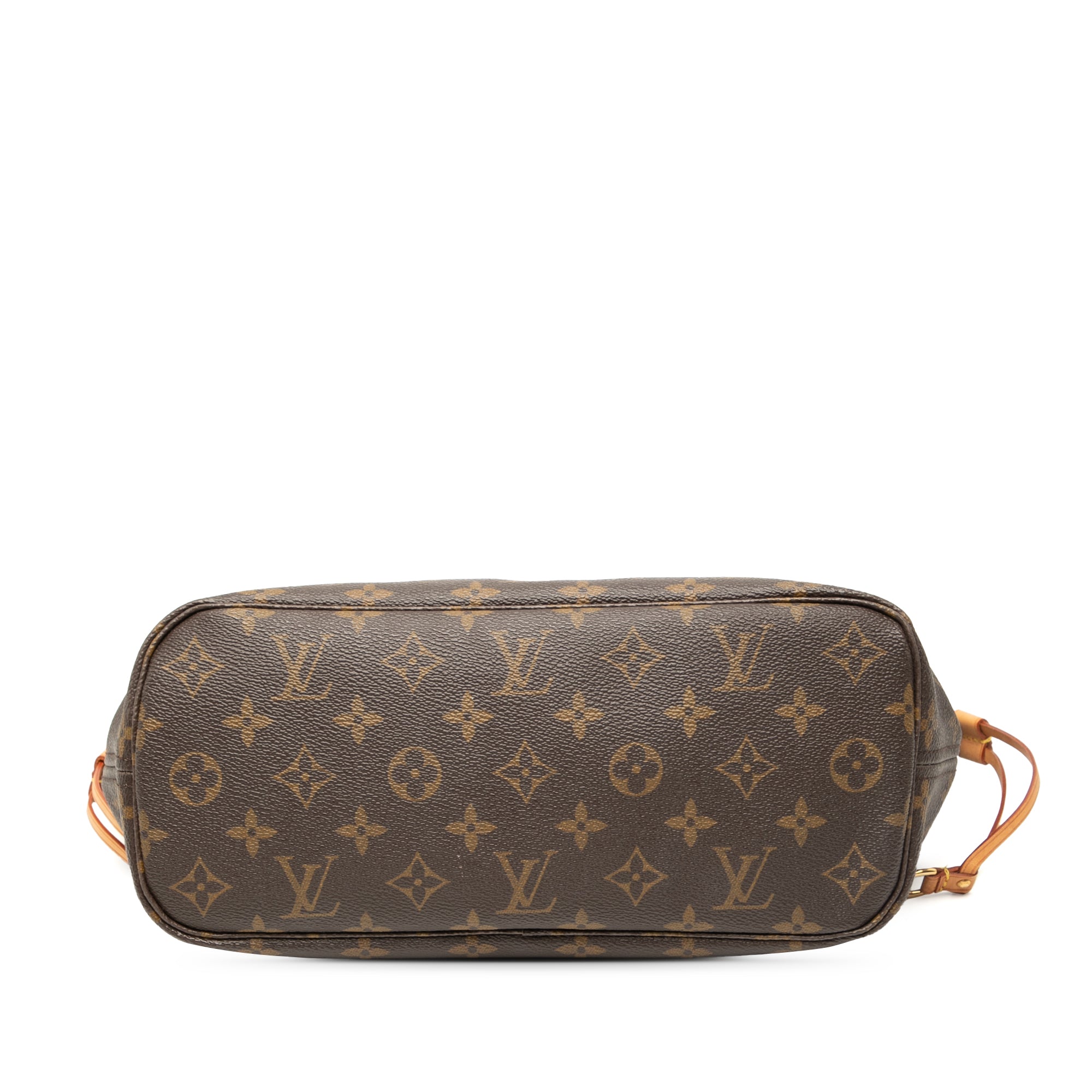 The Neverfull PM features a monogram canvas body with vachetta leather trim, flat vachetta leather handles, an open top with a lobster clasp closure, and an interior zip pocket. Retail Price: 1960.00