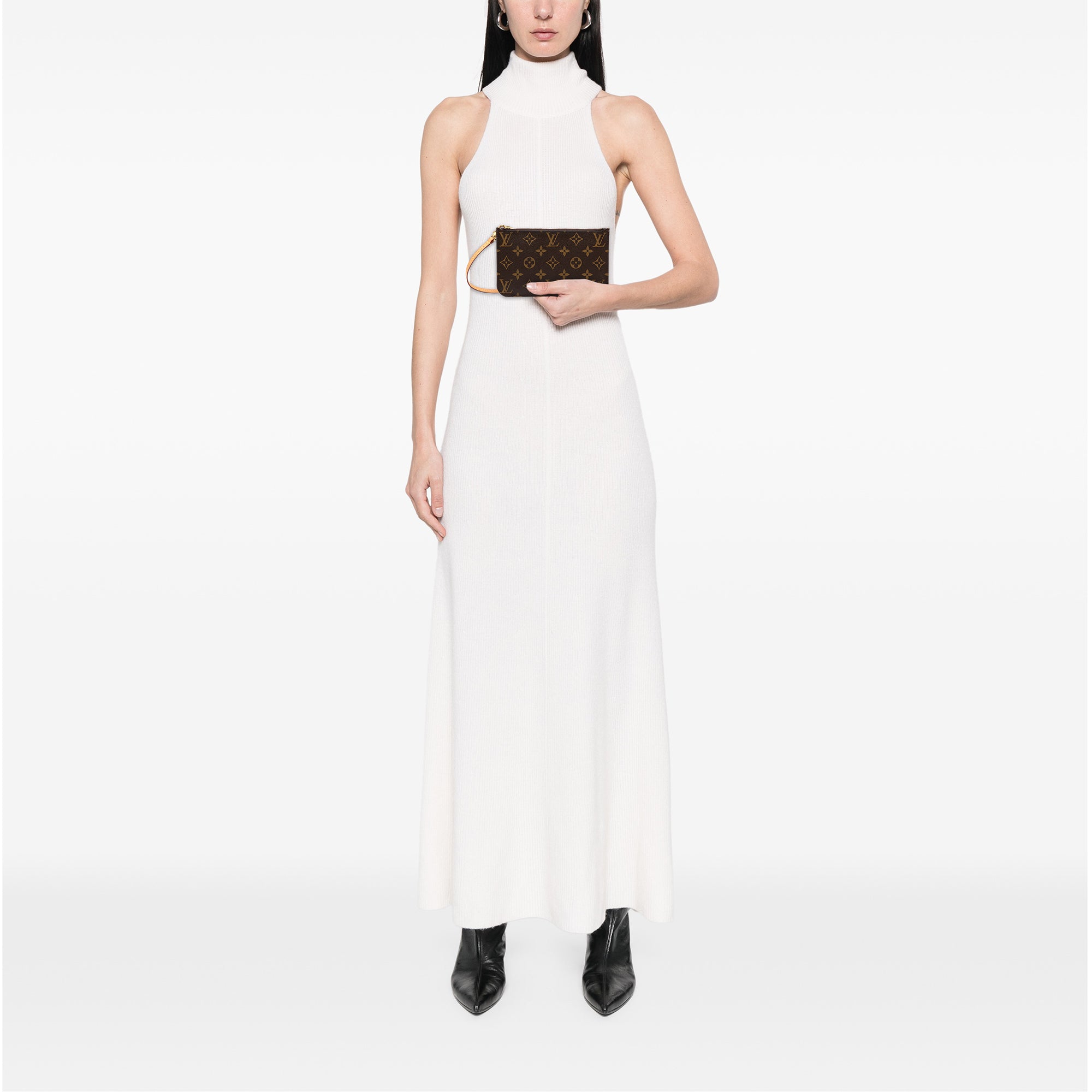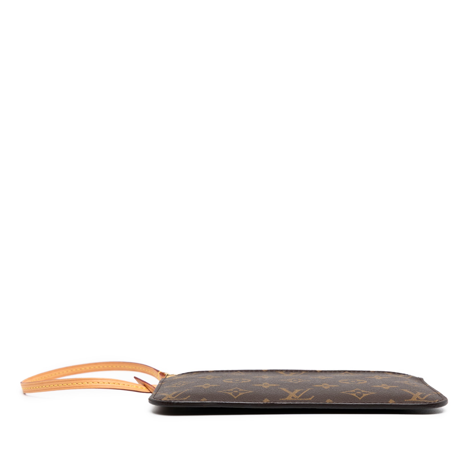 The Neverfull Pouch features a monogram canvas body, a flat vachetta leather wrist strap, a top zip closure, and an interior slip pocket. Retail Price: 1380.00