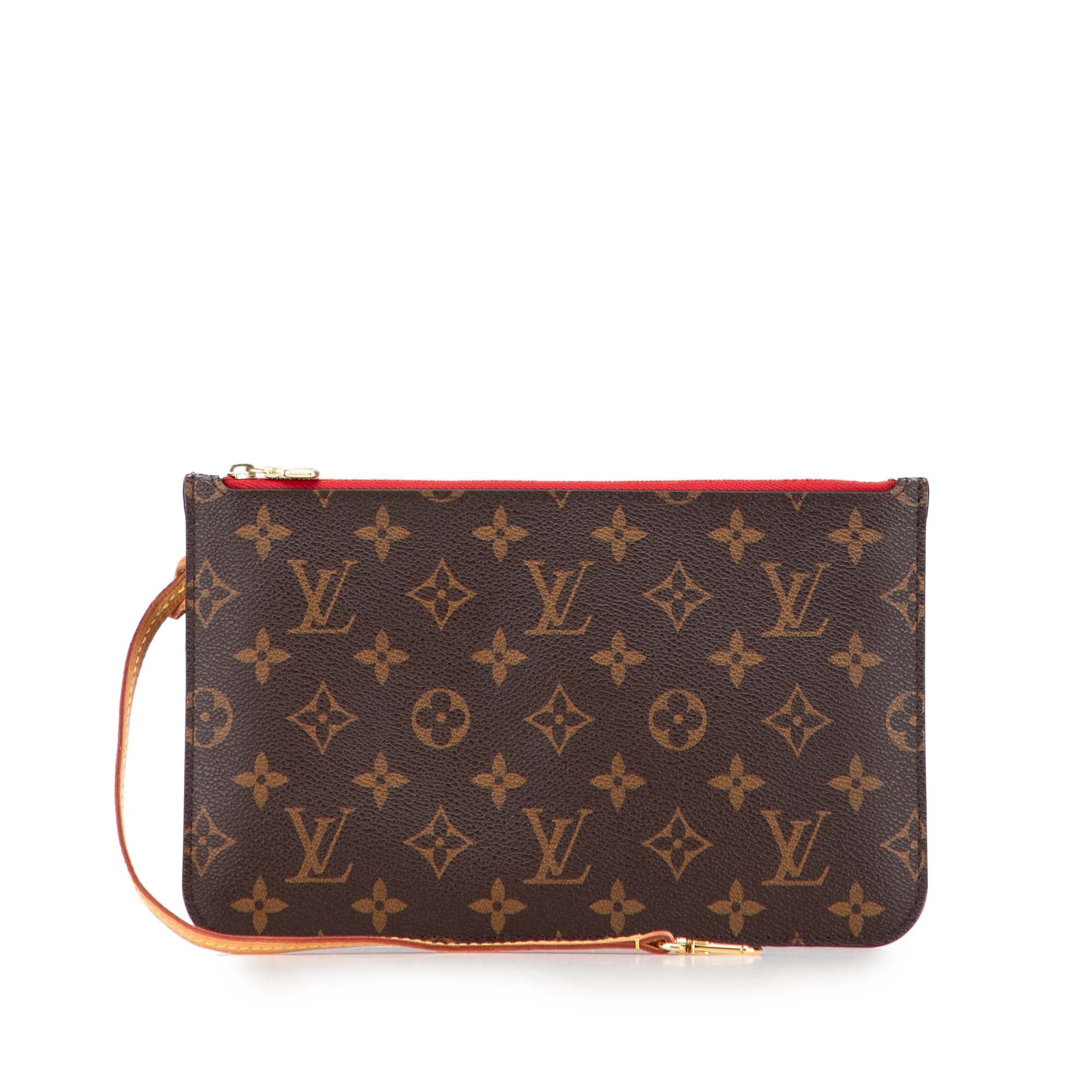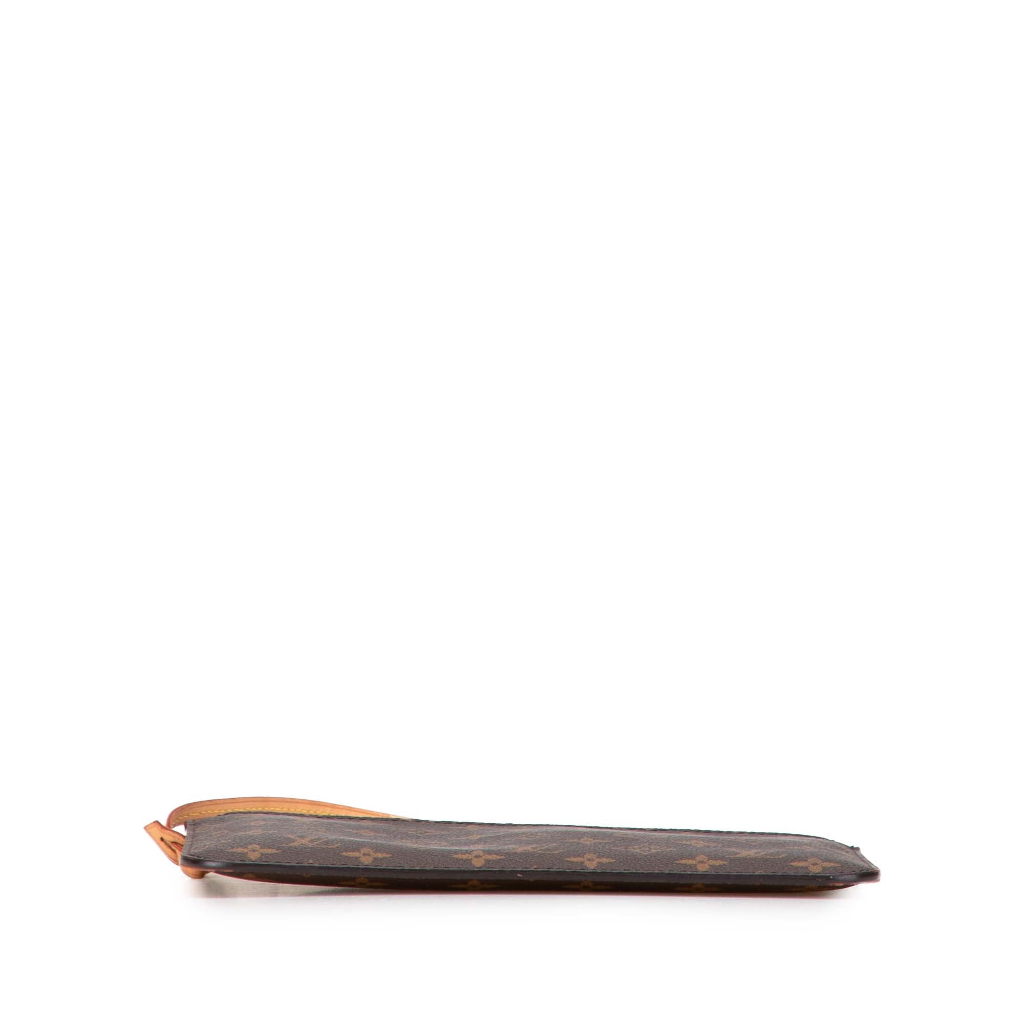 This pouch features a monogram canvas body, a flat vachetta leather wrist strap, a top zip closure, and an interior slip pocket. Retail Price: 850.00