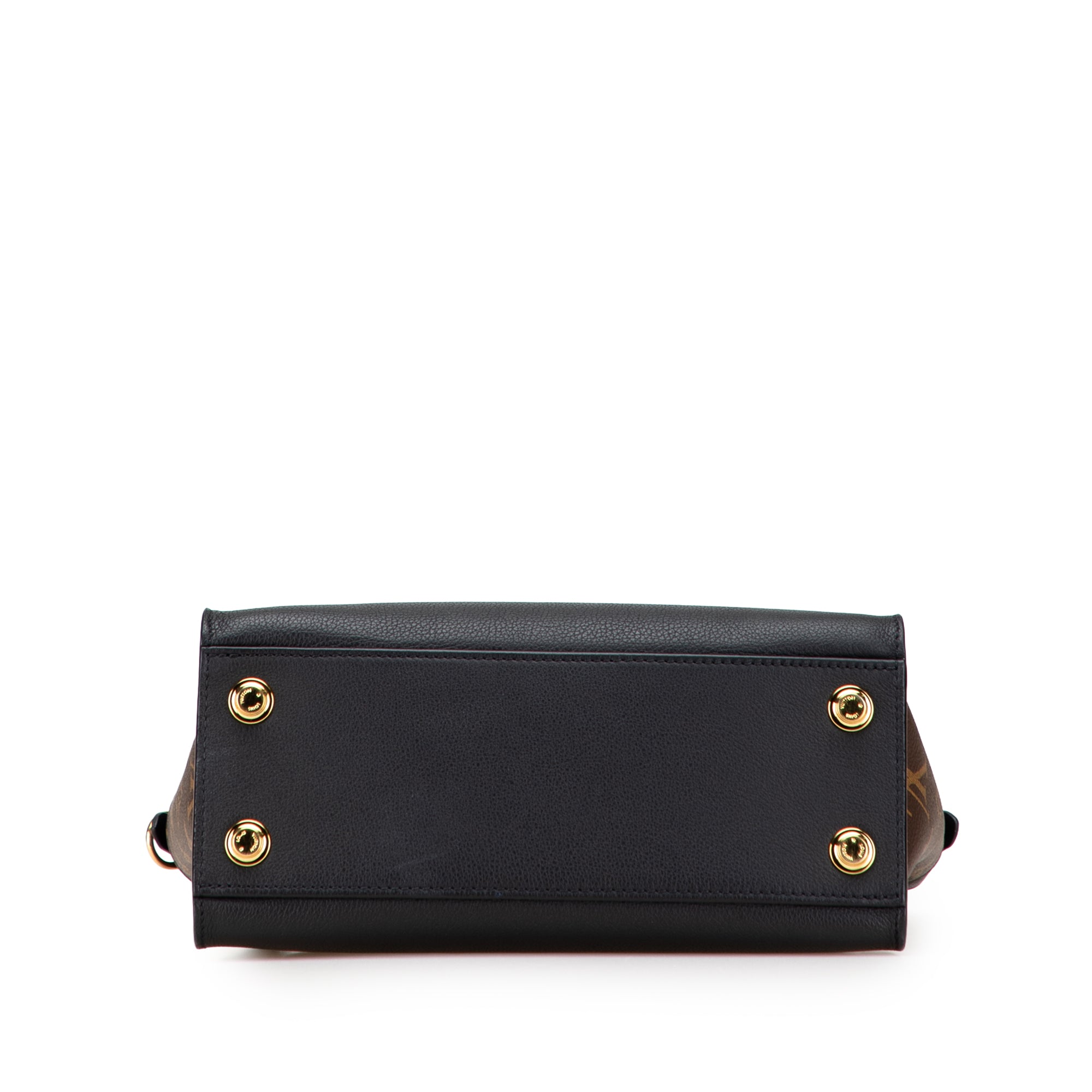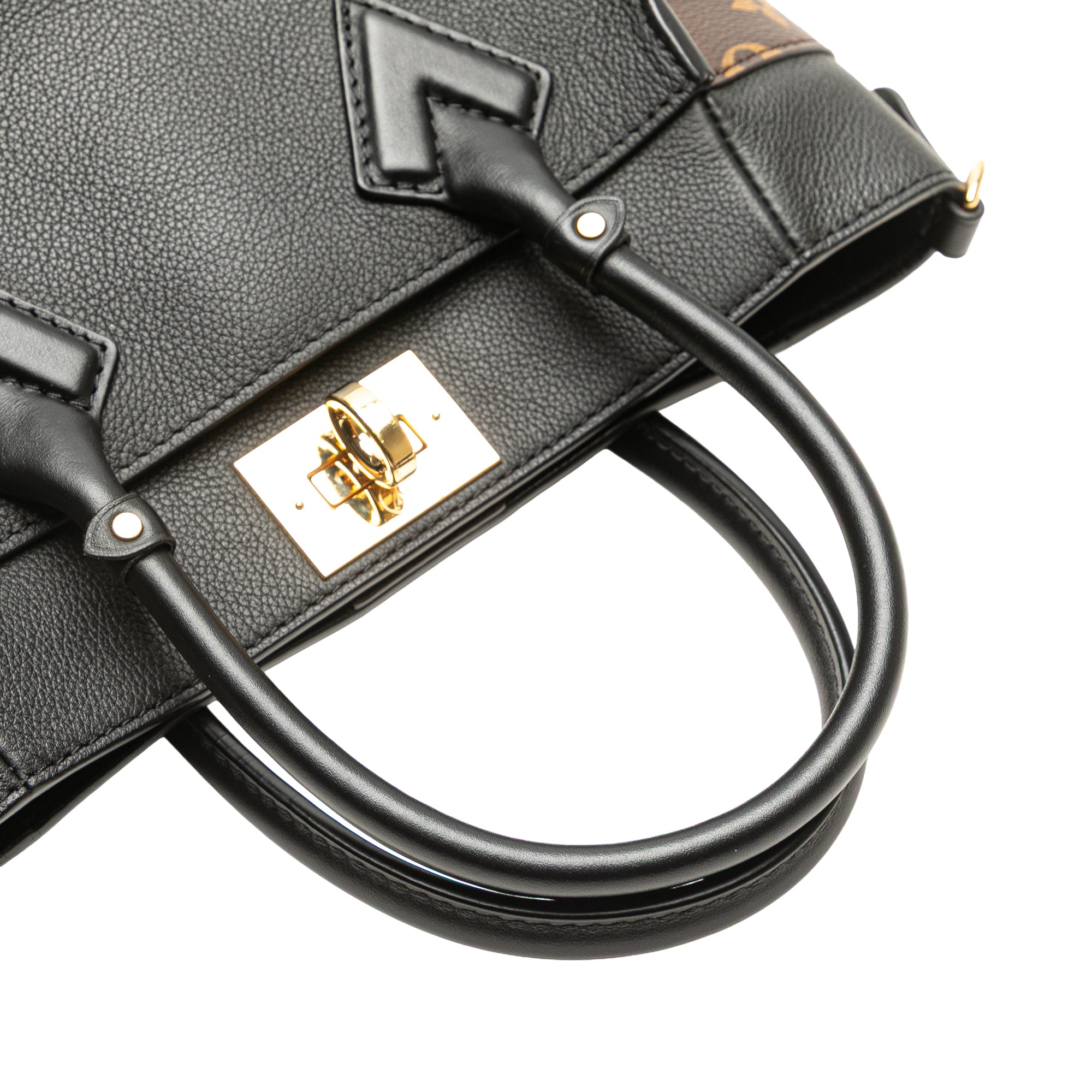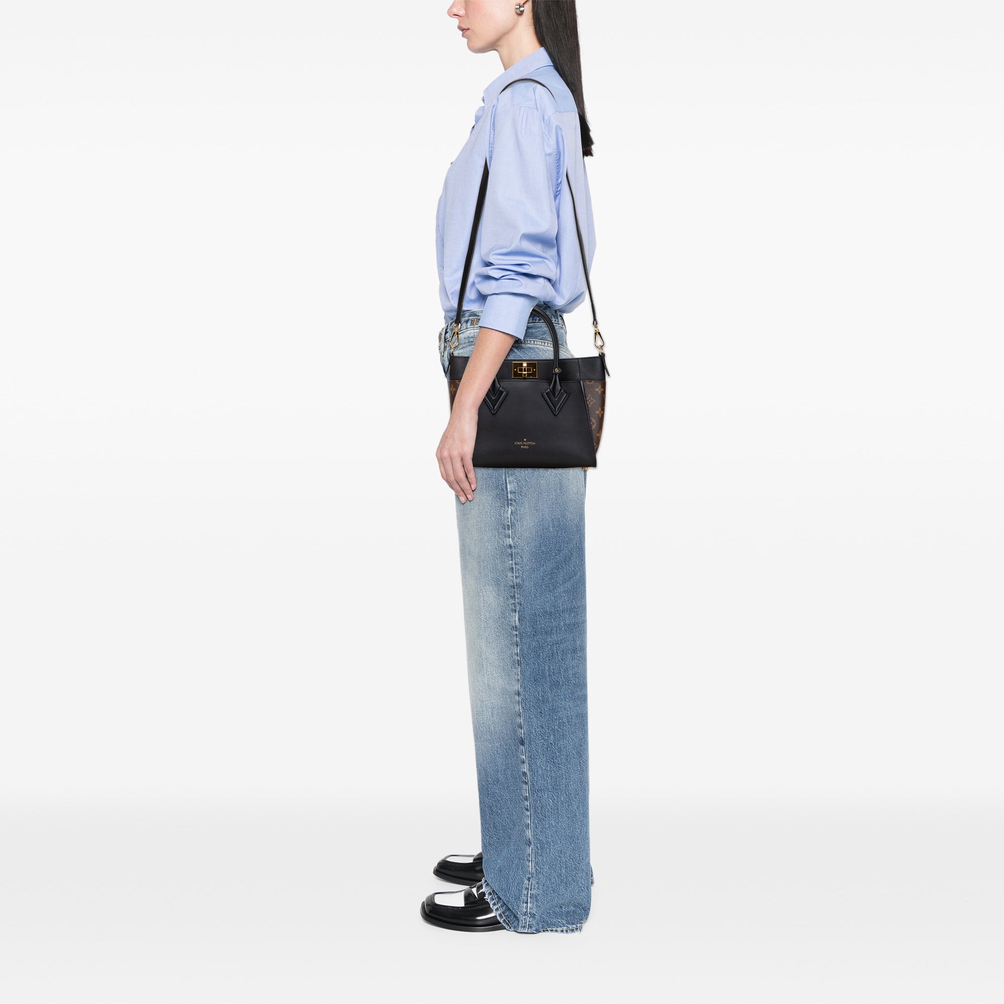 The On My Side PM features a leather body with monogram canvas side panels, rolled leather handles, a detachable flat leather strap, an open top with twist lock closure, exterior slip pockets, and interior slip and zip pockets. Retail Price: 5100.00