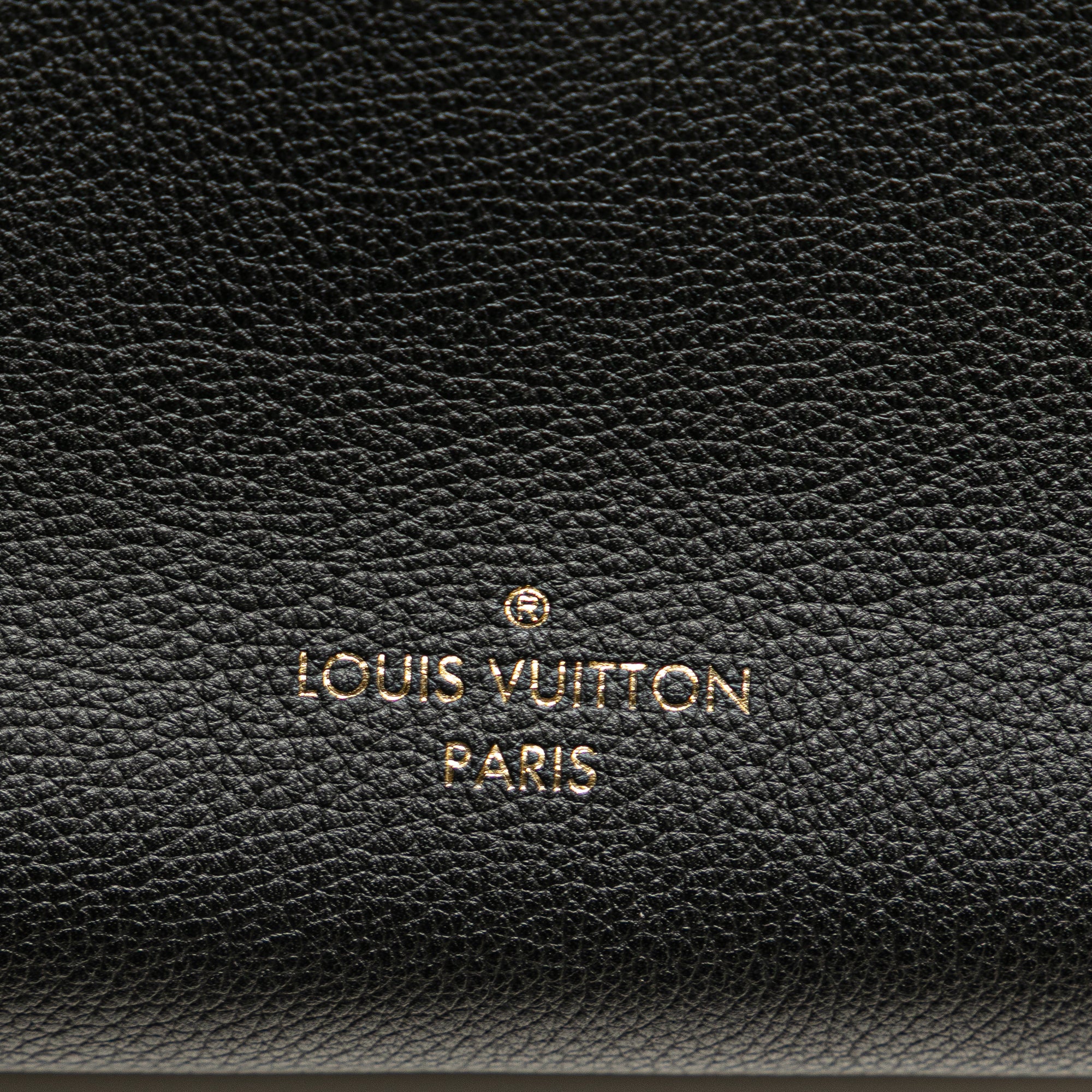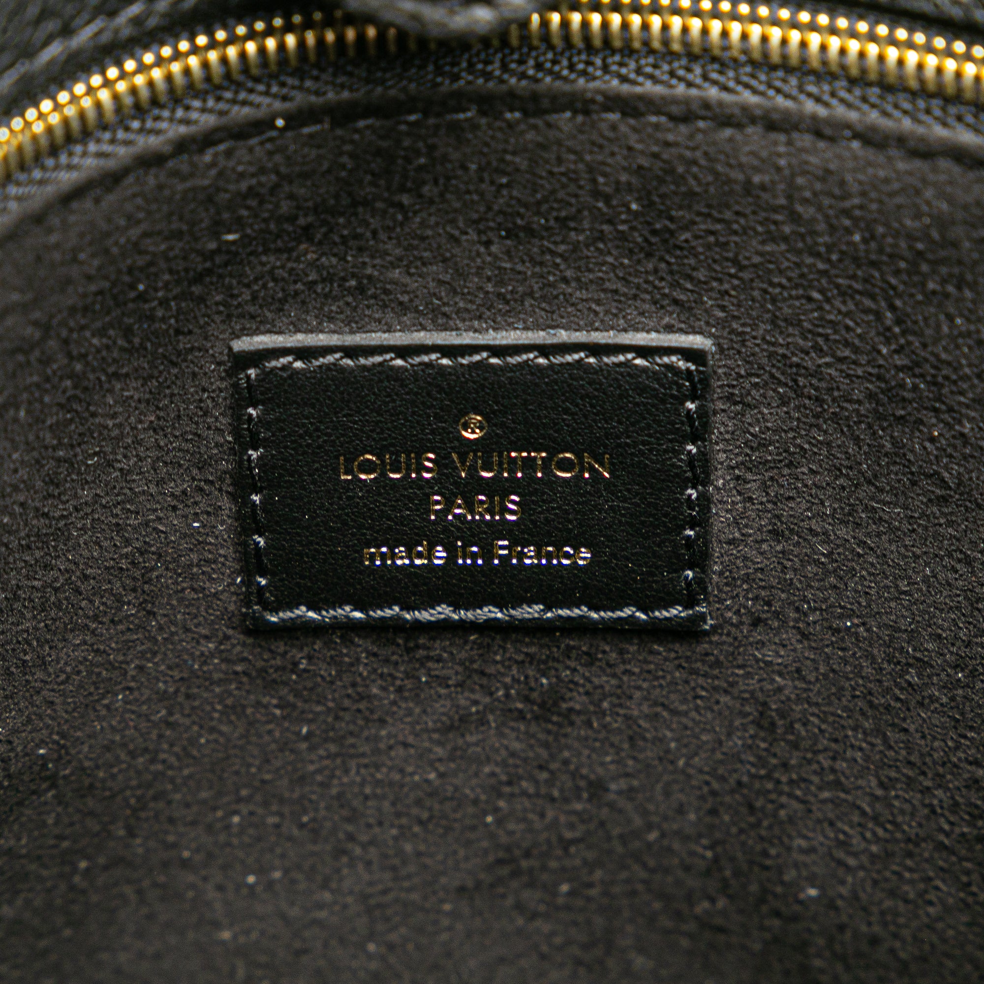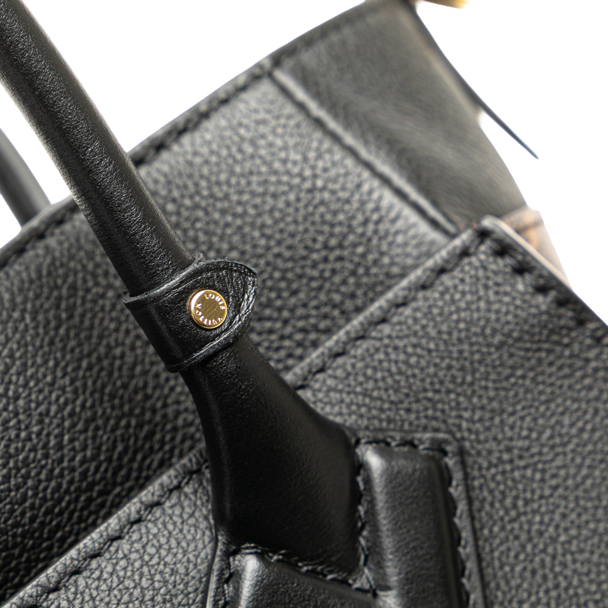 The On My Side PM features a leather body with monogram canvas side panels, rolled leather handles, a detachable flat leather strap, an open top with twist lock closure, exterior slip pockets, and interior slip and zip pockets. Retail Price: 5100.00