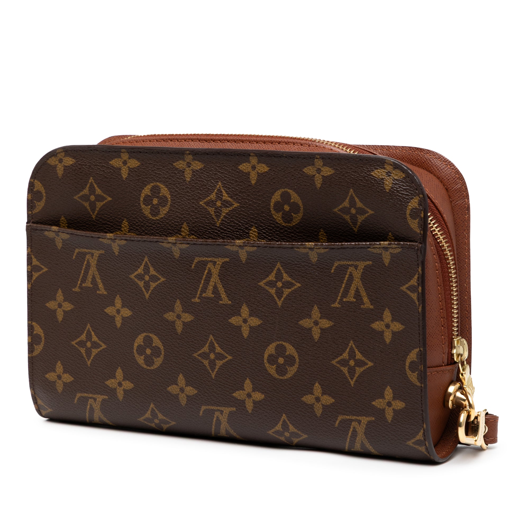 The Orsay features a monogram canvas body, a flat leather wrist strap, a zip-around closure, and an interior slip pocket. Retail Price: 975.00