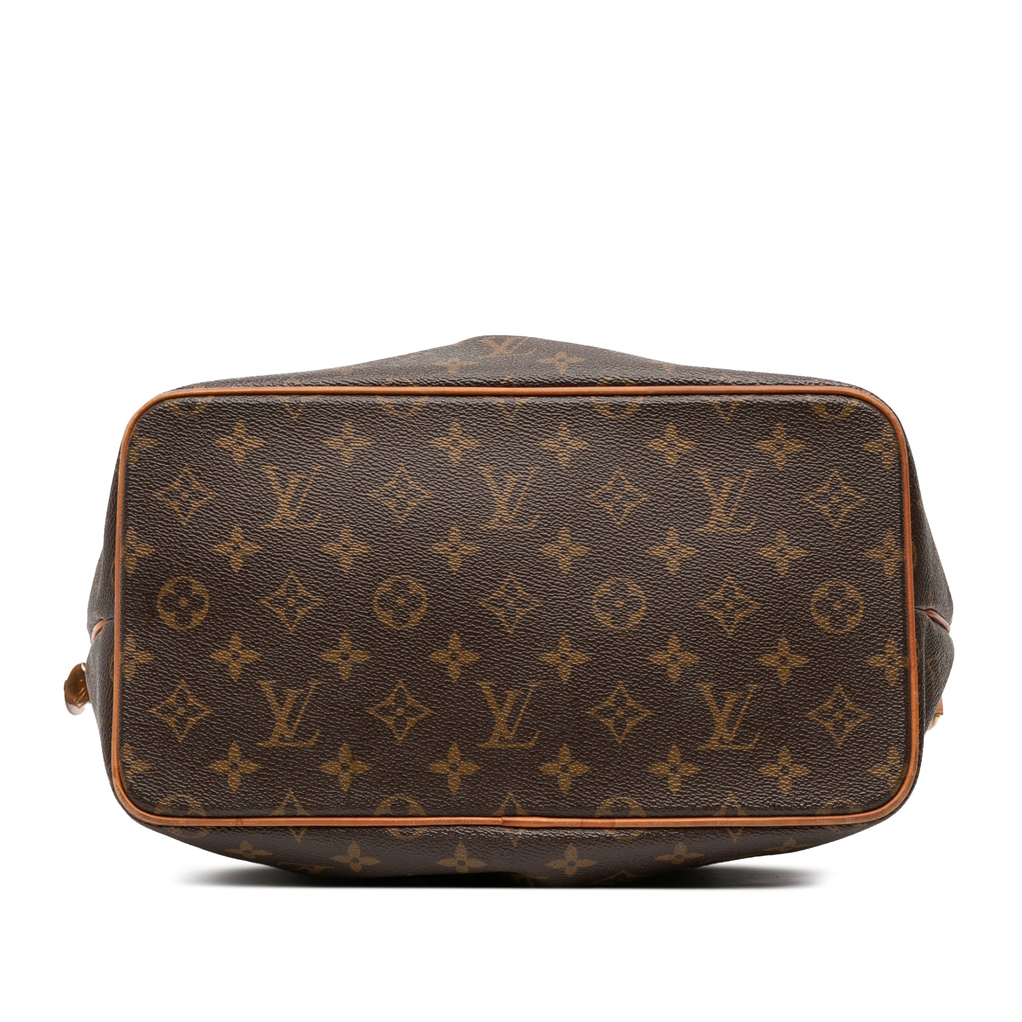The Palermo PM features a monogram canvas body with vachetta leather trim, flat vachetta leather handles, a detachable flat vachetta leather strap, a top zip closure, and interior slip pockets. Retail Price: 1250.00
