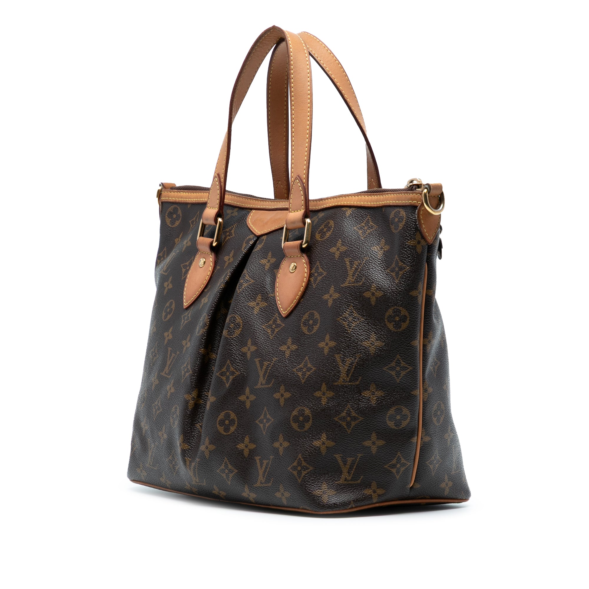 The Palermo PM features a monogram canvas body with vachetta leather trim, flat leather handles, a detachable flat leather strap, a top zip closure, and interior slip pockets. Retail Price: 1175.00