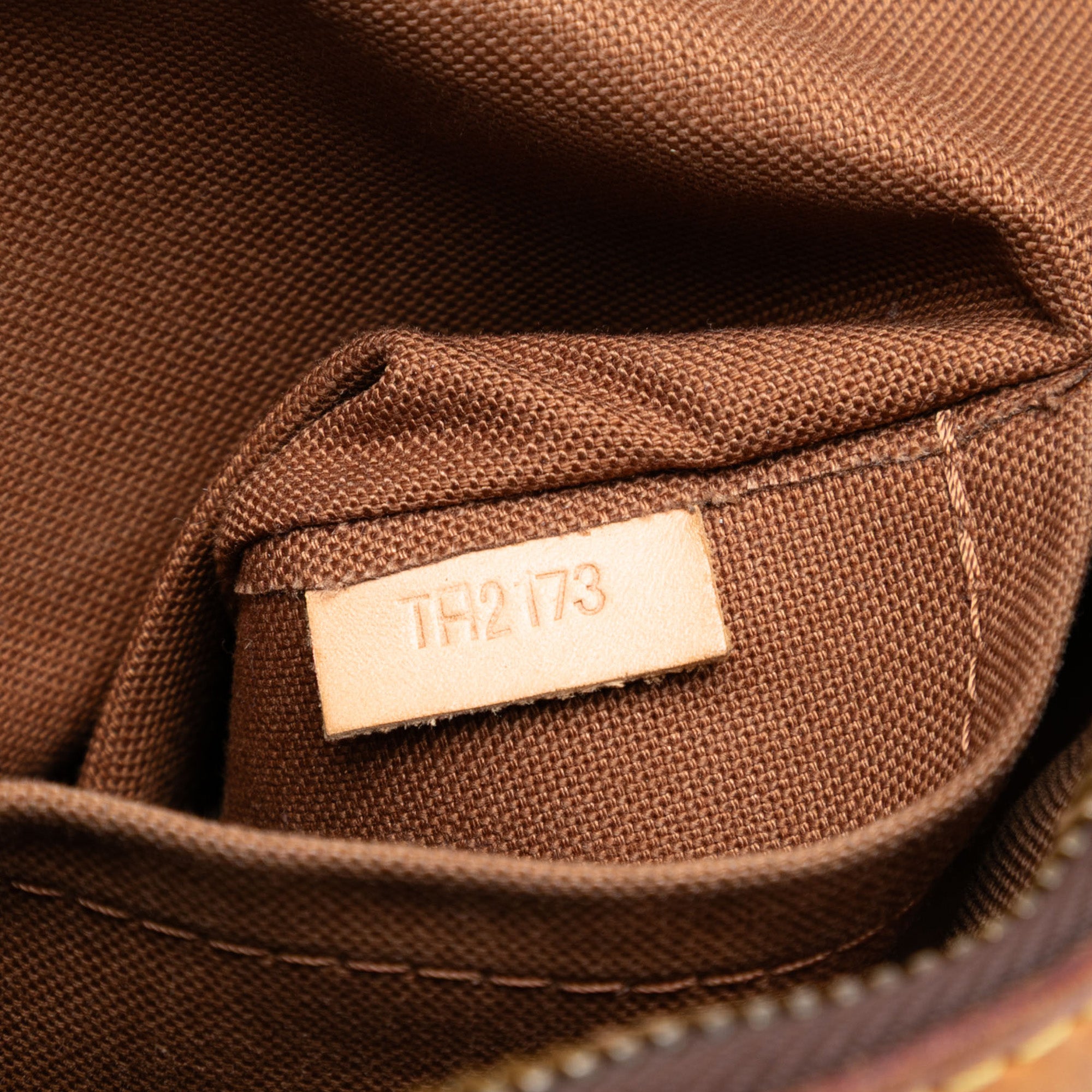 The Palermo PM features a monogram canvas body with vachetta leather trim, flat vachetta leather handles, a detachable flat vachetta leather strap, a top zip closure, and interior slip pockets. Retail Price: 1213.00