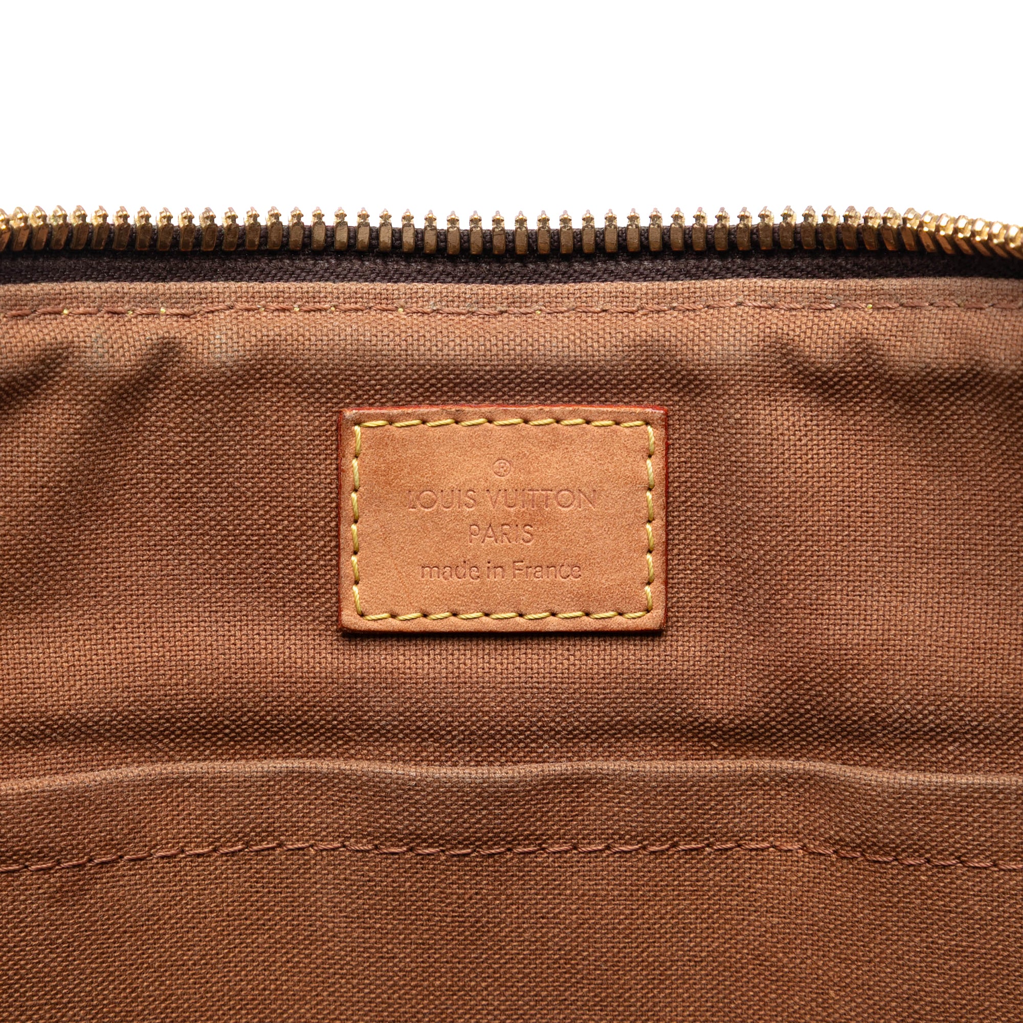 The Palermo PM features a monogram canvas body with vachetta leather trim, flat vachetta leather handles, a top zip closure, and interior slip pockets. Retail Price: 1213.00