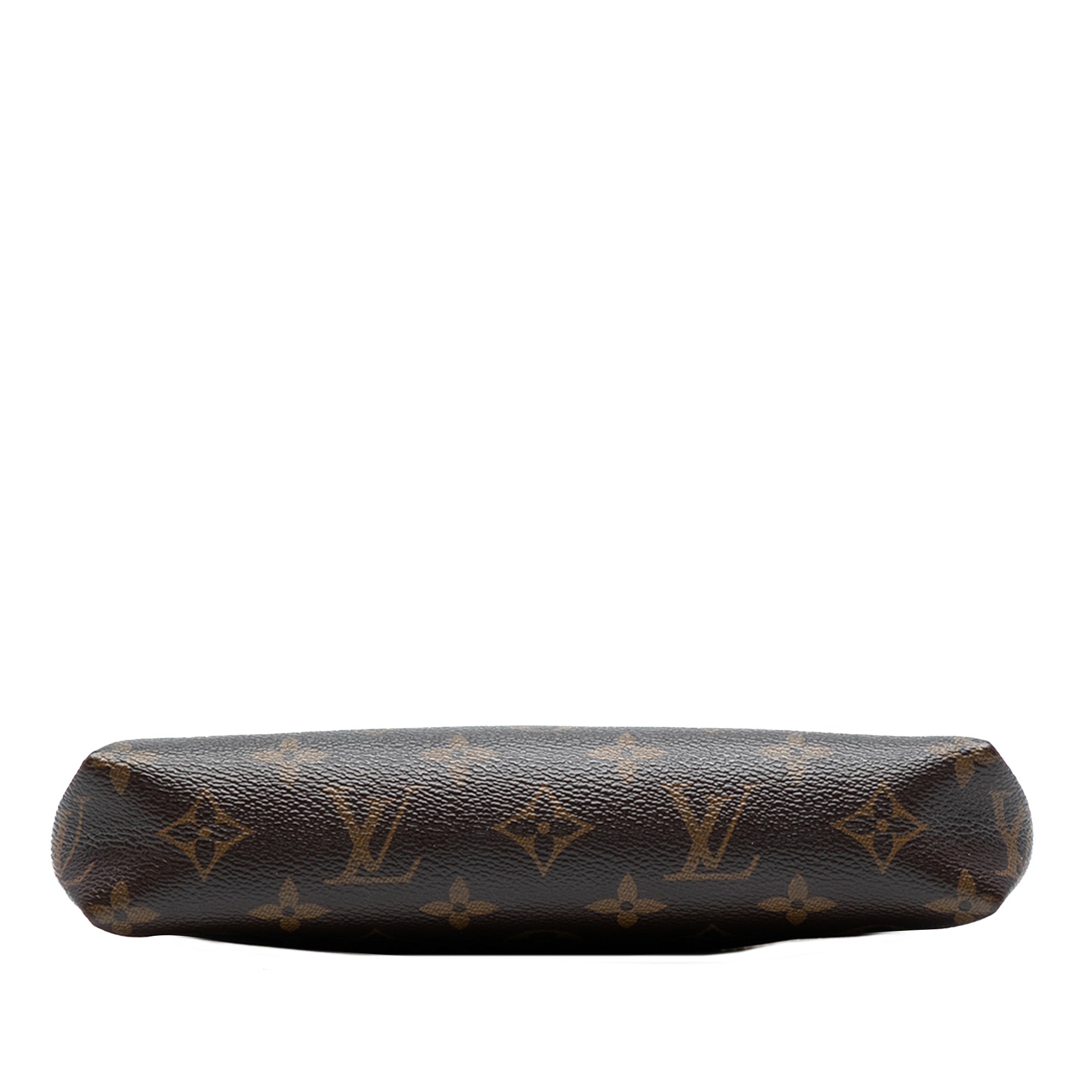 The Pallas Clutch features a monogram canvas body with leather trim, a gold-tone chain link handle, a detachable flat vachetta shoulder strap, a top zip closure, an exterior front slip pocket, and an interior slip pocket. Inclusion: Dust bag. Retail Price: 1558.00