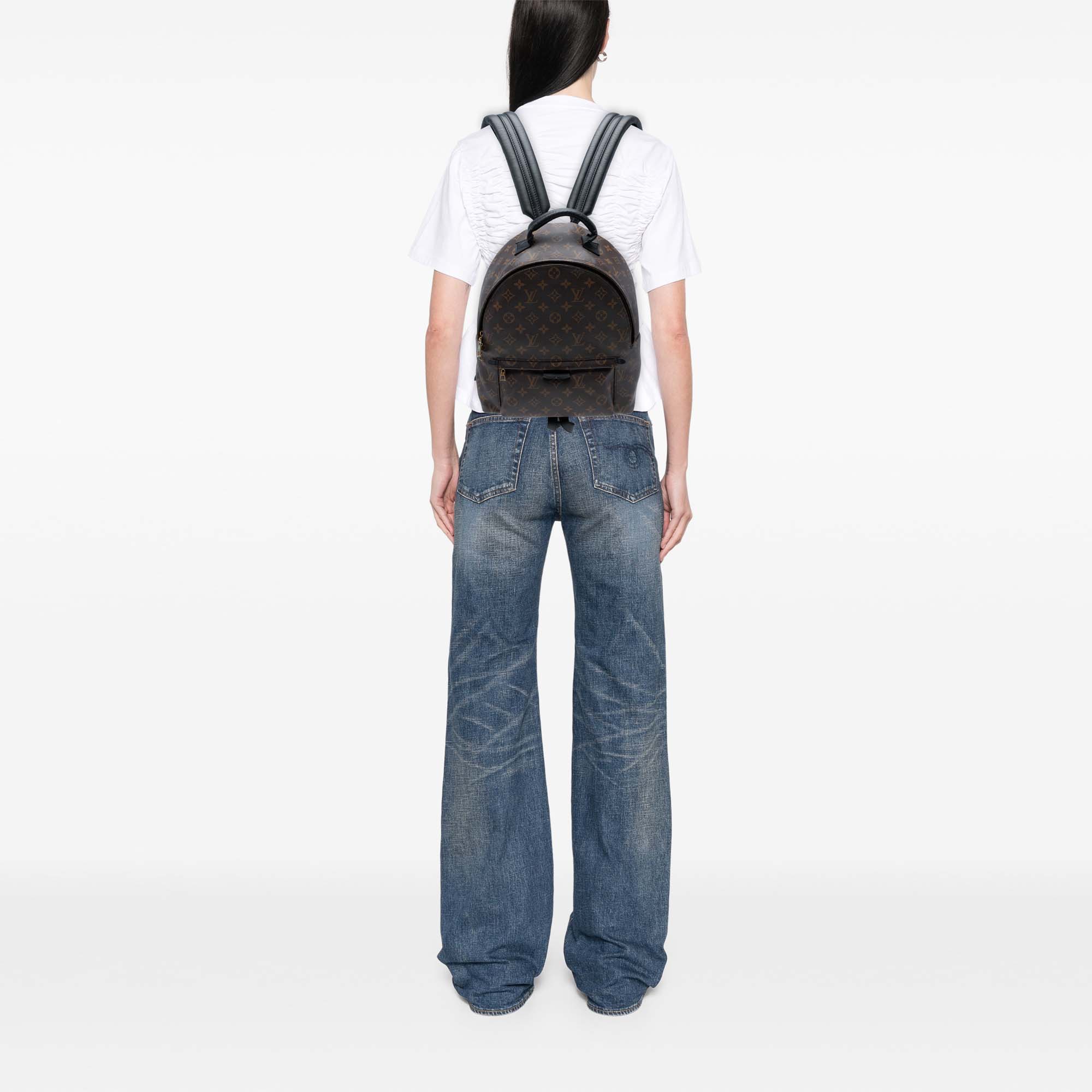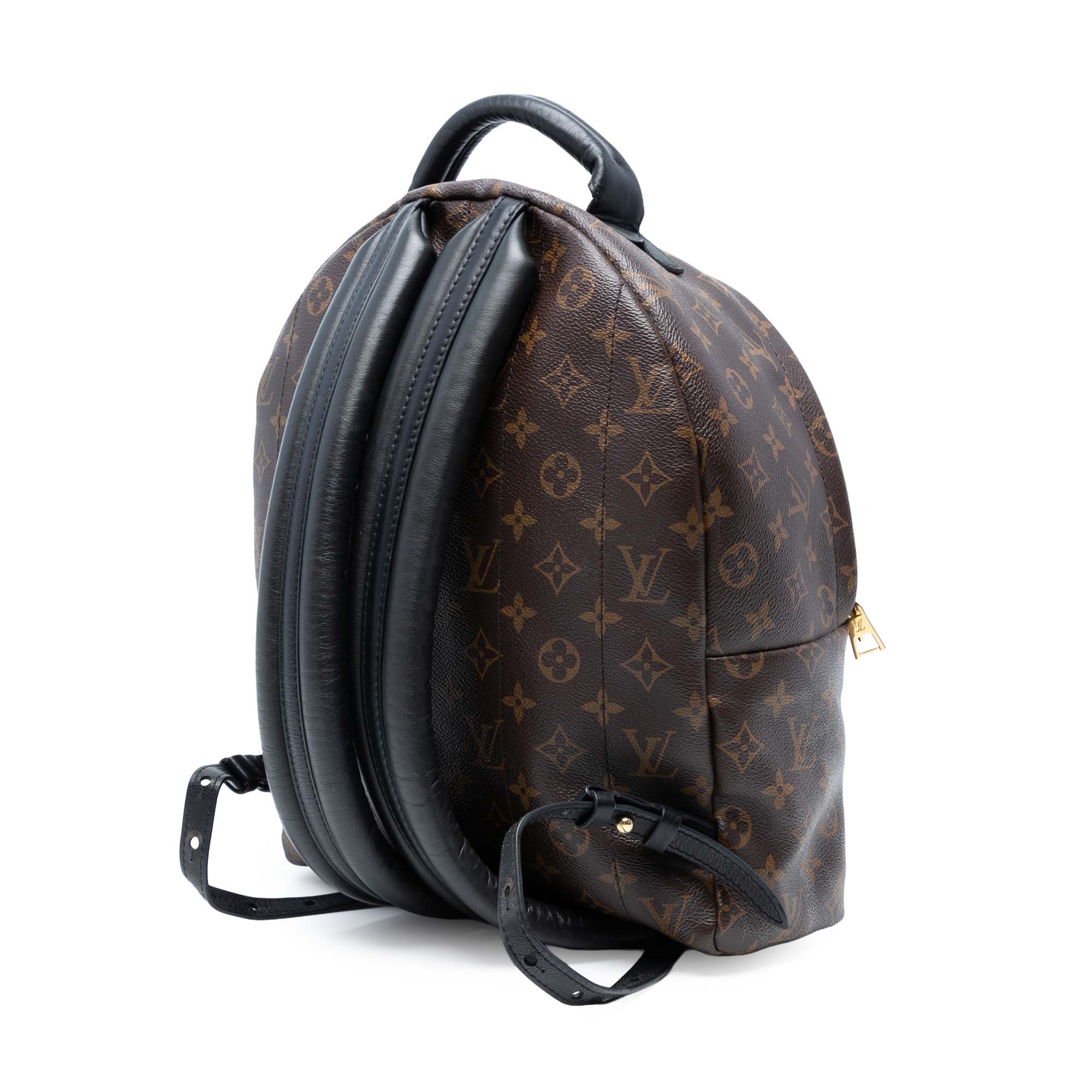 The Palm Springs MM features a monogram canvas body, a flat leather top handle, flat adjustable back straps, a top zip closure, an exterior front zip pocket, and an interior slip pocket. Retail Price: 2570.00