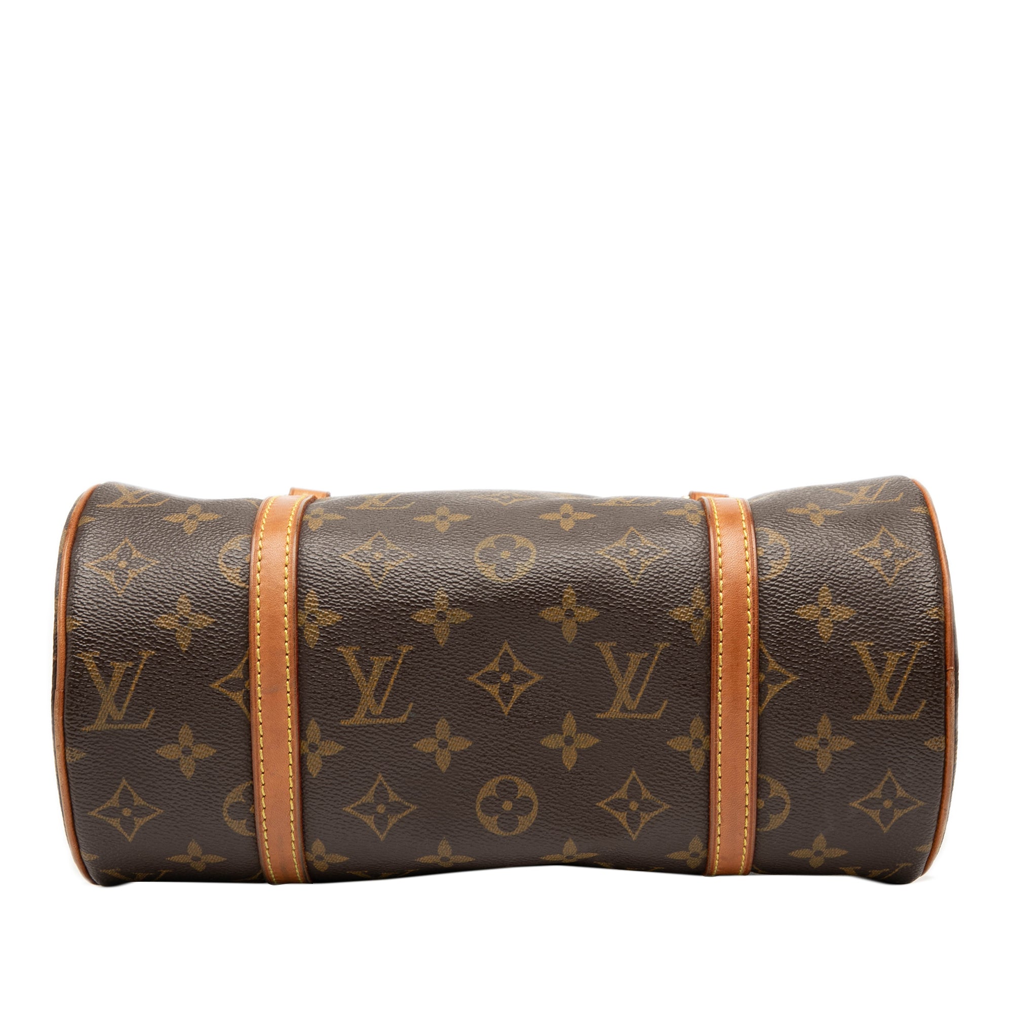 The Papillon 26 features a monogram canvas body, flat vachetta leather handles, and a top zip closure. Retail Price: 1075.00