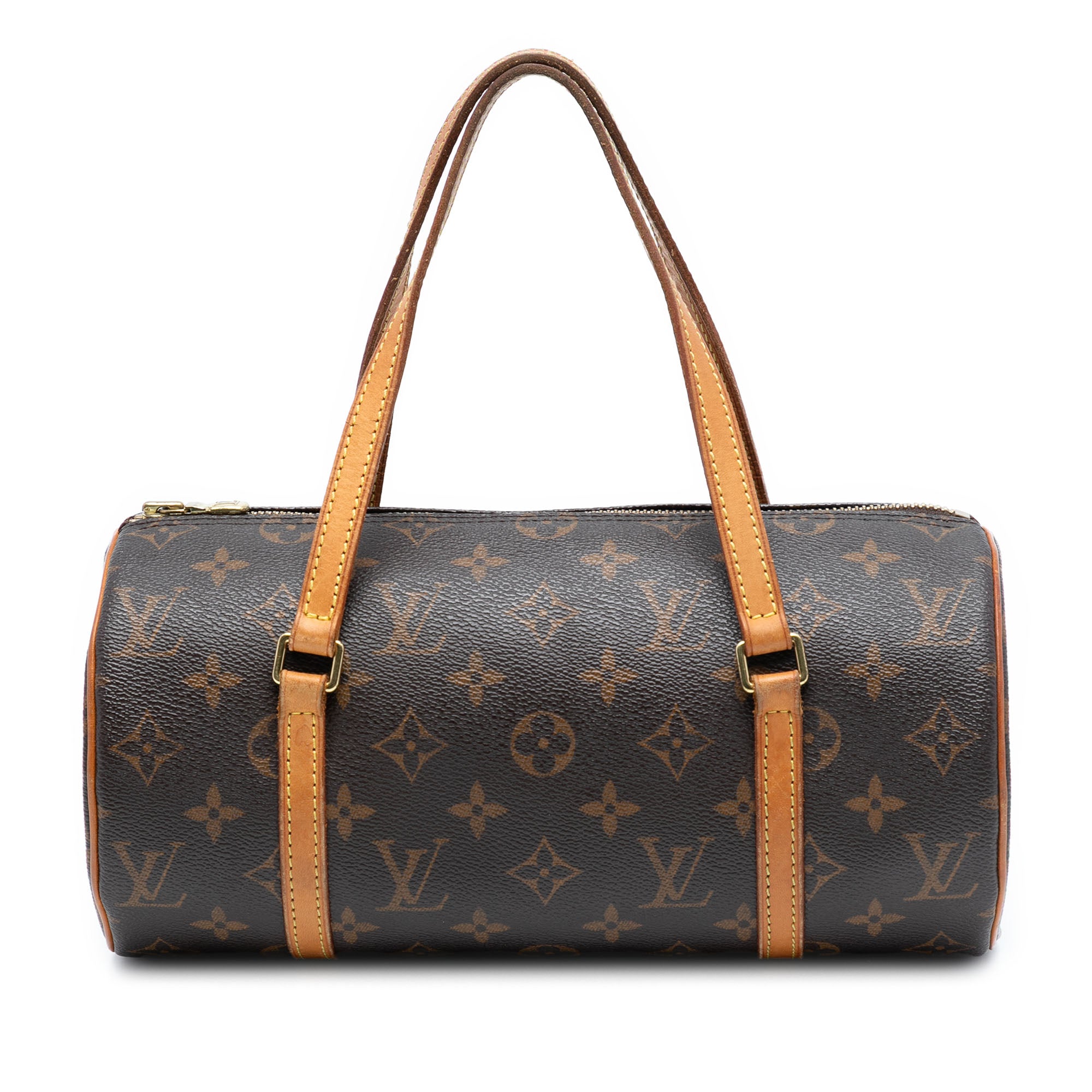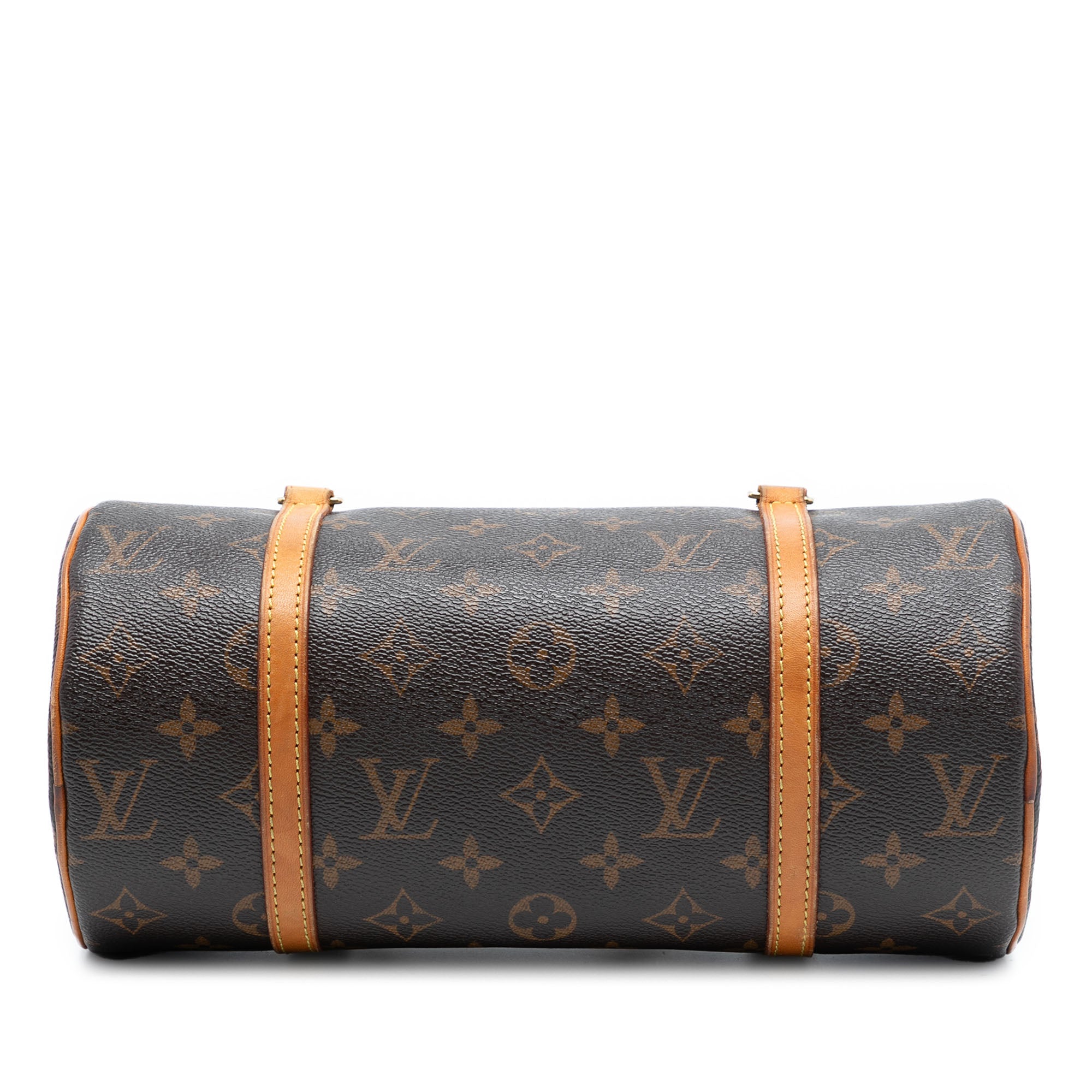 The Papillon 28 features a monogram canvas body with vachetta leather trim, flat vachetta leather handles, and a top zip closure. Retail Price: 1135.00