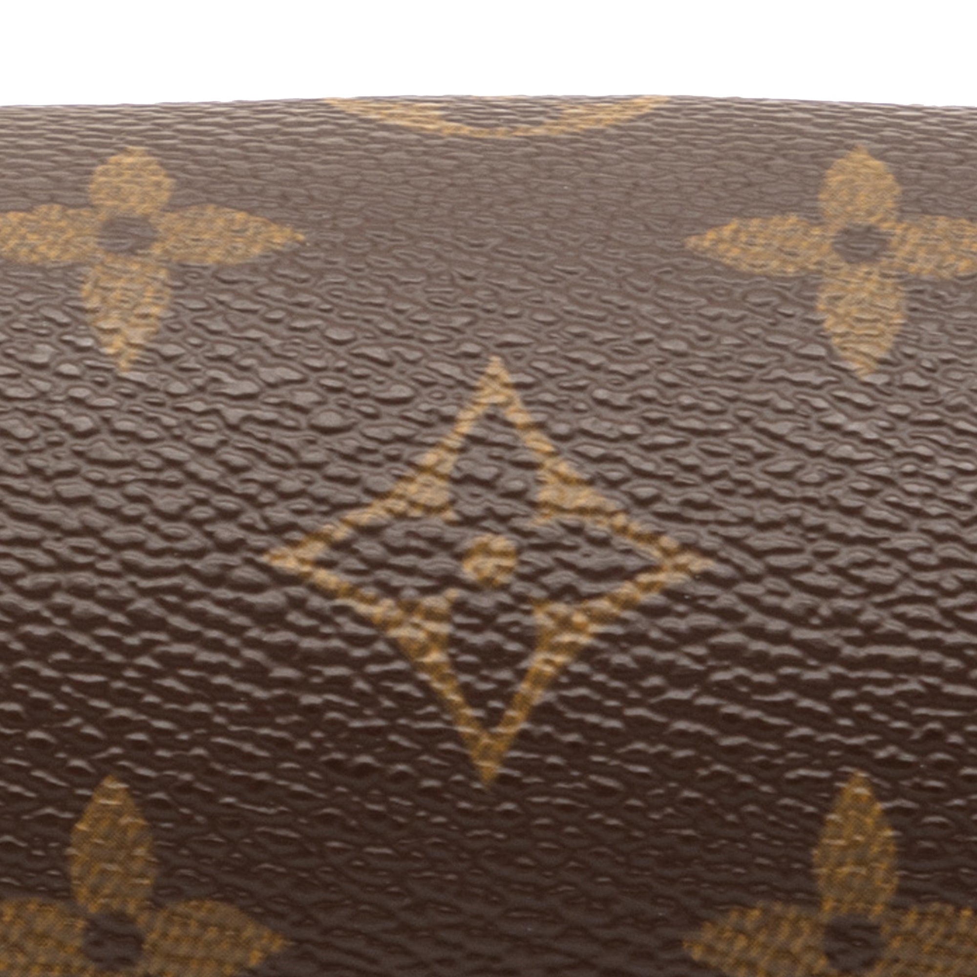 The Papillon Pochette features a monogram canvas body, a flat leather strap, and a top zip closure. Retail Price: 750.00