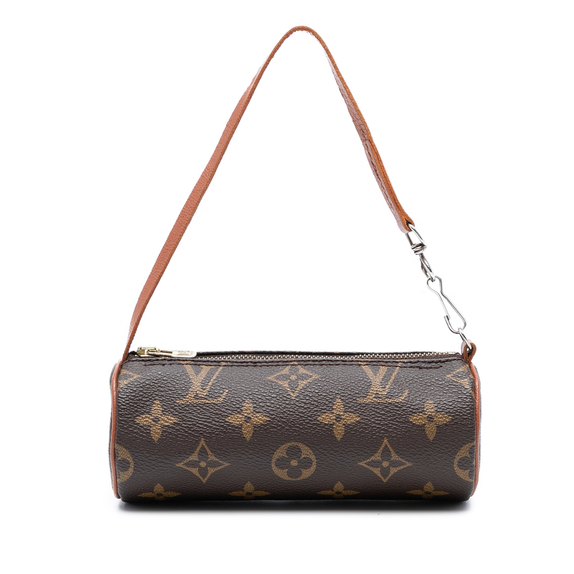 The Papillon Pochette features a monogram canvas body with leather trim, a detachable flat leather strap, and a top zip closure. Retail Price: 750.00