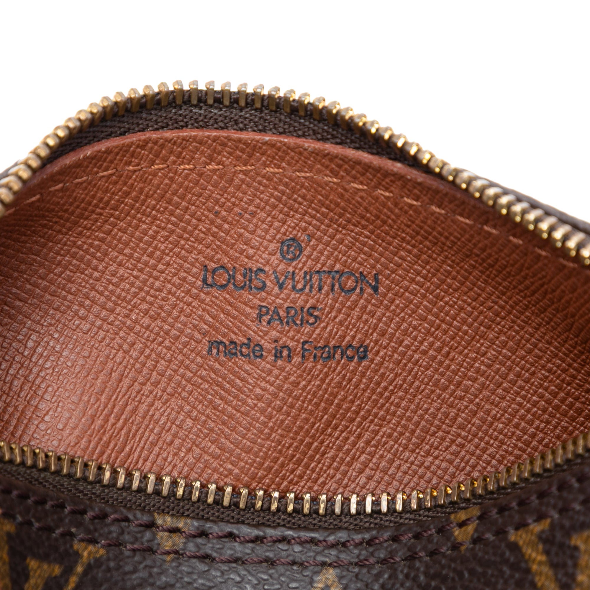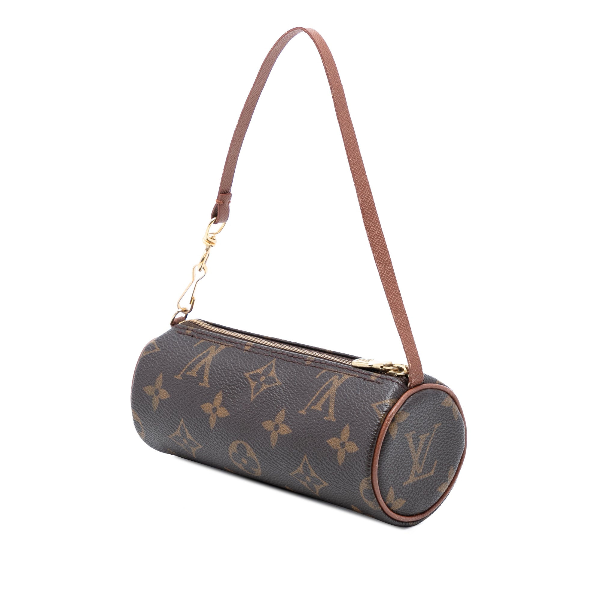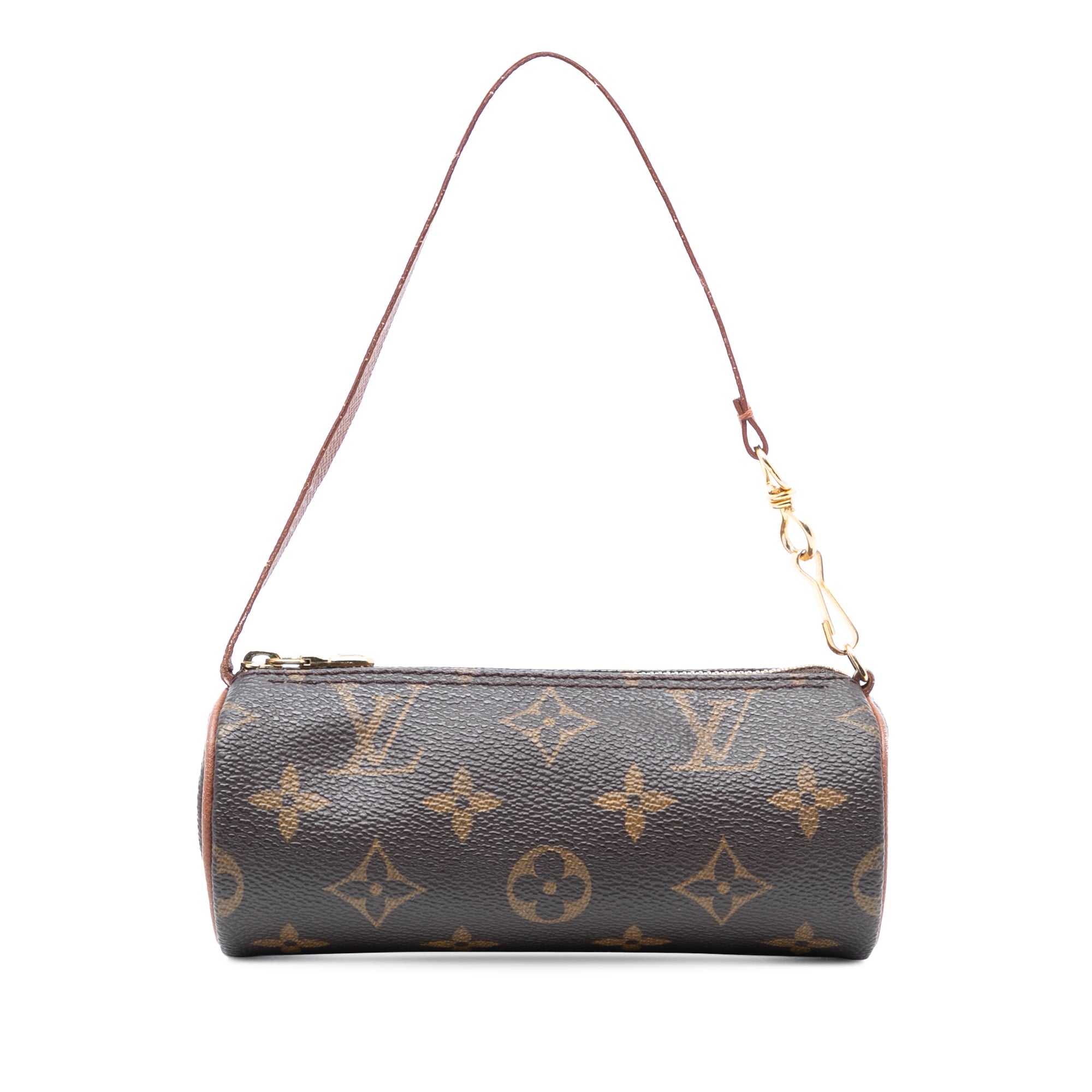 The Papillon Pochette features a monogram canvas body with leather trim, a detachable flat leather strap, and a top zip closure. Retail Price: 750.00