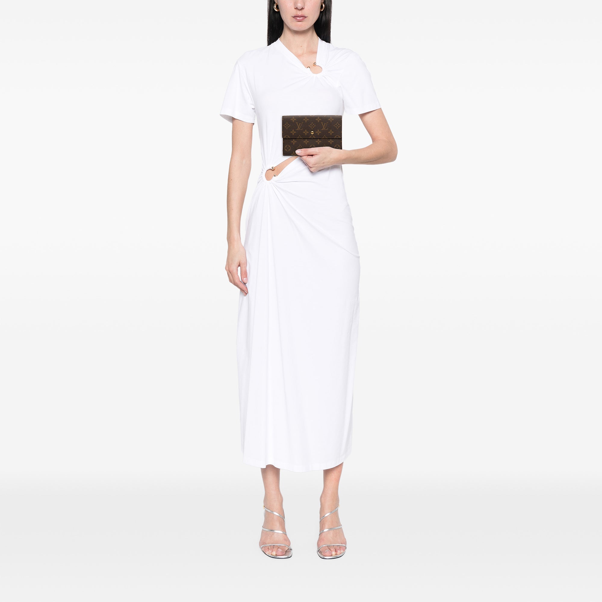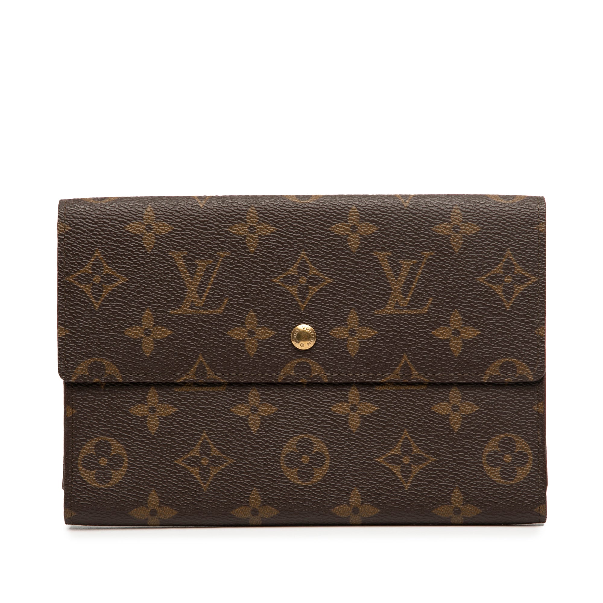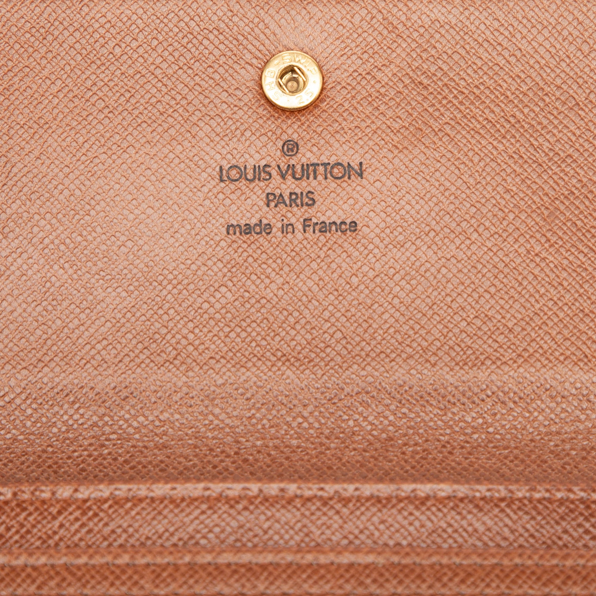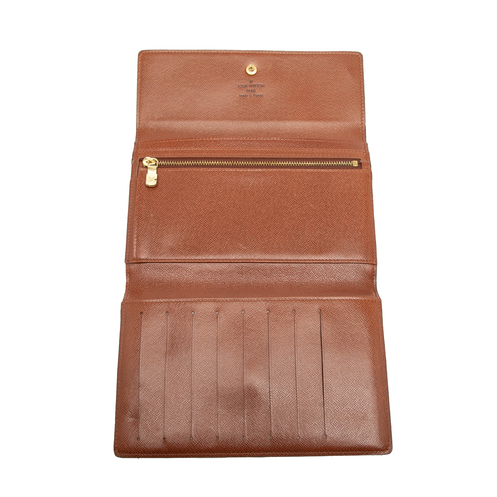 This wallet features a monogram canvas body, a flap with snap closure, and interior zip and slip compartments. Retail Price: 635.00