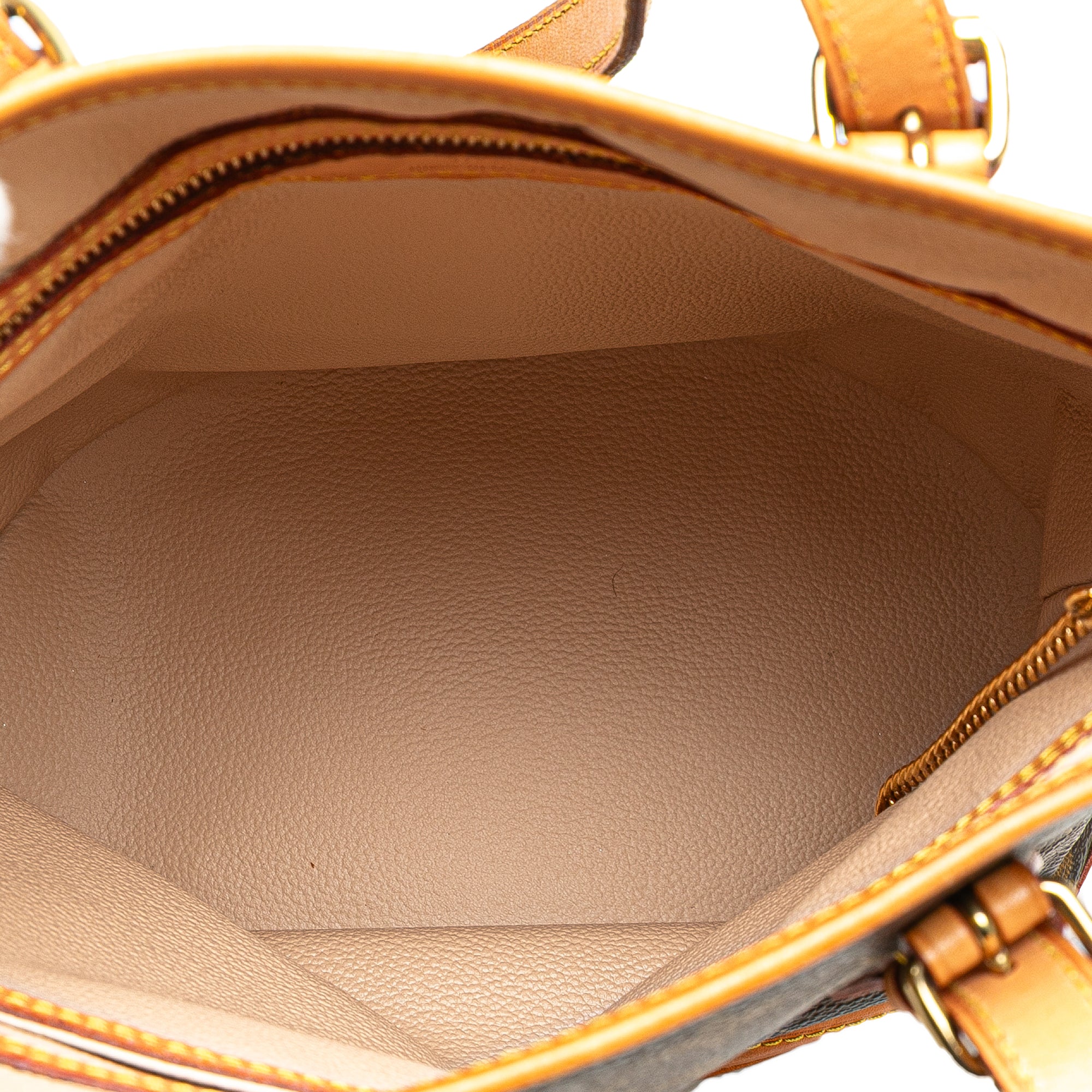 The Petit Bucket features a monogram canvas body with vachetta leather trim, adjustable flat vachetta leather straps, an open top, and interior zip and slip pockets. Retail Price: 845.00