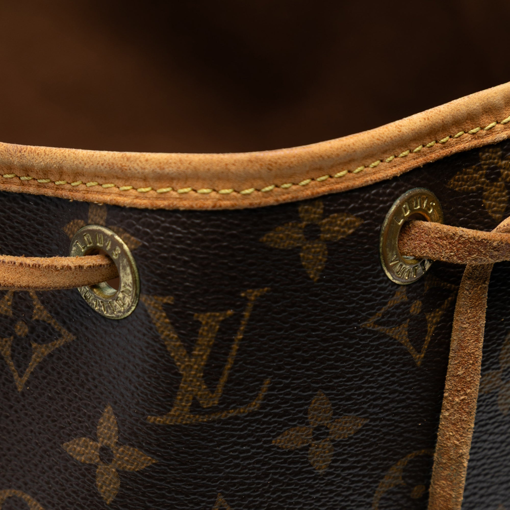 The Petit Noe features a monogram canvas body with vachetta leather trim, an adjustable flat vachetta leather strap, and a top drawstring closure. Retail Price: 1400.00