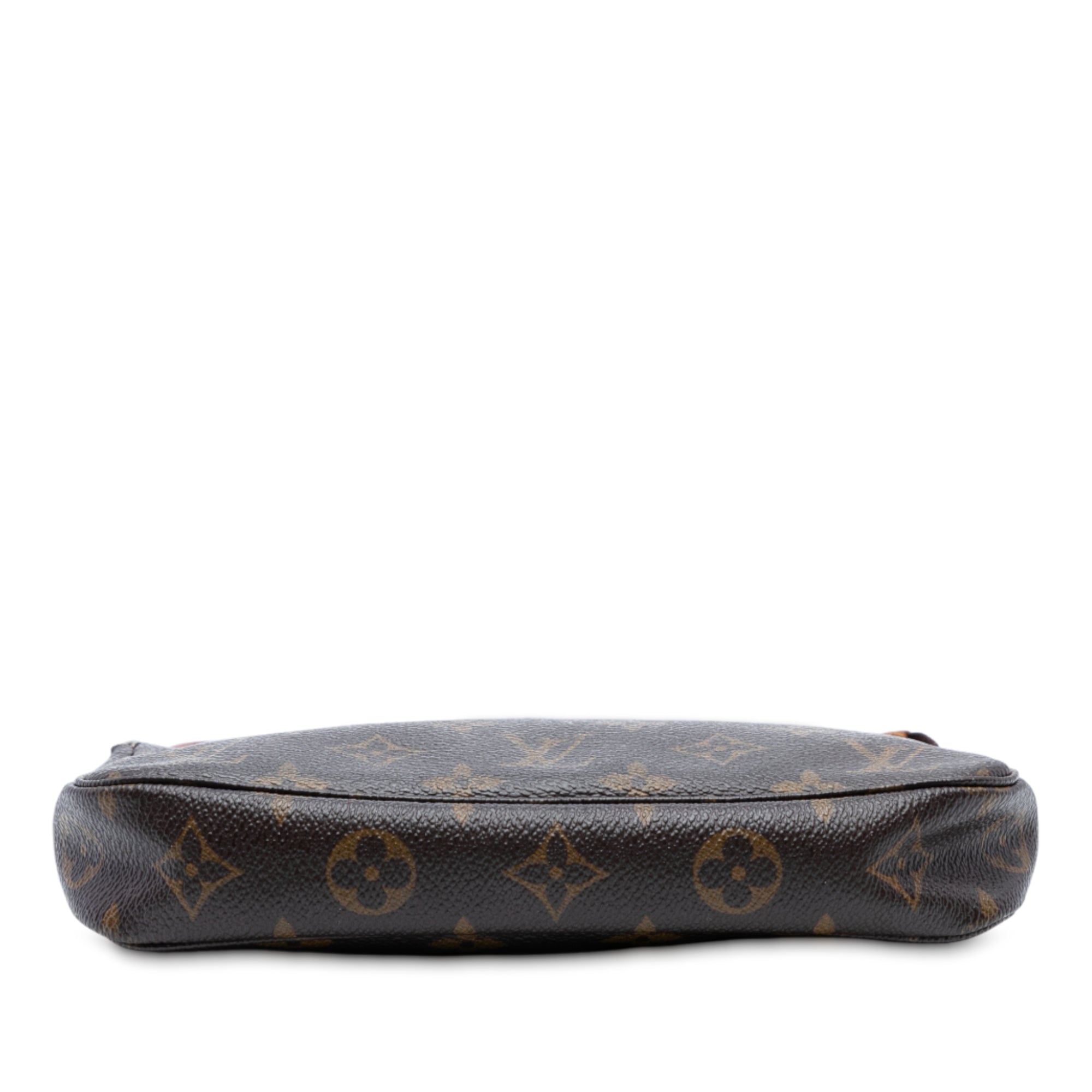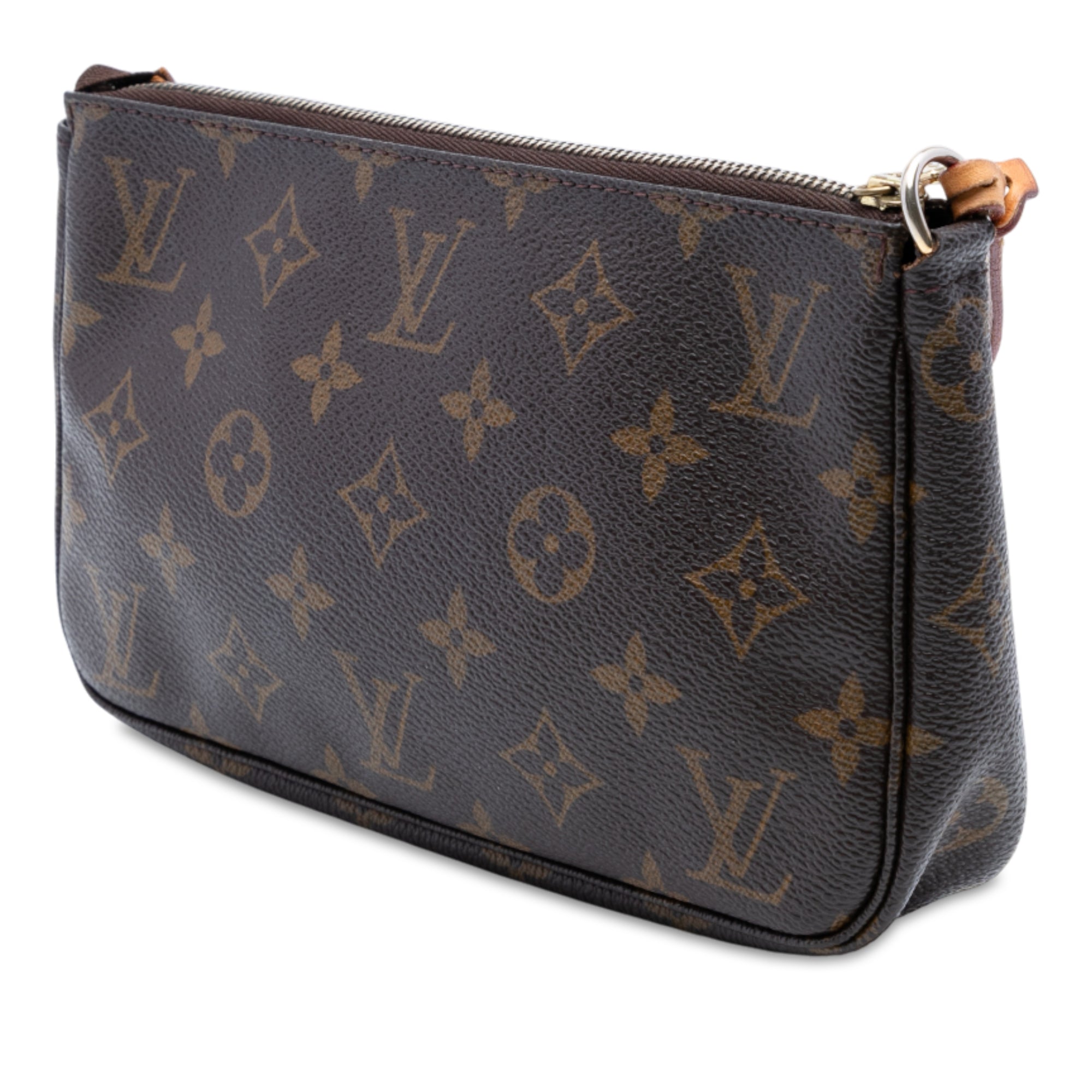 The Pochette Accessoires features a monogram canvas body, a flat vachetta leather handle, and a top zip closure. Retail Price: 1290.00